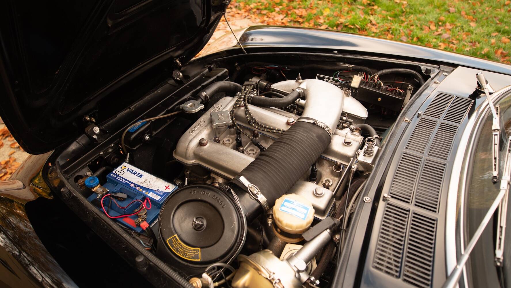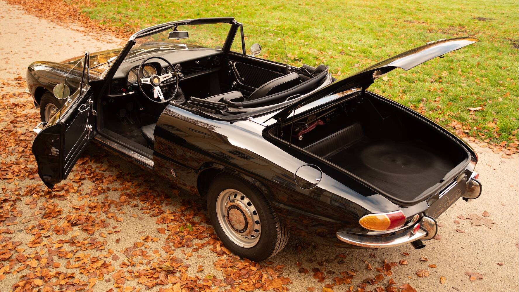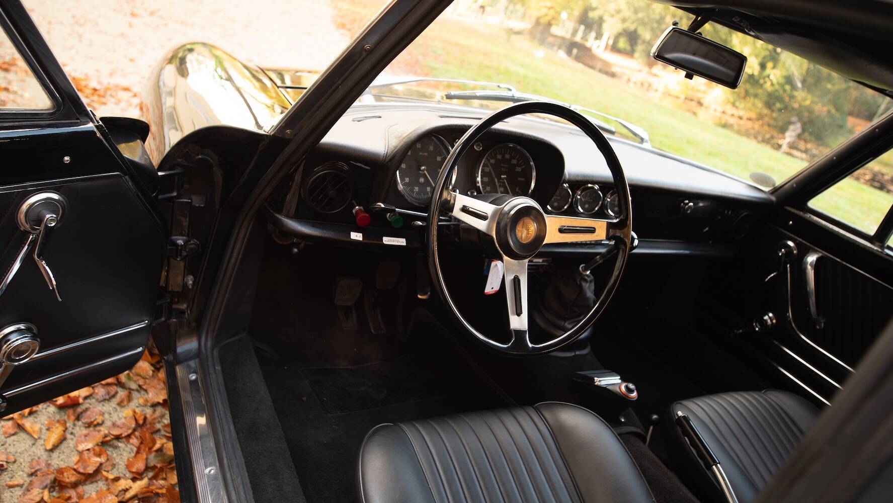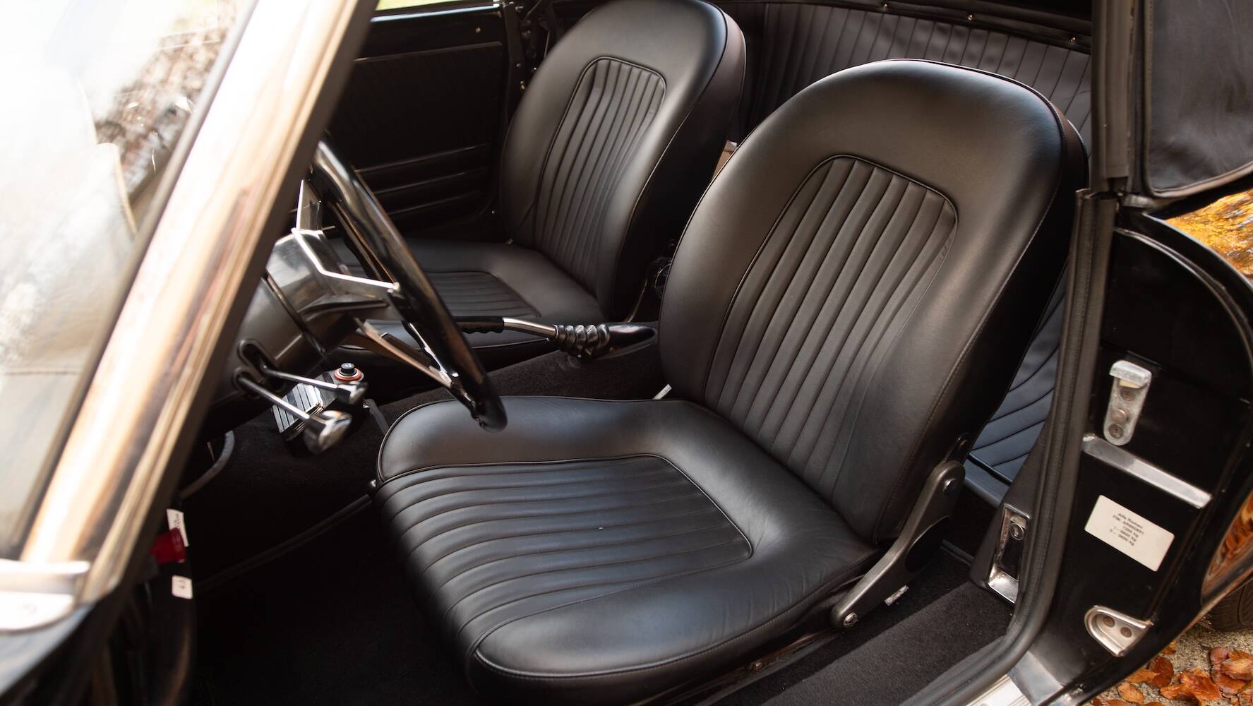 Der Wagen befindet sich in einem hervorragenden Originalzustand, wobei die schwarze Lackierung die ikonischen Linien wunderschön betont. Der Lack weist einige wenige, dem Alter entsprechende Gebrauchsspuren auf, die einem Fahrzeug entsprechen, das nicht überrestauriert wurde, sondern seine Authentizität bewahrt hat. Es ist genau diese Originalität, die dieses Exemplar für Kenner so begehrenswert macht.