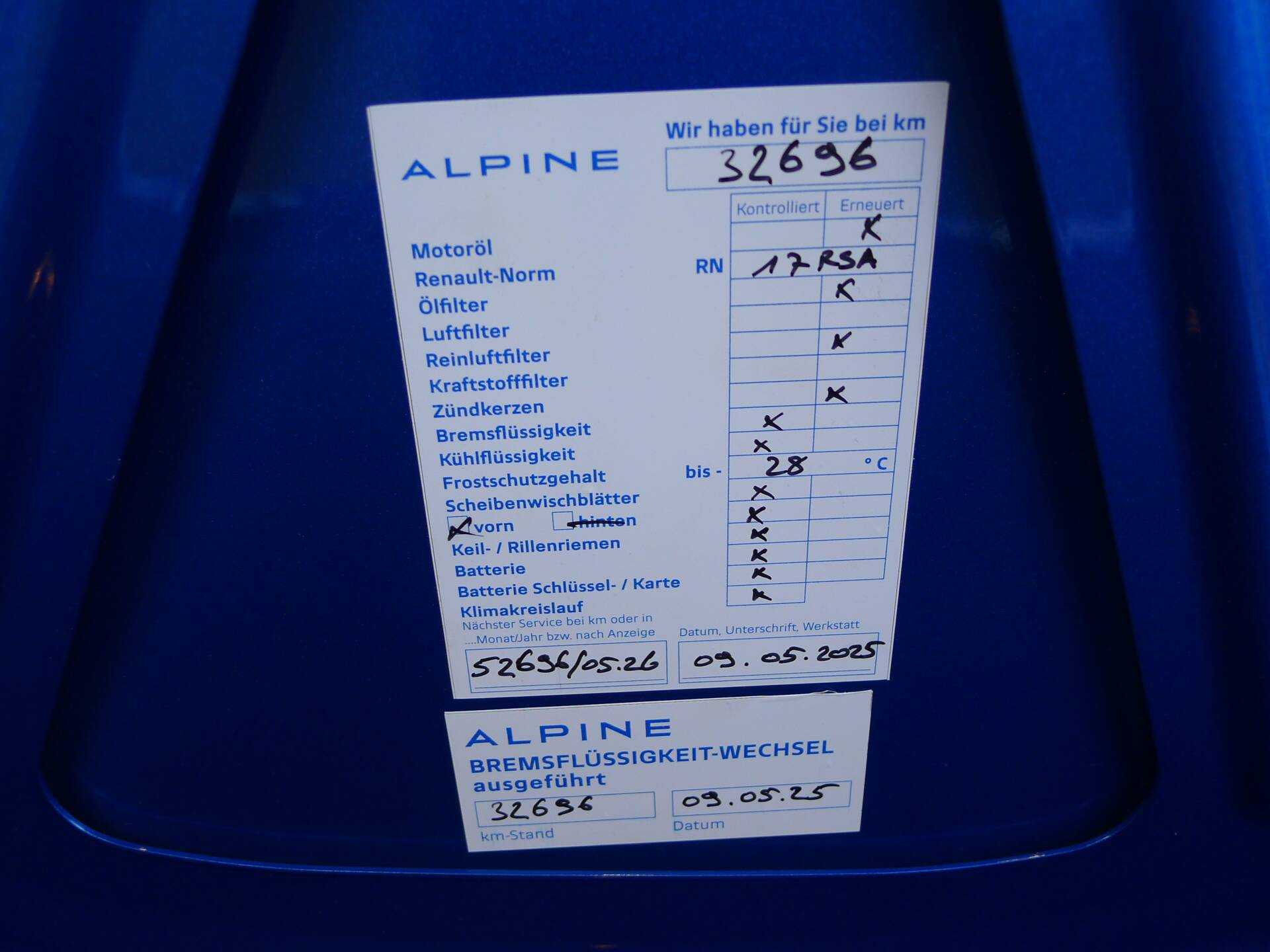 Die A110 kommt mit einem frischen Service aus 05/2025, neuen Reifen sowie allen Gimmicks, die bei der Auslieferung dabei waren ( siehe Bilder ).