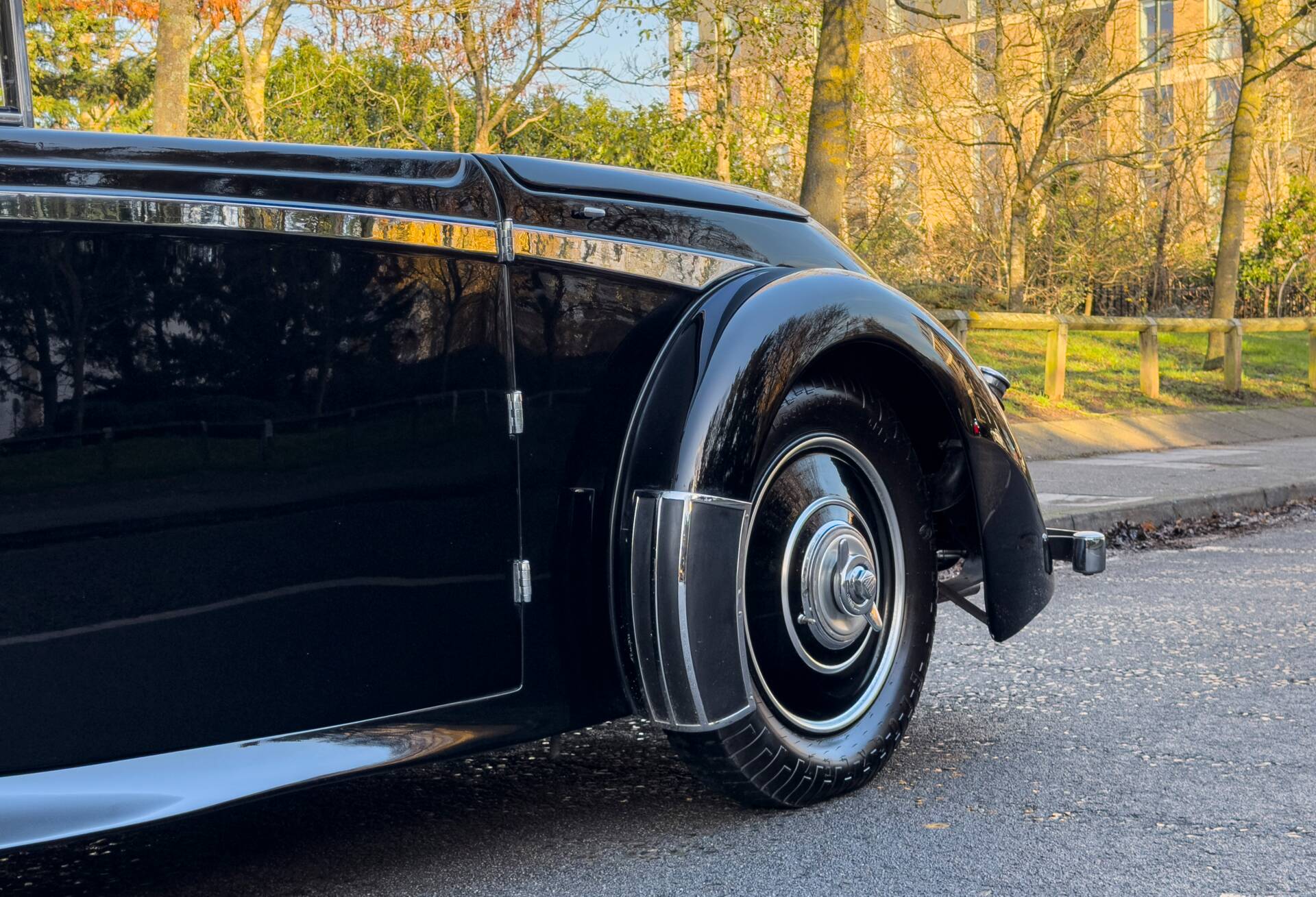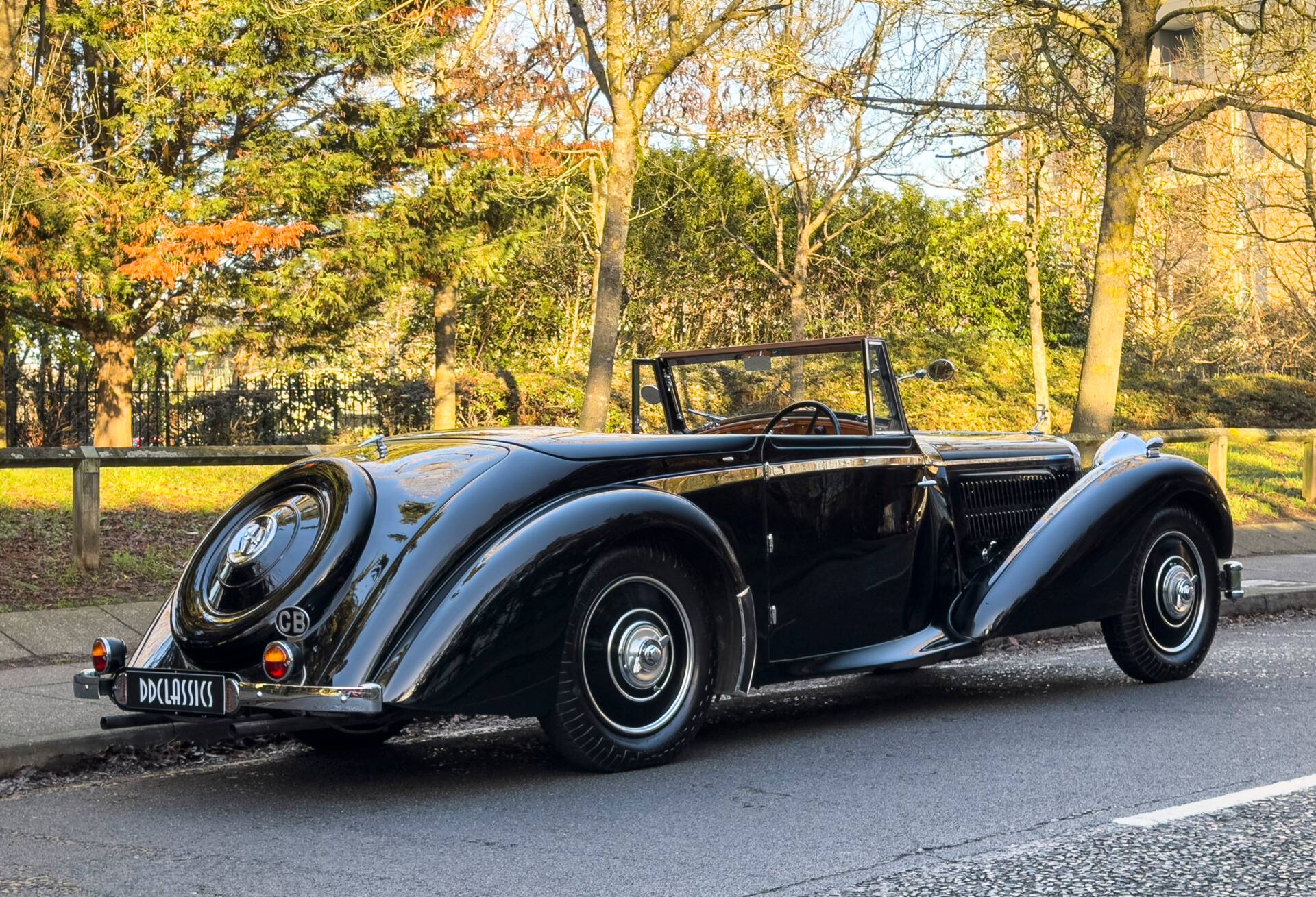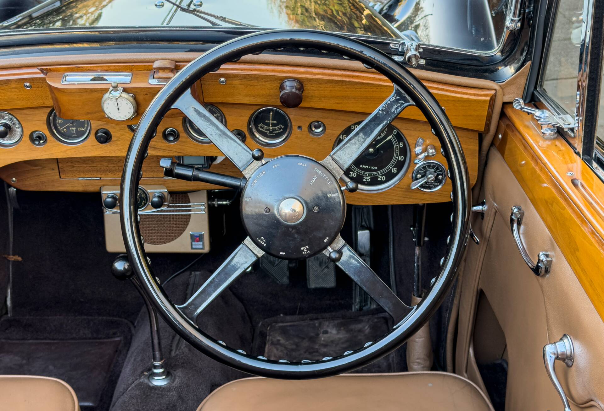 The car carries distinctive drophead coupé coachwork by Whittingham & Mitchel of West London, a firm best known for contract work for major manufacturers but occasionally entrusted with commissions on prestigious chassis such as this. The body is both elegant and purposeful, closely related in theme to the short-chassis Vanden Plas tourer yet unique in execution and almost certainly tailored to the original owner’s specification. Particularly appealing features include the fully concealed hood, clean proportions and the occasional four-seat arrangement, which allows generous luggage accommodation when the rear seats are folded, making the car especially well suited to long-distance touring.