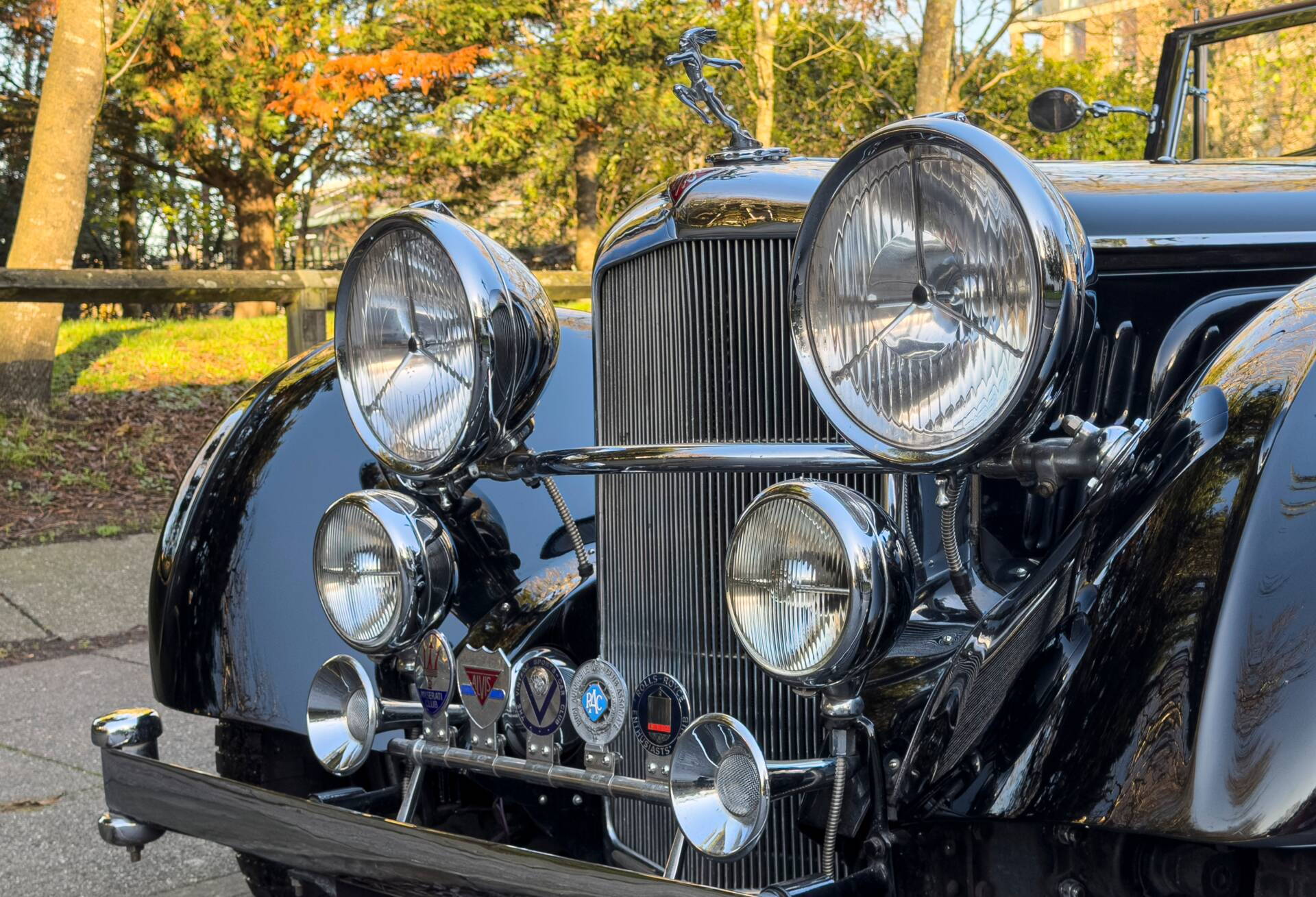 By the late 1930s, Alvis had reached the zenith of its pre-war development, and the 4.3 Litre model stood as the ultimate expression of the marque’s six-cylinder lineage. Introduced under the direction of Captain George Smith-Clarke, the 4.3 Litre was based upon the highly regarded Speed Twenty Five but featured a significantly enlarged seven-bearing overhead-valve engine producing some 137 horsepower on triple carburettors. With independent front suspension, servo-assisted brakes, a four-speed all-synchromesh gearbox and driver-adjustable hydraulic dampers, the chassis embodied the advanced engineering for which Alvis had become renowned. Contemporary road tests placed it among the very fastest un-supercharged touring cars of its era, capable of a genuine 100 mph, while offering refinement and durability to match its performance.
