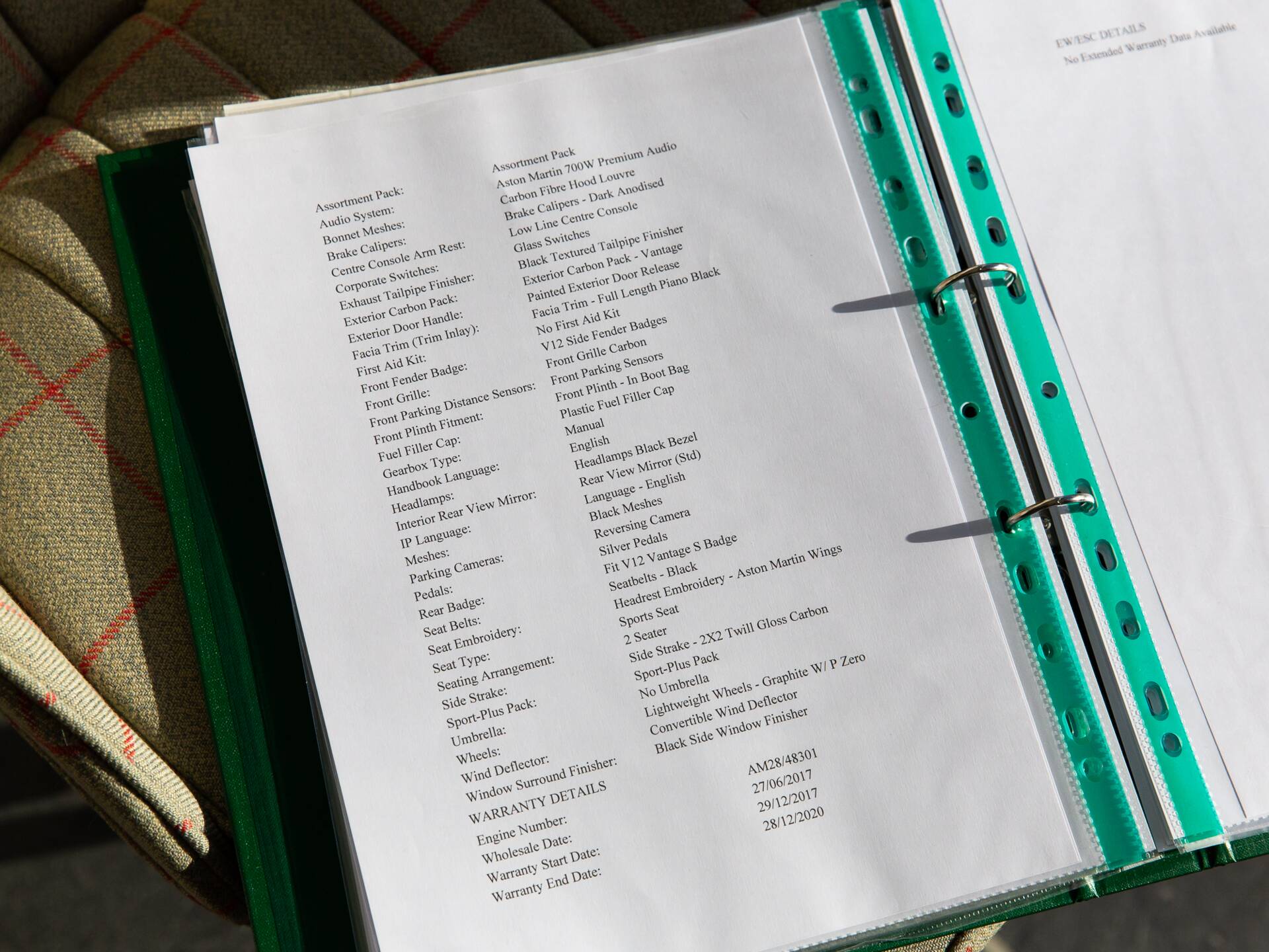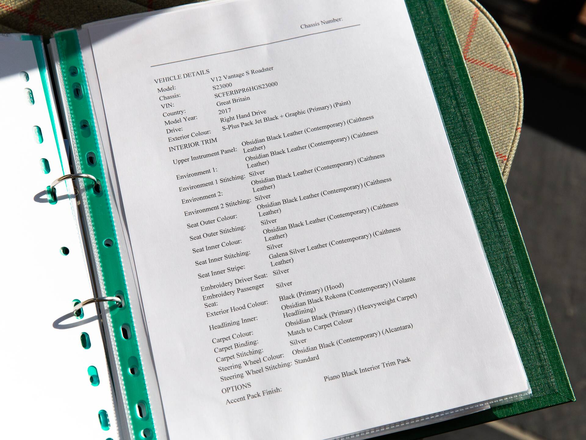 Notable optional extras specified include; Aston Martin 700w Premium Audio, Carbon Fibre hood louvres, Dark Anodised brake calipers, Black textured tailpipe finishers, Exterior Carbon Pack (side strakes and rear light infills), full length Piano Black fascia trim, Front grille Carbon, Black headlamp bezels, Piano Black interior trim pack, Reversing camera and front parking sensors, Sport Seats (which unlike the Carbon Fibre Lightweight Seats have a heating function, useful in the Roadster!) Aston Martin Wings headrest embroidery and Black side window finishers. A full build specification is available on request.
