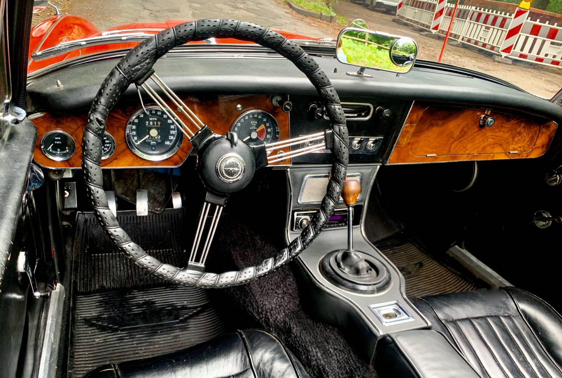 Auch der Innenraum ist original: schwarzes Lederinterieur, Holzarmaturenbrett und Holzsportlenkrad sorgen für den typischen britischen Roadster-Charme. Das Leder zeigt altersbedingt eine ehrliche Patina, die dem Fahrzeug Charakter verleiht. Das Holz ist in einwandfreien Zustand.