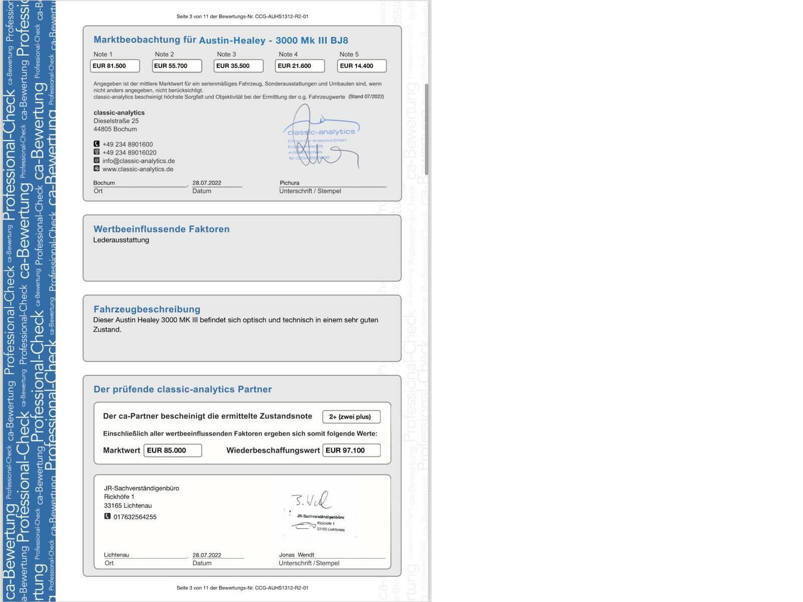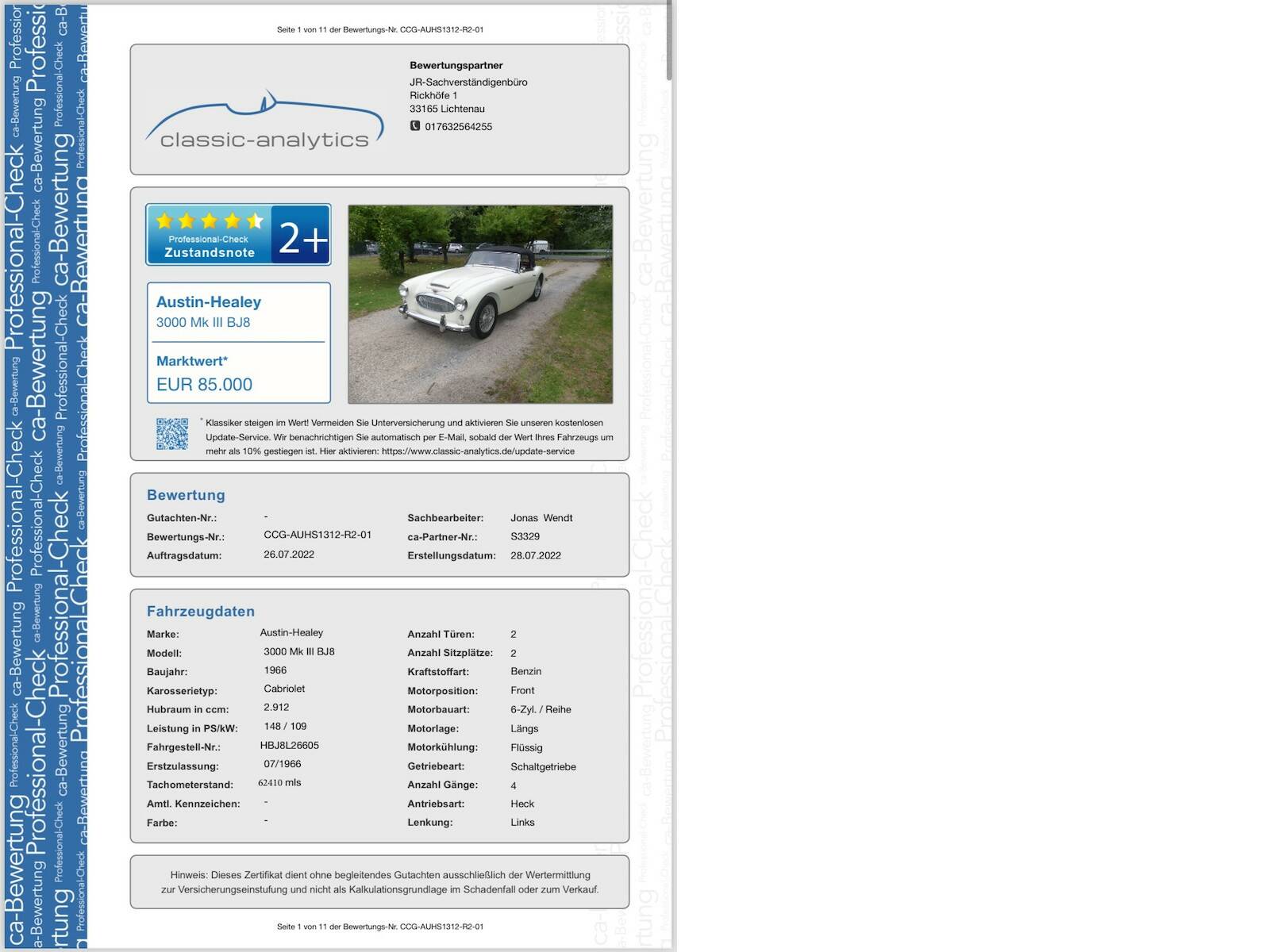 Ein wunderschöner Austin Healey 3000 MKIII als Linkslenker. Der Wagen wurde 2014 aufwendig restauriert und seitdem nur wenige Kilometer bewegt. Die Innenausstattung, der Lack, der Chrom und die Karosserie sind einem sehr guten Zustand. Der Motor läuft hervorragend, eine Kompressionsmessung wird mitgeliefert. Ein Classic-analytics-Wertgutachten liegt vor. Das Fahrzeug wurde mit einer Zustandsnote von 2+ bewertet. Der Marktwert beträgt 85.000,00€, der Wiederbeschaffungswert wurde mit 97.000,00€ beziffert.