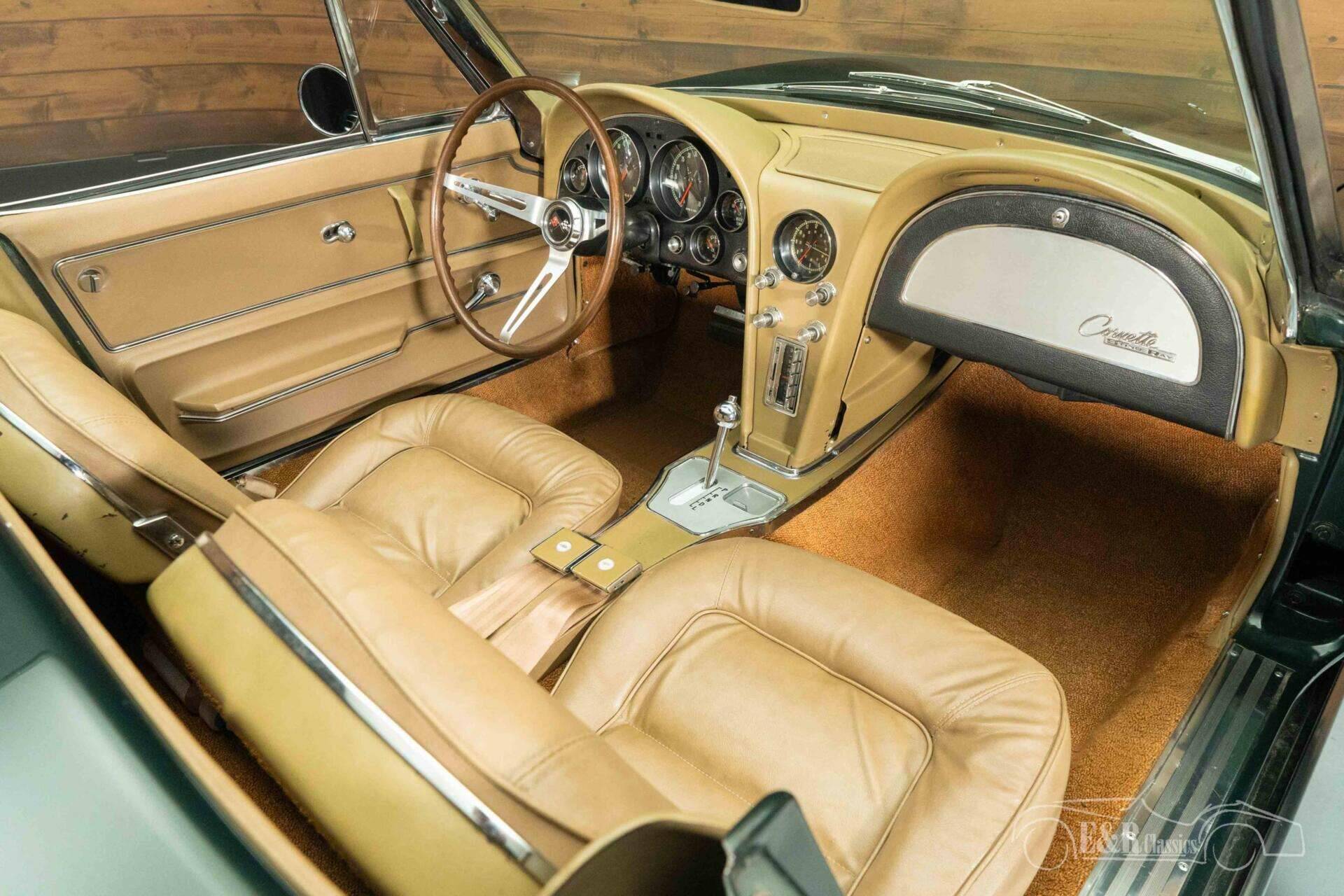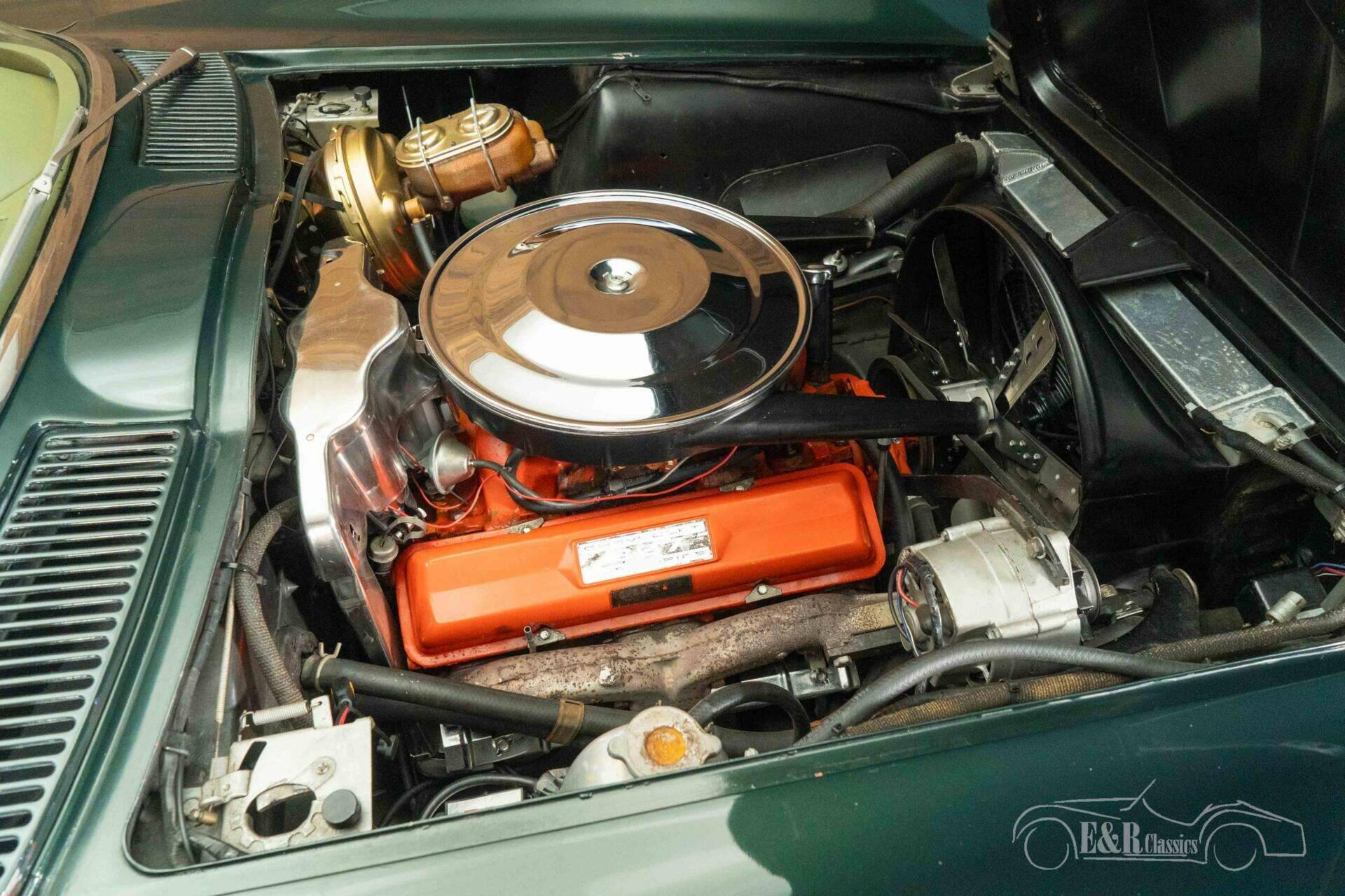 Het exterieur van deze Corvette straalt klasse uit met zijn diepe, donkere Glen Green lakwerk, perfect gecombineerd met een beige softtop en stijlvolle "Knock Off" velgen die het sportieve karakter benadrukken. Het luxe interieur is afgewerkt met beige bekleding, wat prachtig contrasteert met het exterieur en een warm, elegant geheel creëert. Authentieke details zoals de originele Delco AM/FM-radio, het houten stuurwiel en de chromen accenten brengen de jaren 60 tot leven, terwijl het dashboard en de vloerbedekking in bijpassende tinten de harmonie van het interieur versterken.