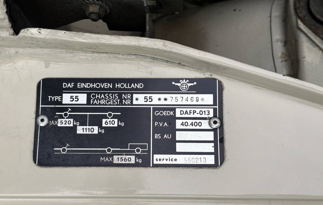 De Daf is ook de laatste jaren keurig onderhouden en de volgende zaken zijn vernieuwd: de accu, de uitlaat (origineel Daf) en een deel van de achtervering. De Variomatic riemen zijn pas 1.100 km oud en de schijfremmen aan de voorzijde zijn zojuist vervangen. Er zijn diverse TUV rapporten aanwezig en het originele kenteken. Er is recent een trekhaak gemonteerd en dat is zeldzaam. De montage is ingeschreven in de Fahrzeugbrief. De verwarming doet het niet en de Daf heeft stuurspeling.