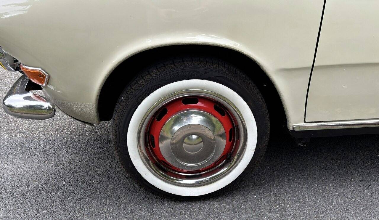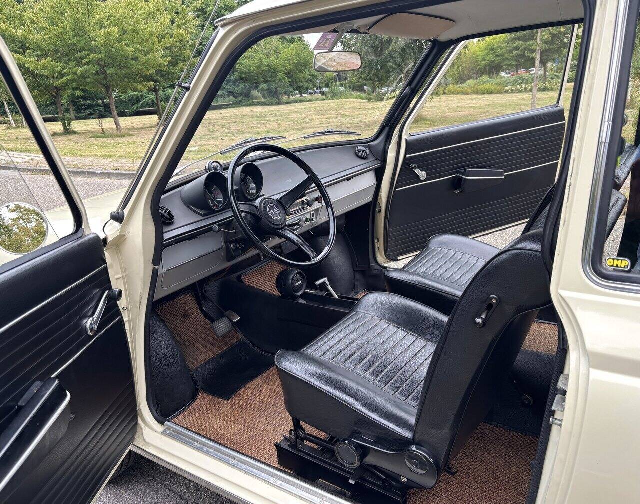 Het interieur is helemaal origineel en een echte tijdcapsule. De stoelen hebben de originele bekleding en de bestuurdersstoel heeft slaapbeslag. De zwarte bekleding ziet er uit als nieuw, want er hebben jarenlang hoezen overheen gezeten. De Blaupunt Frankfurt radio doet het prima en ook de instrumenten werken zoals het hoort. De ruitensproeier heeft een elektrisch pompje en het hemeltje hangt strak. De originele rubber vloerbedekking is helemaal heel en voorzien van mooie stevige matten.