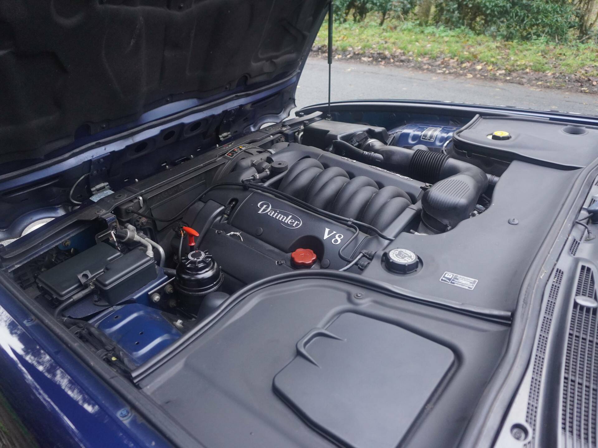 The Daimler comes into stock with us as part exchange from its 4th owner of 9 years whom, when buying the Daimler was on the lookout for a superbly maintained luxury saloon. W351 VLB certainly fits that brief with its lovely spec, comprehensive file of maintenance receipts, and lovely mileage of 83500. Routine servicing has been carried out at 10349, 18929, 25861, 33341, 40672, 46086, 51029, 54901, 56187, 57128, 57905, 58409, 58661, 59595, 60476, 61659, 65419, 67830, 71301, 74509, 75335, 76587, 78006, 79622, and 82313 miles. 2013 saw the first major mechanical expenditure in having the timing chain tensioners renewed at a Jaguar Specialist when the car had covered around 59,000 miles. Later, in 2018, a Gearbox specialist replaced the ZF gearbox unit.