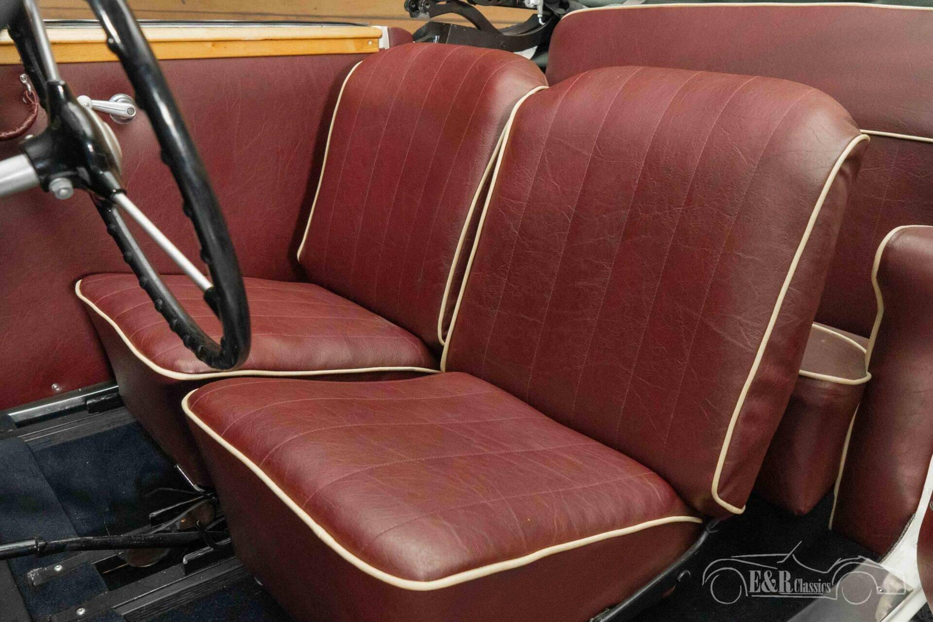 Qua uitstraling ademt deze Cabriolet pure stijl en authenticiteit. Het carrosserie is uitgevoerd in klassiek wit met een verfijnd lijnenspel en een contrasterende bordeaux rood interieur, wat samen met de zwarte soft top zorgt voor een luxueuze en warme uitstraling. De rode accenten in de grille en velgen versterken het karakteristieke voorkomen en geven de auto een unieke charme. Binnenin is de combinatie van het bordeaux leer met de klassieke instrumenten een sfeervolle verwijzing naar het luxegevoel van de jaren ’30. Een DKW F8 Cabriolet in deze conditie is een ware blikvanger voor elke collectie.