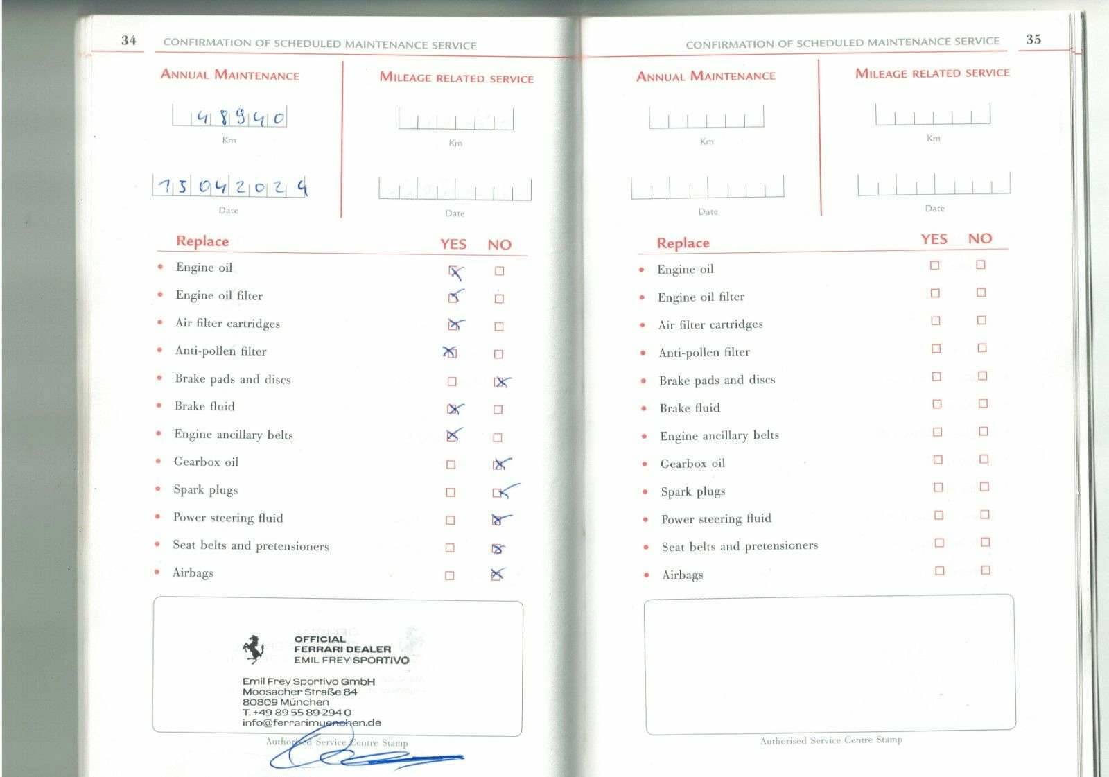 letzter Service bei Ferrari München in 04.2024 bei 48940km