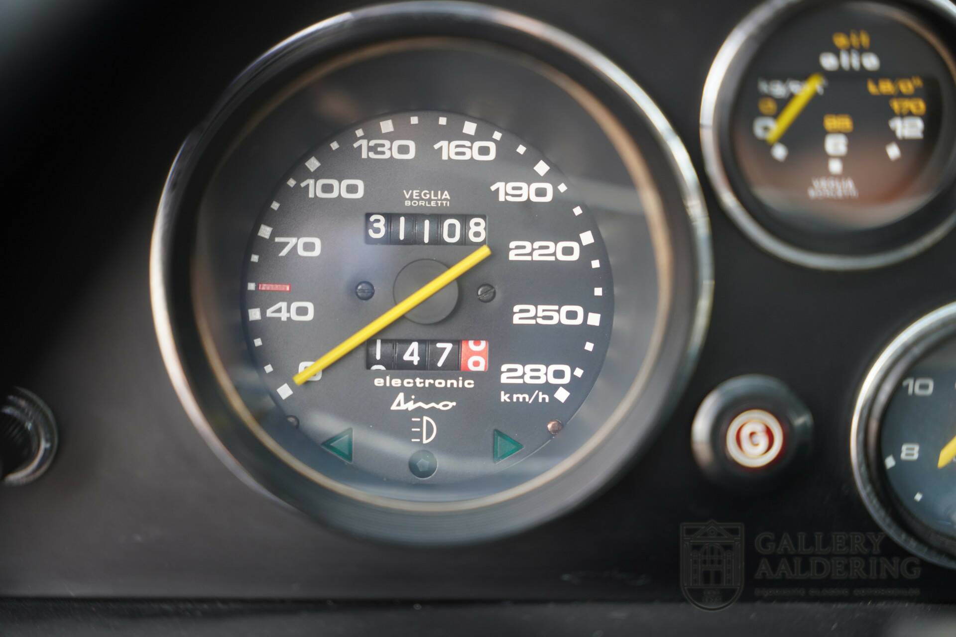 Die Karosserie des Dino hat eine schöne Lackierung, der Lack hat einen schönen tiefen Glanz und wenig bis gar keinen Gebrauchsspuren. Die Türen schließen sauber und die Passungen sind alle korrekt. Die Karosserienähte sind auch alle schön und gerade. Die Chromteile befinden sich in ausgezeichnetem Zustand und das Gleiche gilt auch für die schönen Leichtmetallfelgen, die keine Schäden aufweisen. Ein Blick ins Innere sorgt nicht für unangenehme Überraschungen. Die Polsterung ist weitgehend original und in gutem Zustand, wobei die blauen Mittelteile der Sitze passend zum originalen blauen Bodenbelag sind. Ein Look, der perfekt zu den 1970er-Jahren passt. Die Sitze sehen gut aus und bieten gutes Sitzkomfort. Das Armaturenbrett ist voll funktionsfähig und auch sehr schön mit einer großen Anzahl von Zählern und Instrumenten. Auch die Bedienelemente funktionieren einwandfrei, wobei ein großer Teil auf dem Armaturenbrett untergebracht ist und ein Teil, weil es nicht mehr Platz gab, auf dem Mitteltunnel. Dort befindet sich auch die original ab Werk gelieferte Borletti-Klimaanlage.