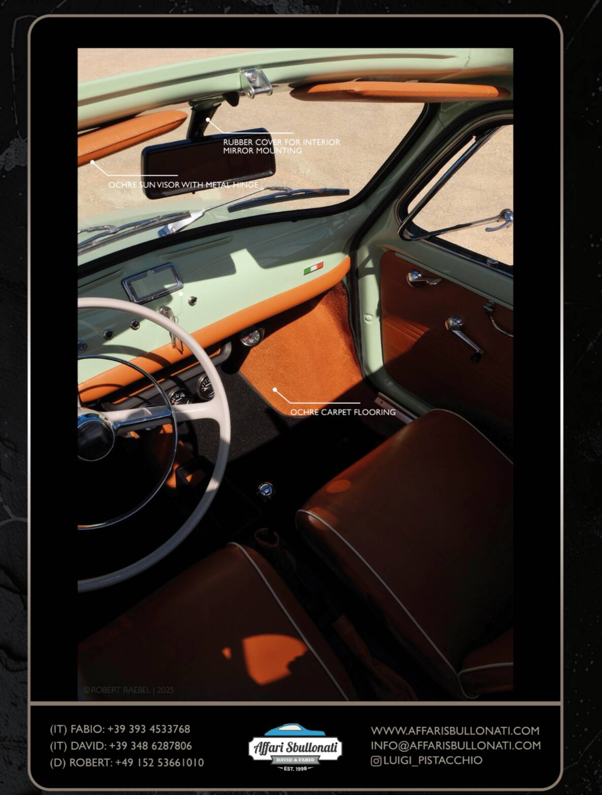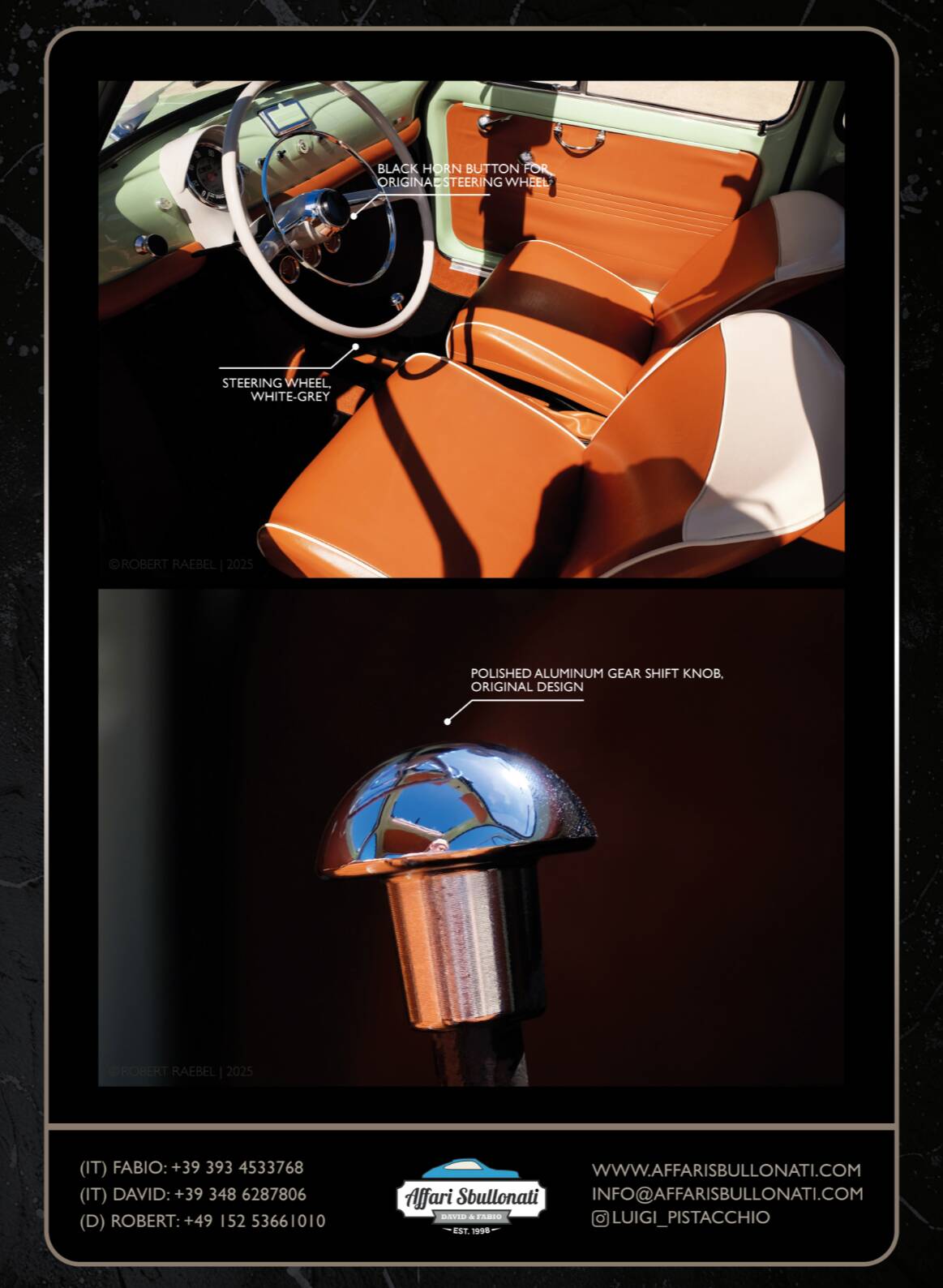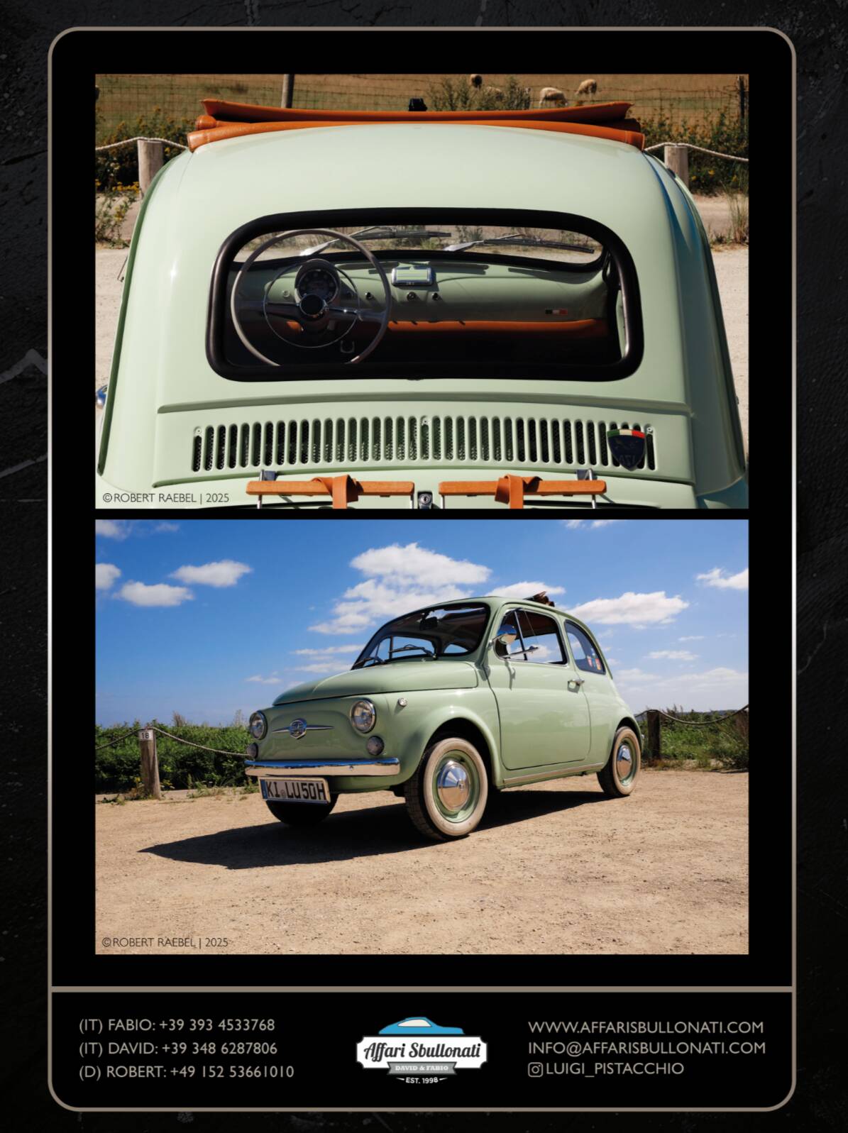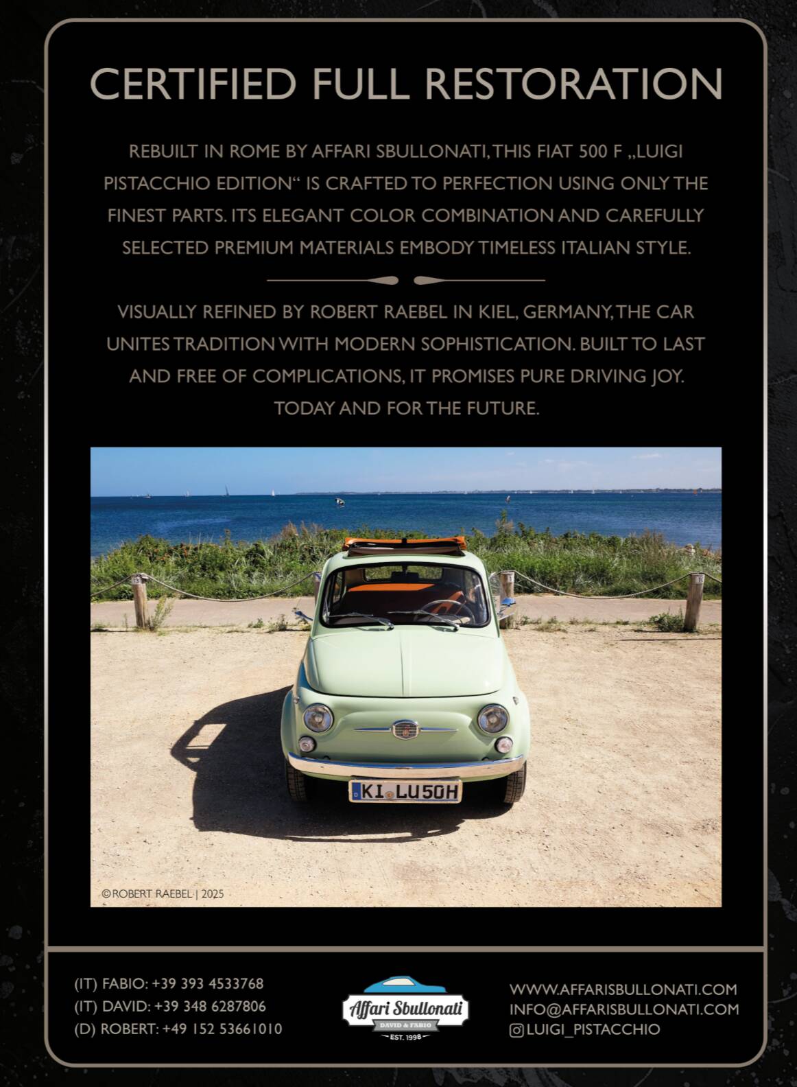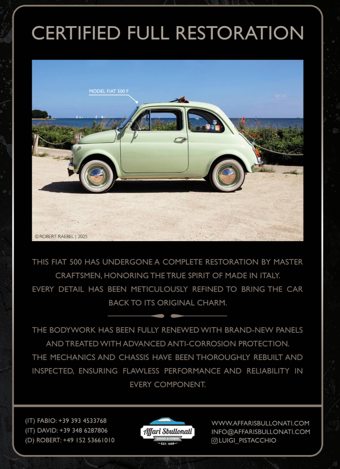 Splendida Fiat 500 in edizione Luigi Pistacchio By Affari Sbullonati restaurata al bullone tutto certificato step to step meccanica km 0 garantita con garanzia di 12 mesi totale spedizione in tutto il mondo.