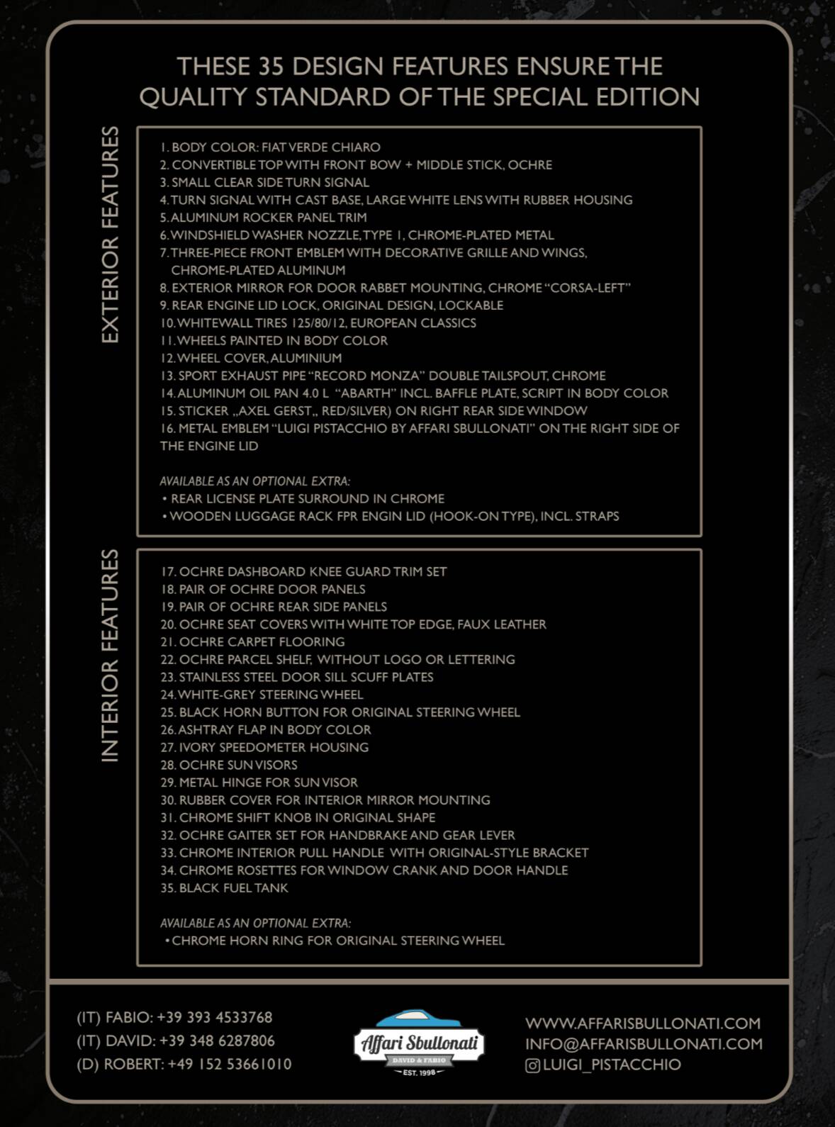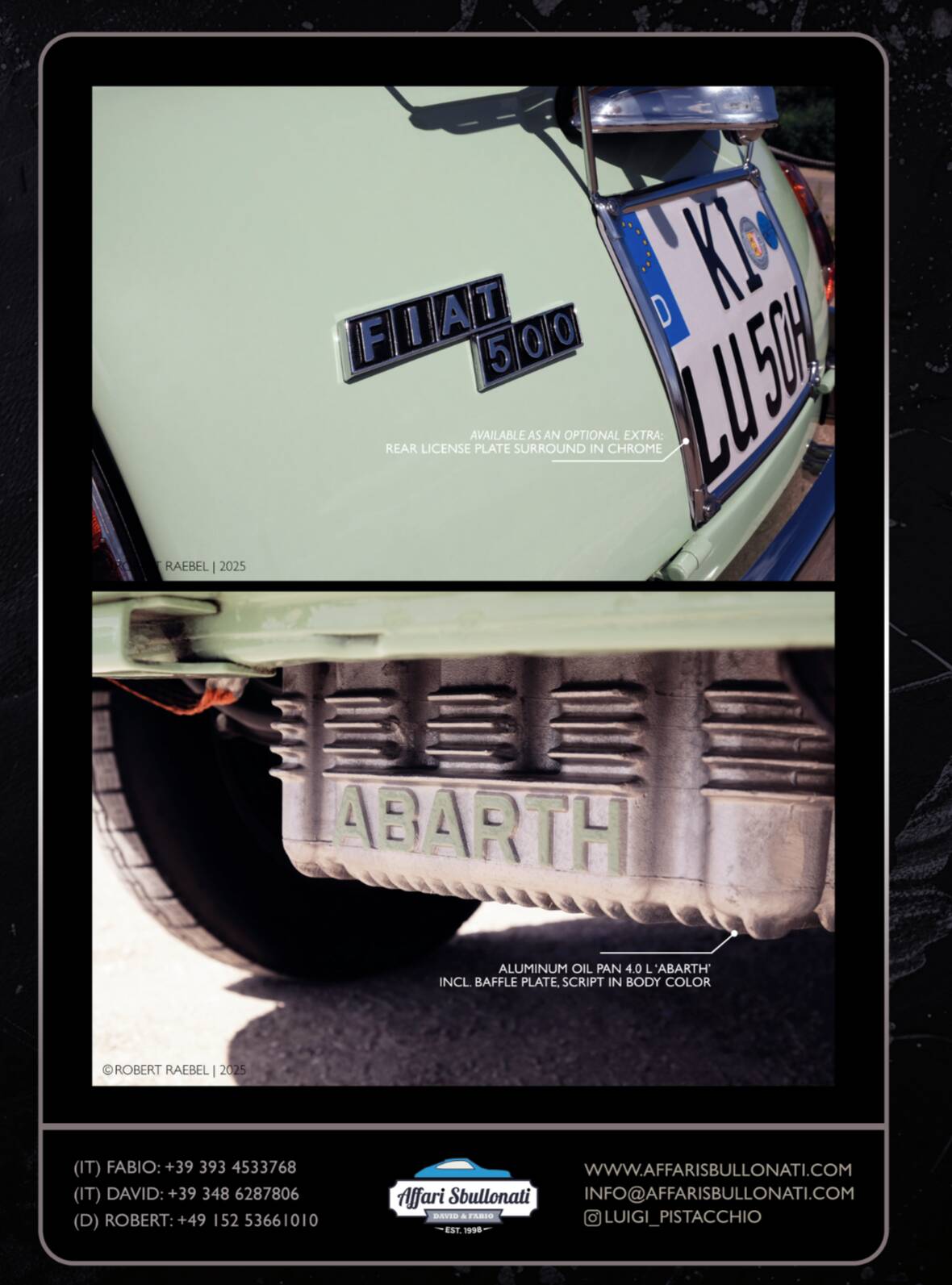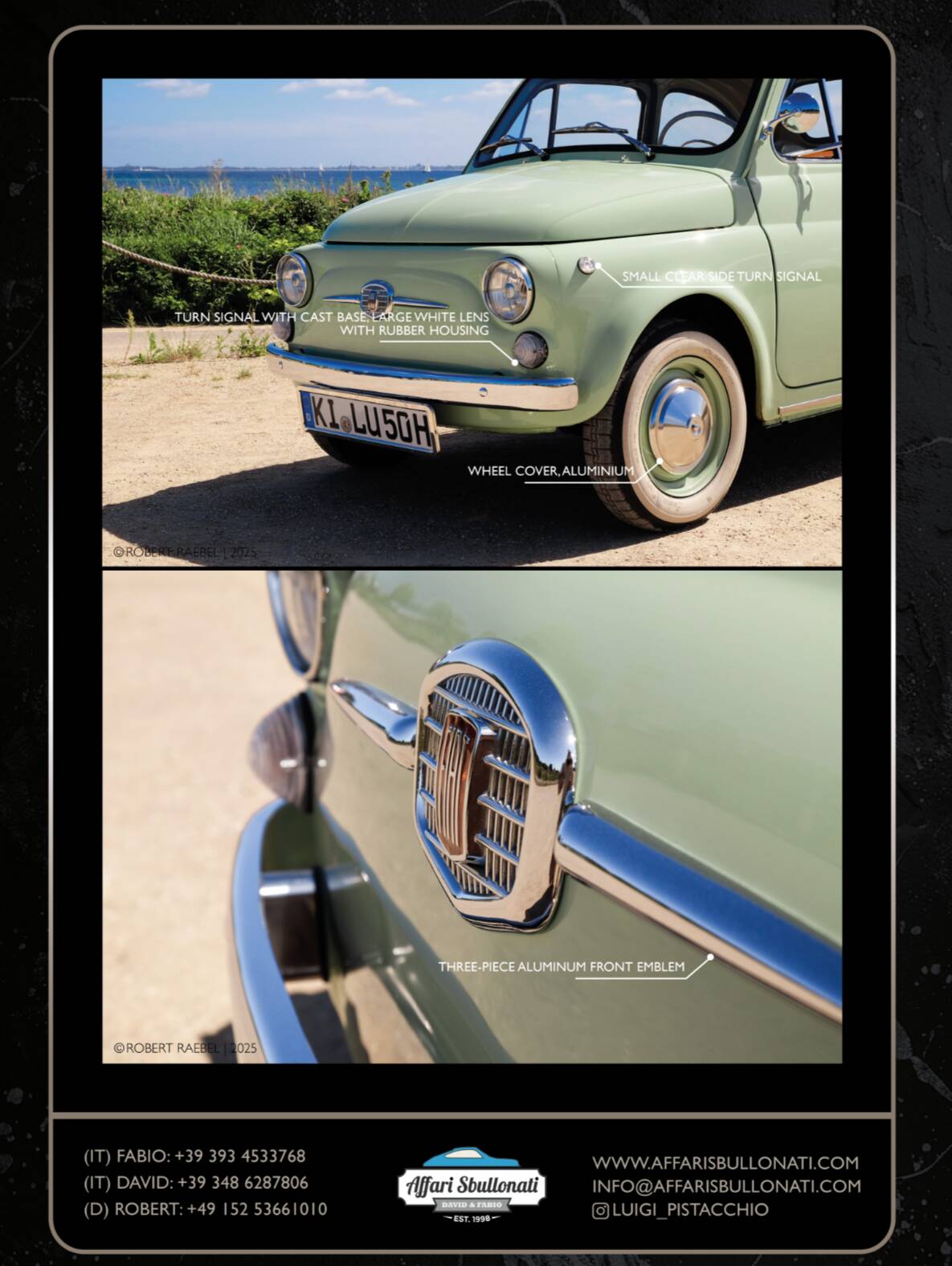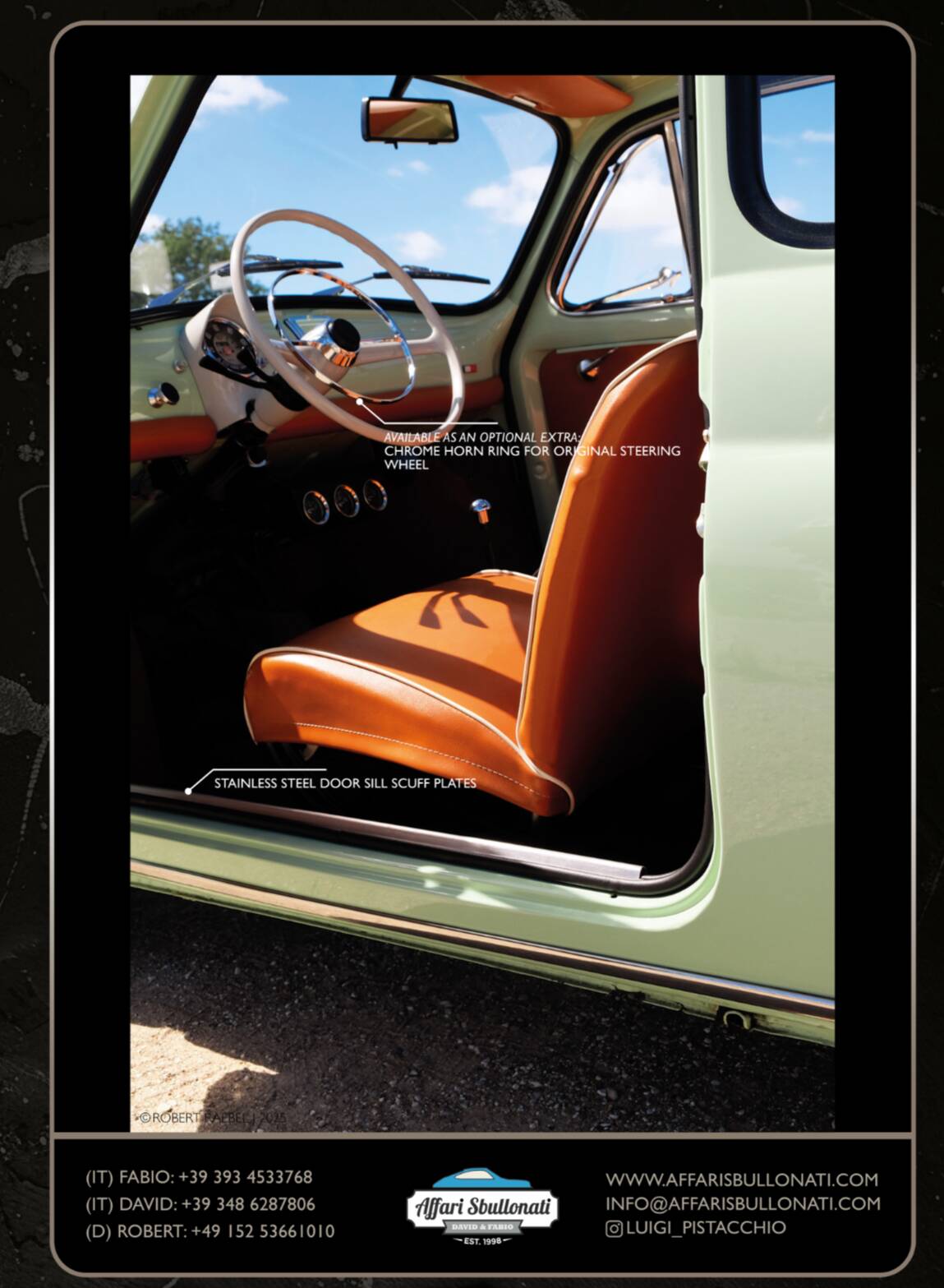 Splendida Fiat 500 in edizione Luigi Pistacchio By Affari Sbullonati restaurata al bullone tutto certificato step to step meccanica km 0 garantita con garanzia di 12 mesi totale spedizione in tutto il mondo.