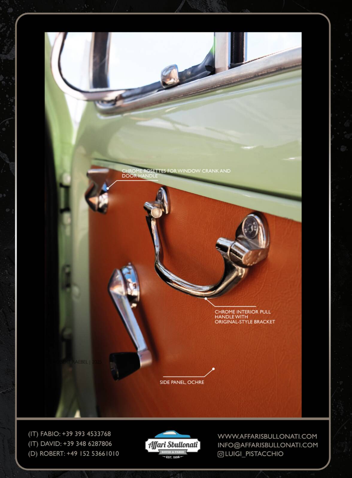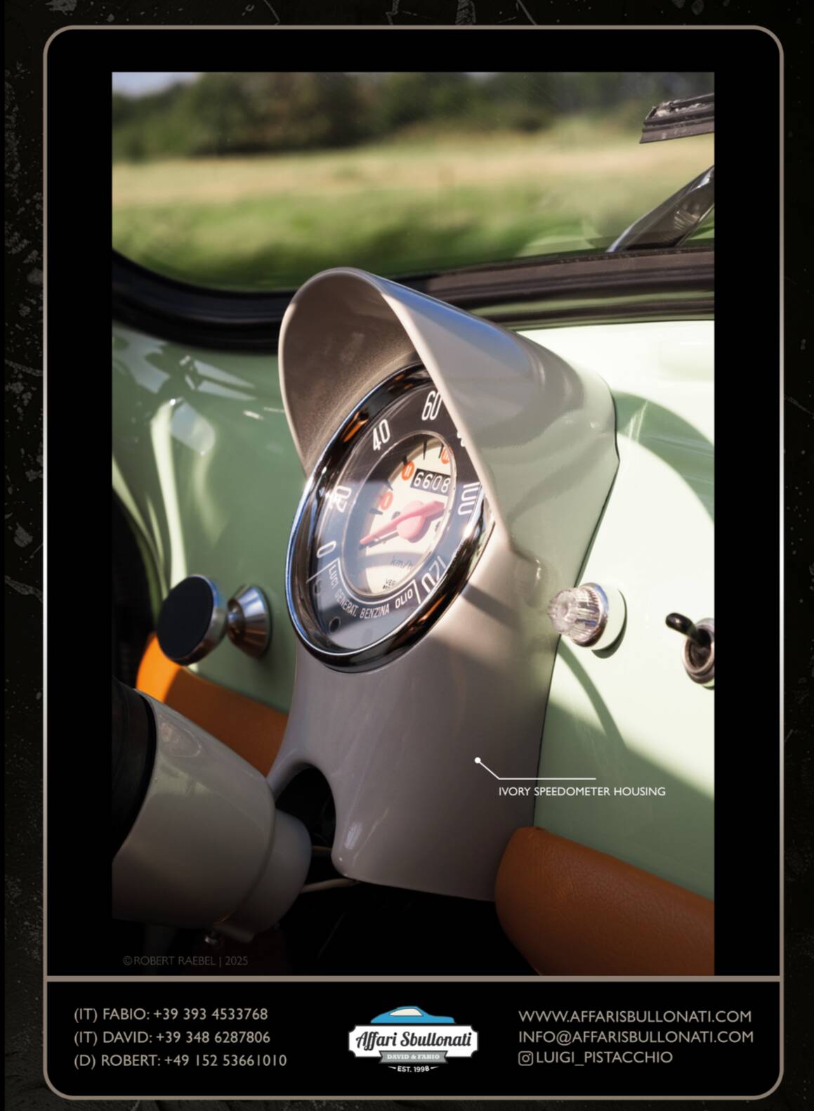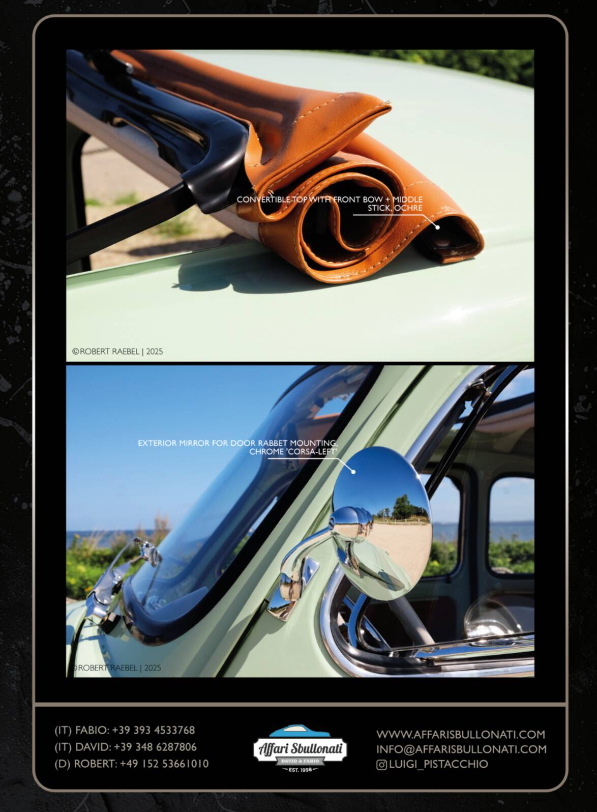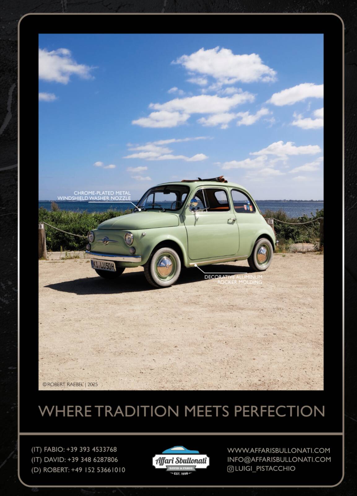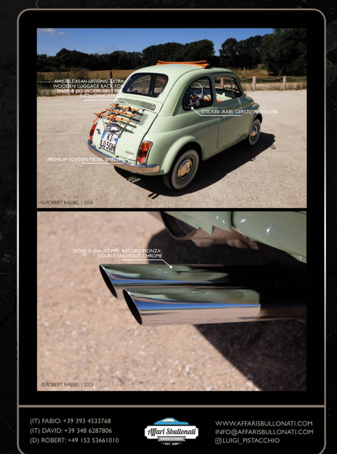 Splendida Fiat 500 in edizione Luigi Pistacchio By Affari Sbullonati restaurata al bullone tutto certificato step to step meccanica km 0 garantita con garanzia di 12 mesi totale spedizione in tutto il mondo.