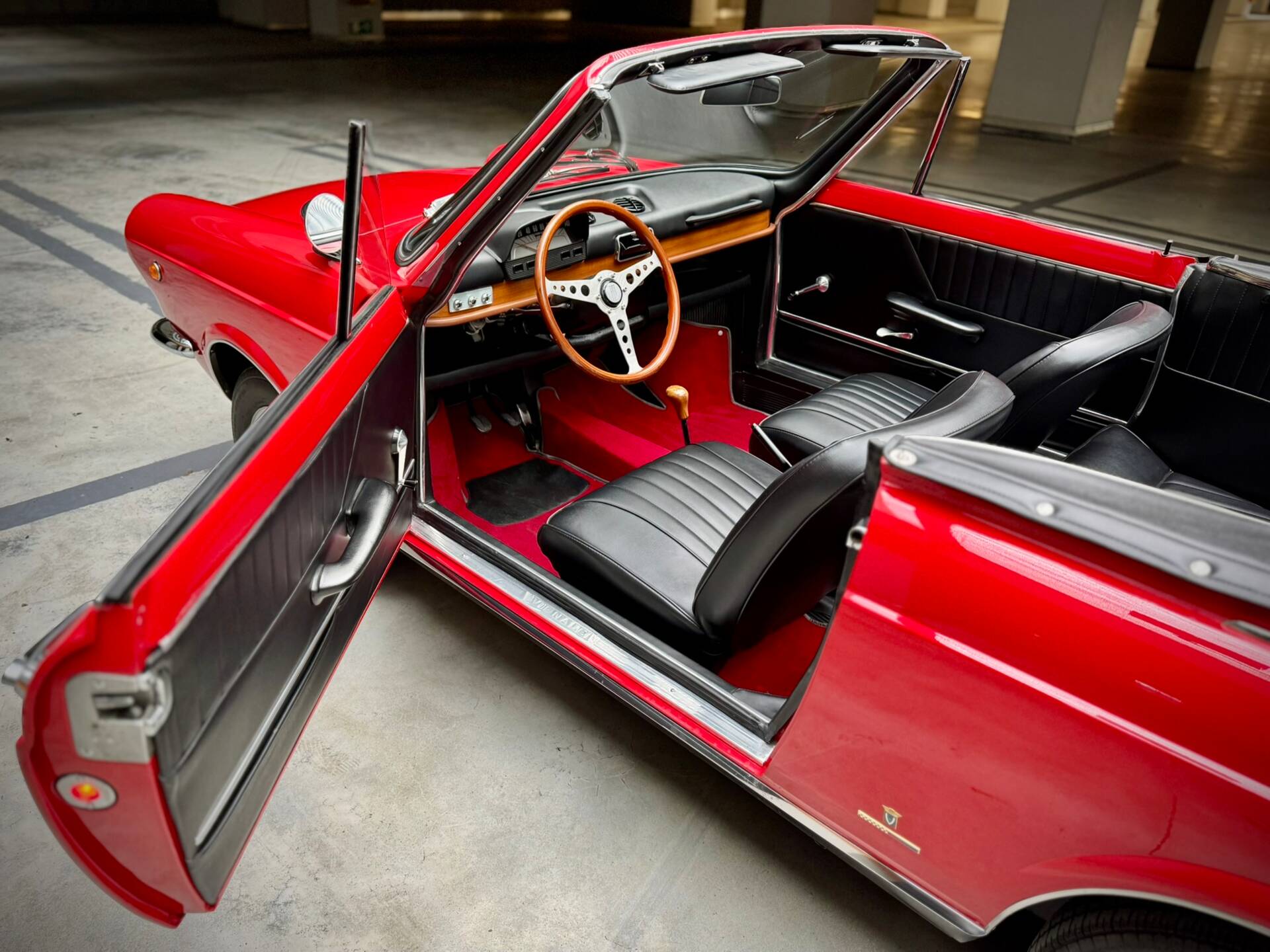 Der Fiat 850 Spider Vignale bildet hier keine Ausnahme. Er wurde von 1964 bis 1969 in knapp unter 1.000 Exemplaren produziert und ist damit deutlich seltener als seine von Bertone gezeichnete Schwester. Er unterscheidet sich durch eine deutlich luxuriösere Ausrichtung: Holzarmaturenbrett, verchromte Radläufe und Einstiegsleisten, Vignale-Embleme an verschiedenen Stellen, ausgekleideter Kofferraum und ein Verdeck, das vollständig hinter dem Beifahrersitz verschwindet… Eine Behandlung auf Maserati-Niveau für einen bezaubernden kleinen Fiat.