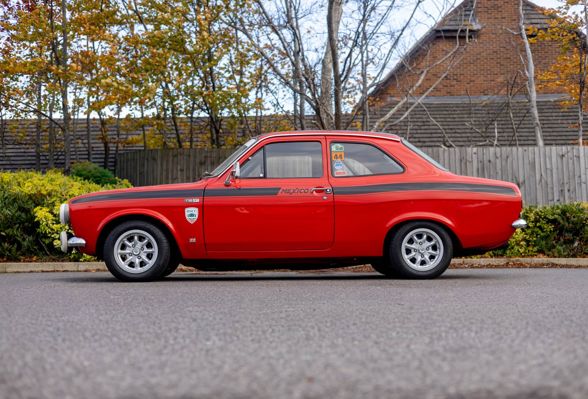 This Escort was built in May 1972 and first registered 'RWC 483K' as a Mexico by the Ford Motor Company, Warley, although the bodyshell is a Type 49 Twin-Cam to export specification (left hand drive, battery under bonnet, opening quarter lights). Painted Sunset Red, it was first used in Sweden as a 'PR' car and is pictured in advertising literature of the time. Returned to Ford's Advanced Vehicles Operation (AVO), the Mexico was used as an experimental vehicle by the engineers before being strengthened and prepared as a back-up 'recce' car for the 1973 East Africa Safari Rally. At this time, it had a 1,840cc cross-flow Kent engine installed, while a BDA is known to have been installed at some time. The entire Ford works cars retired from that year's Safari Rally and out of six red-finished back-up cars only two returned. Back at AVO, the cars were scheduled for decommissioning but company employee John Aedy was permitted to buy 'RWC 483K', together with an RS2000 bodyshell, provided that the car was returned to standard Mexico specification. The original 1,600cc cross-flow engine was refitted and the car converted to right hand drive, after which Mr Aedy installed the seats from the RS 'shell and used the Mexico as his daily drive for many years. The Mexico left the Aedy family's ownership in 1988.