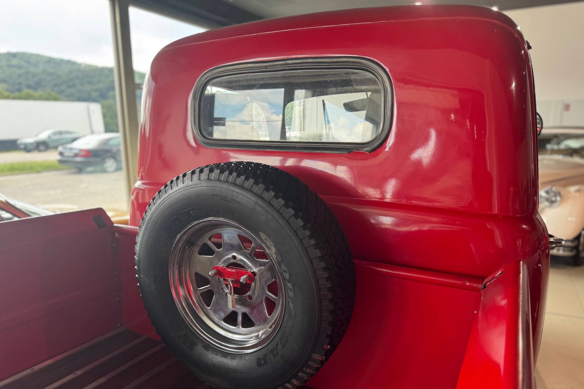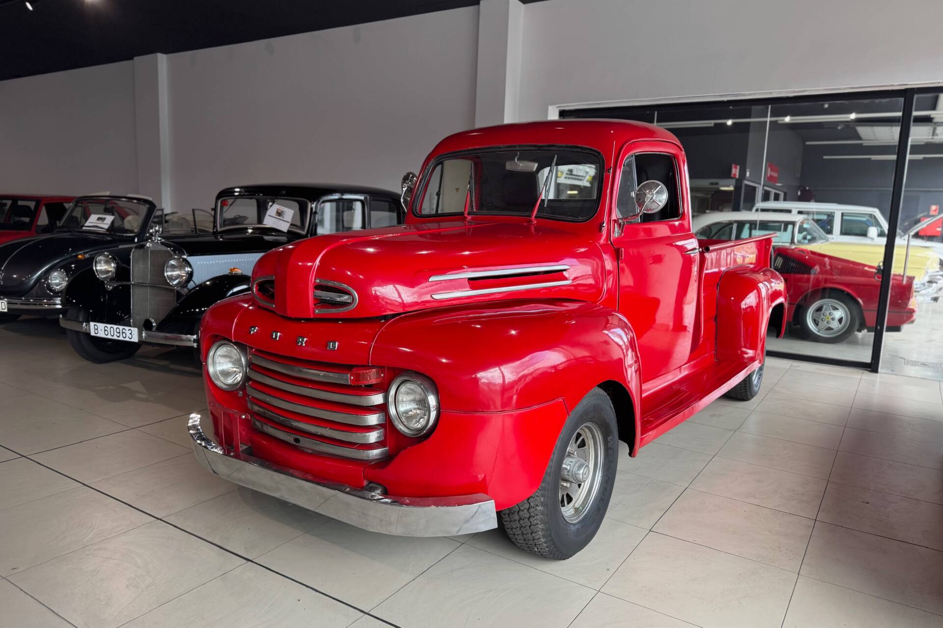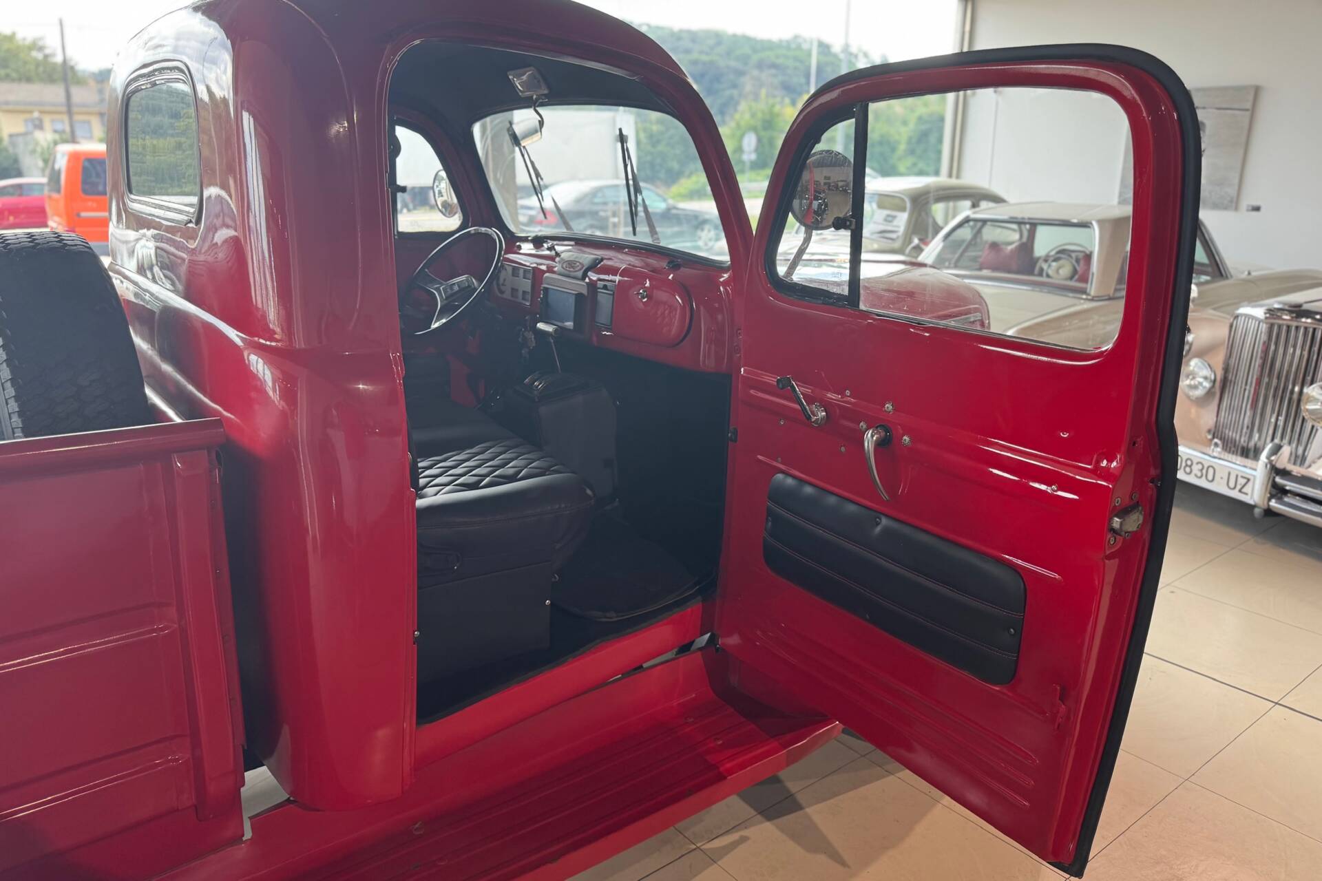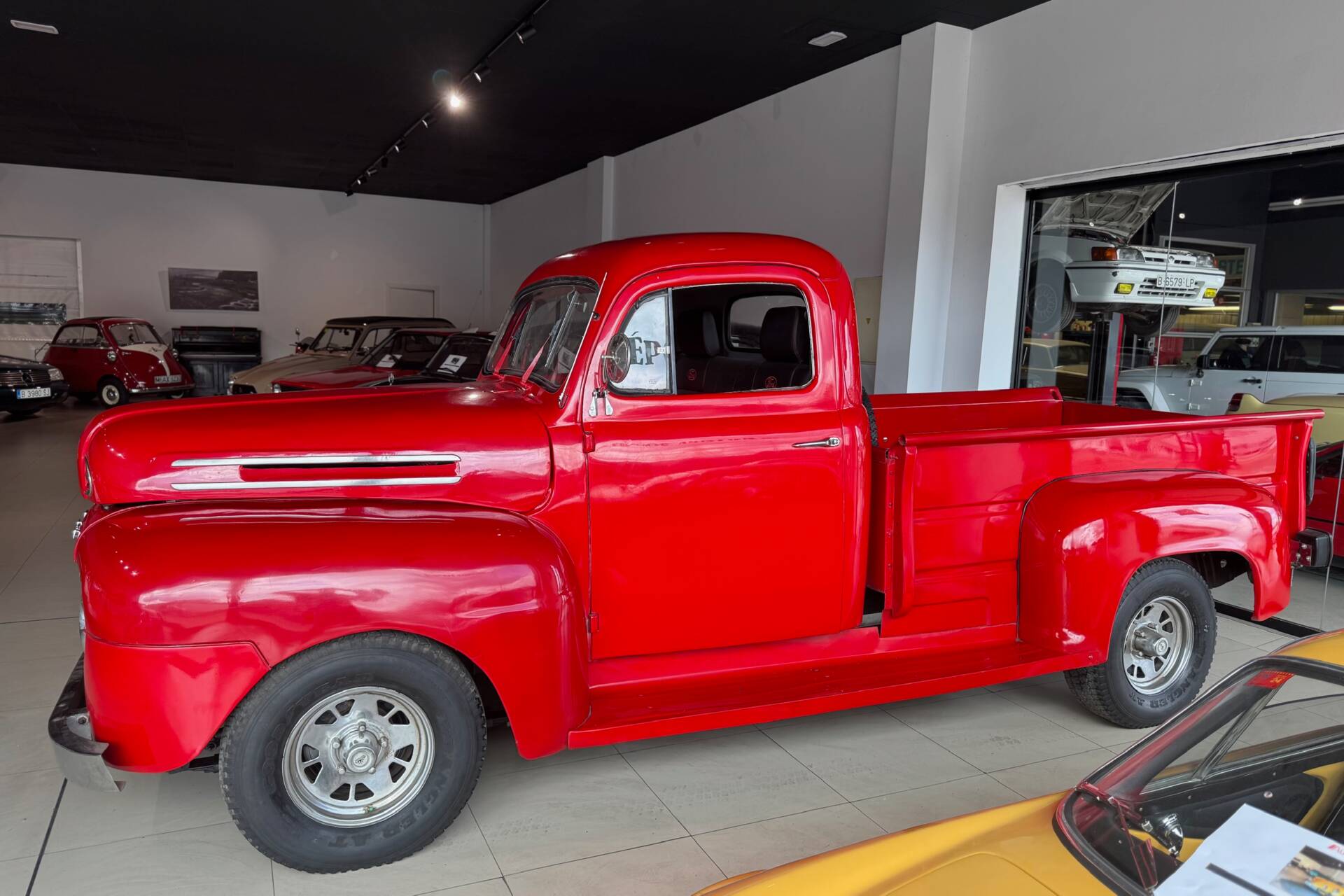 Impresionante réplica de la mítica Ford F100 Pick Up, icono americano de finales de los años 40 y principios de los 50, presentada en un impecable color rojo brillante que resalta sus líneas clásicas y su carácter robusto.