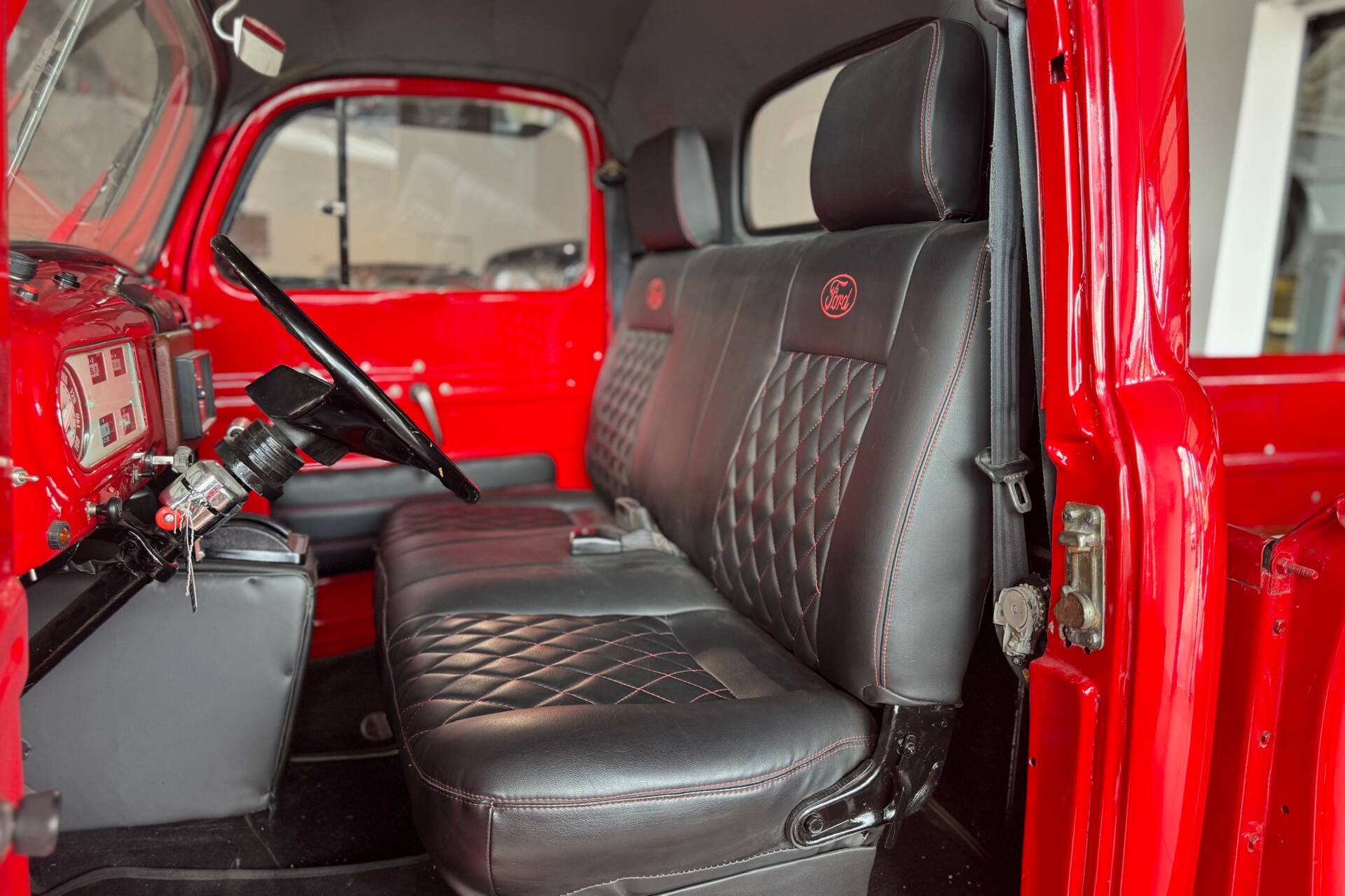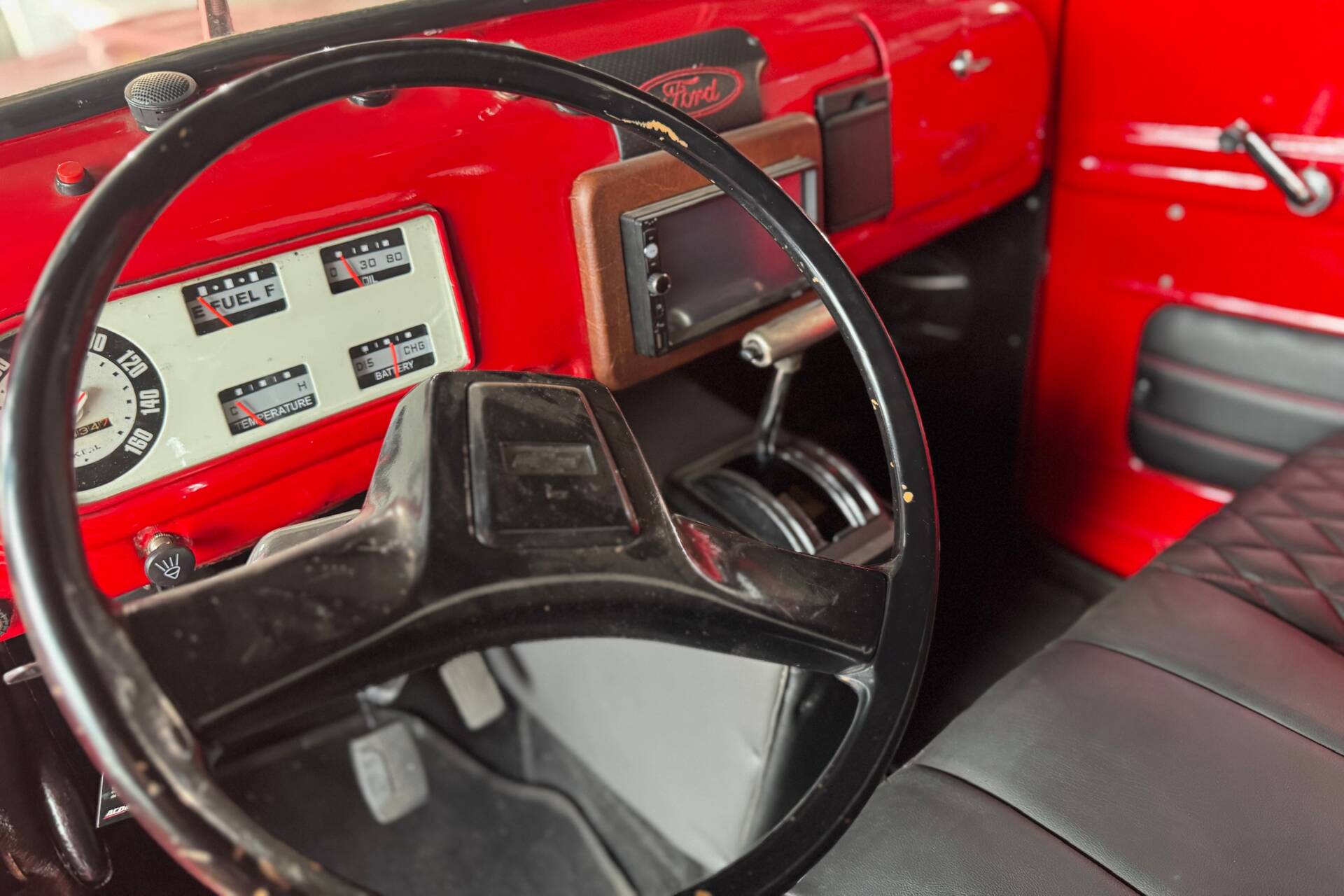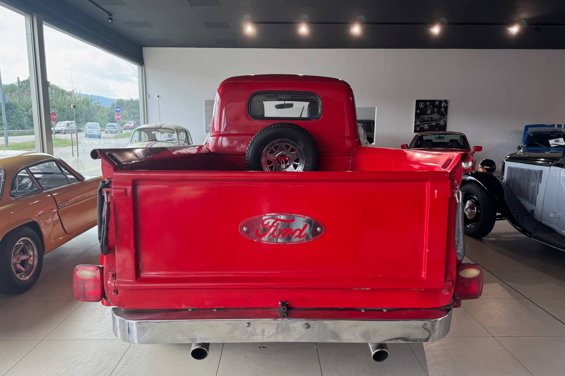 Impressionnante réplique du légendaire pick-up Ford F100, icône américaine de la fin des années 1940 et du début des années 1950, présentée dans une couleur rouge vif impeccable qui souligne ses lignes classiques et son caractère robuste.