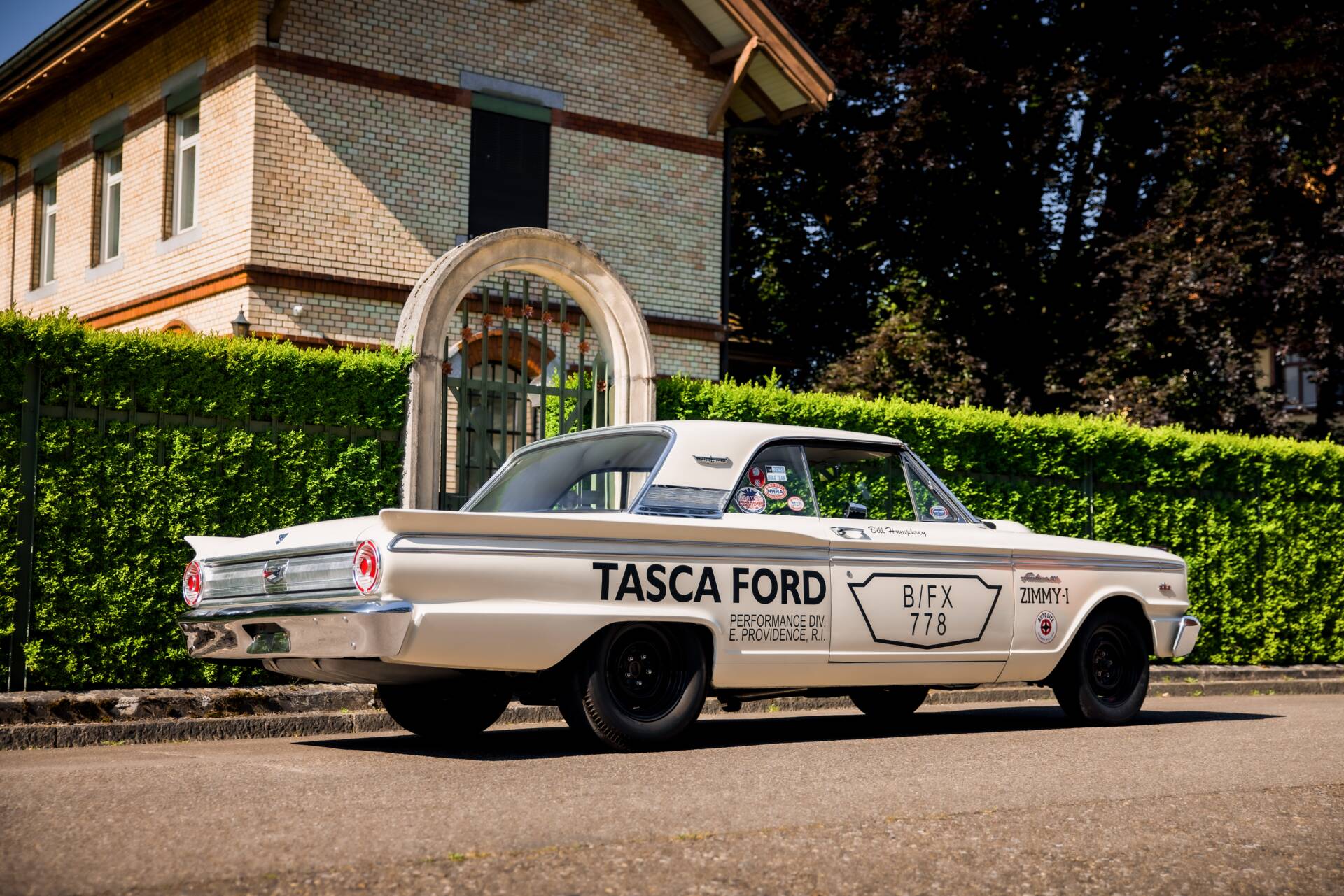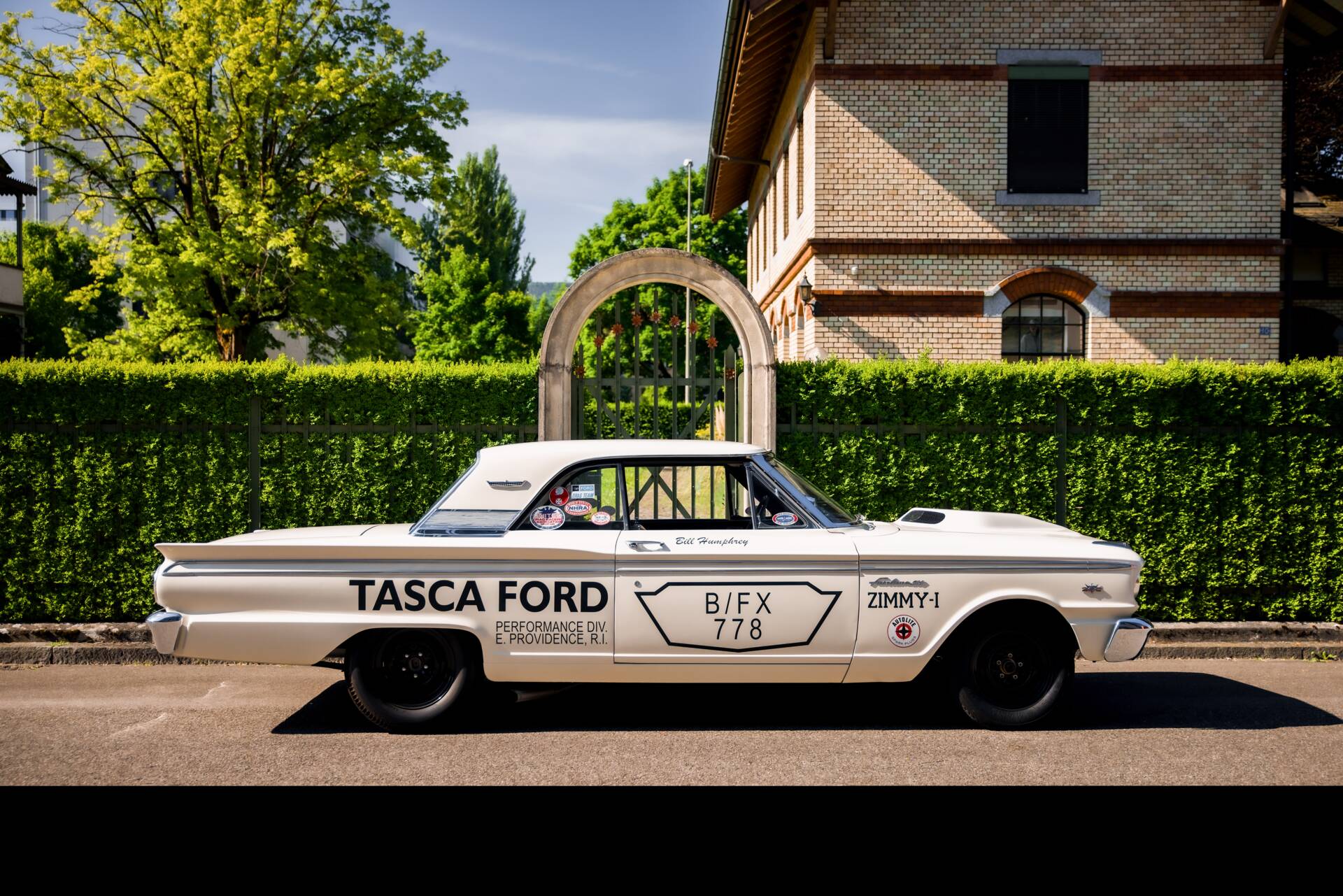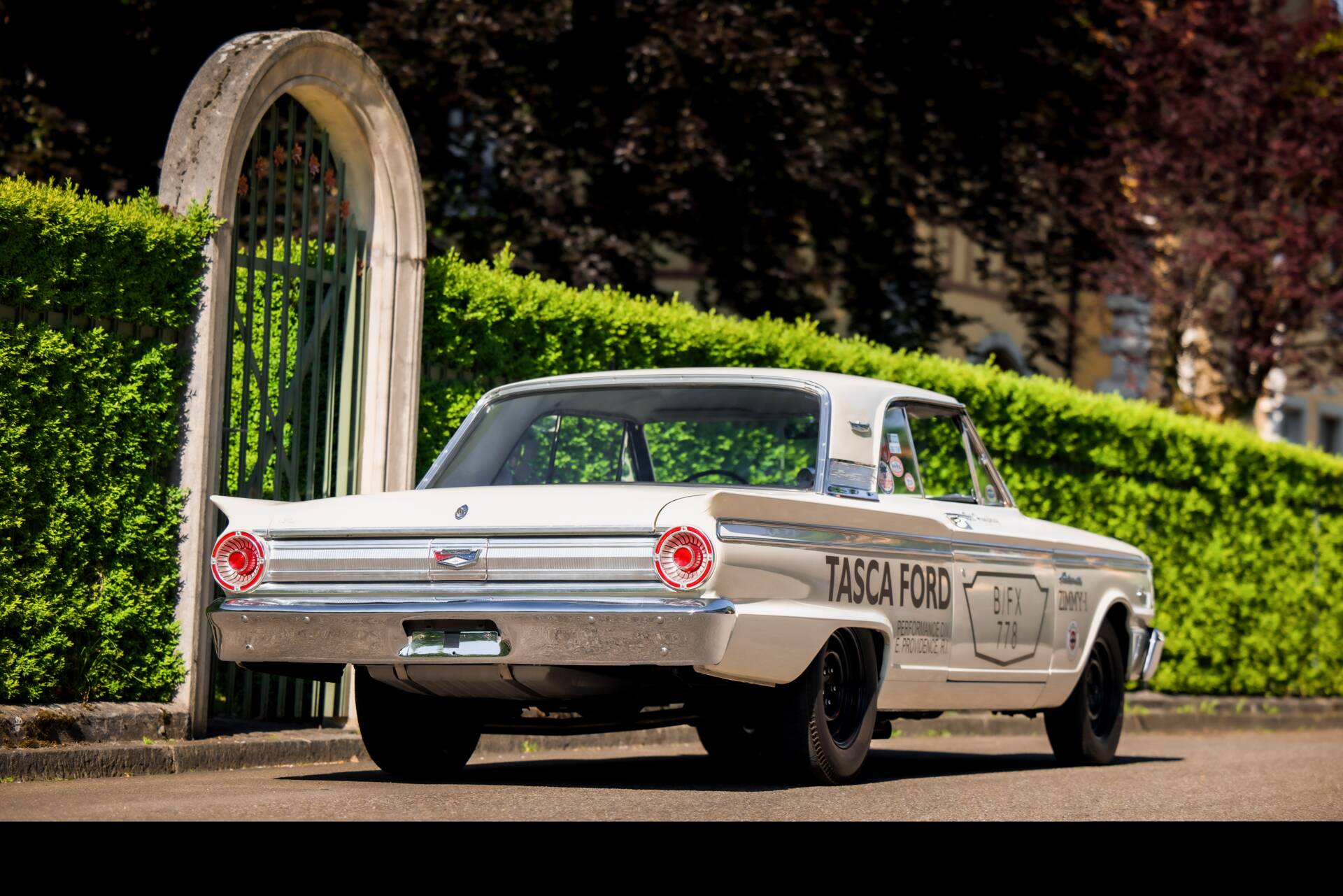 Die erste Hälfte der 60er Jahre markiert die goldene Ära des Drag Racing in den USA. Die unter der National Hot Rod Association (NHRA) durchgeführten Virtel Meilen Rennen waren noch nie so populär. Mehr Hubraum, mehr Leistung, mehr Racing war das Credo. Auch die Hersteller aus Detroit mischten im grossen Stil mit und bekamen mit „FX“ (Factory Experimental) ein eigenes Rennklassement um sich dort zu messen. Das Grundprinzip: ein kompaktes Serienfahrzeug allen unnötigen Gewichts zu entledigen und den grössten und leistungsstärksten Motor aus der Produktion einzubauen. So begann das Kräftemessen zwischen Ford, GM und Chrysler. Schliesslich war es die Zeit von „win on Sunday, sell on Monday“. 1962/63 geriet der Fairlane mehr in den Fokus für Fords Drag Racing Programm, wo man bis anhin auf den Galaxie setzte. So wurde ein nagelneuer 1963er Ford Fairlane mit einem 410 cui Mercury V8 ausgestattet, welcher wiederum kurz darauf dem neuen 427 Platz machte. Ausserdem wurden Heizung, Radio, Dämmmaterial und weitere unnütze Bauteile entfernt. Damit der gigantische Motor auch Platz fand wurde die ikonische „Teardrop“ Motorhaube aus GFK angebracht. Gemäss dem NHRA Reglement gab es 7 Zoll Sliks auf der Hinterachse. In diesem Auto liess Ford Testfahrer Bill Humphrey auf dem Detroit Dragway die Virtelmeile in 11 Sekunden hinter sich. Von da an war klar: Der Fairlane war der neue Star am Virtelmeilen Himmel. Das Projekt wurde weitergetrieben und mit dem Modelljahr 64 erschien offiziell der Fairlane „Tunderbolt“. Nur 127 dieser Wagen mit der 427er Maschine verliessen das Werk und sind heute extrem seltene und hochpreisige Sammlerfahrzeuge. Der Prototyp jedoch, das von Tasca Ford gesponserte Auto von Bill Humprey, wurde daraufhin geschlachtet. Leider eine gängige Praxis damals.