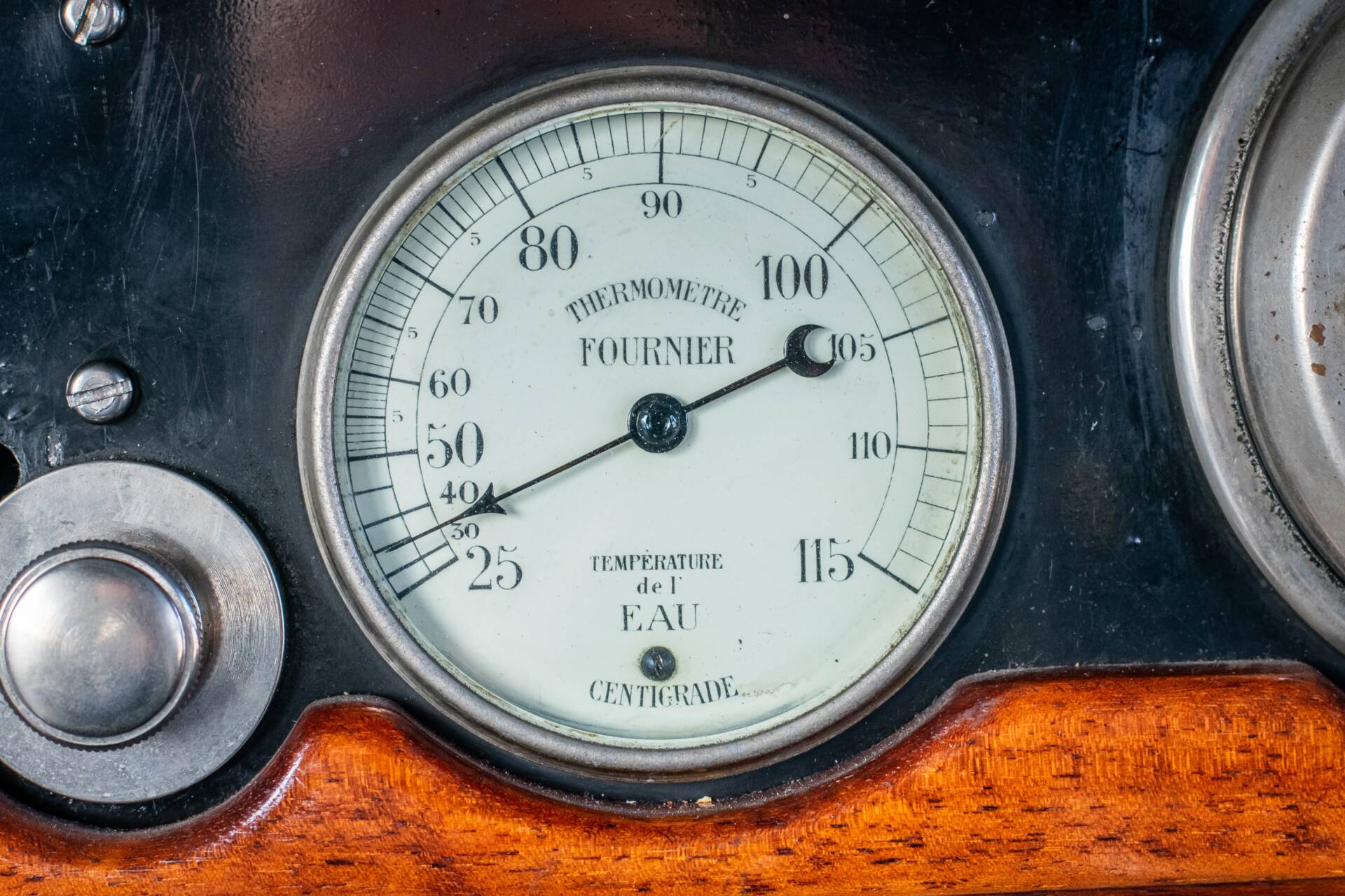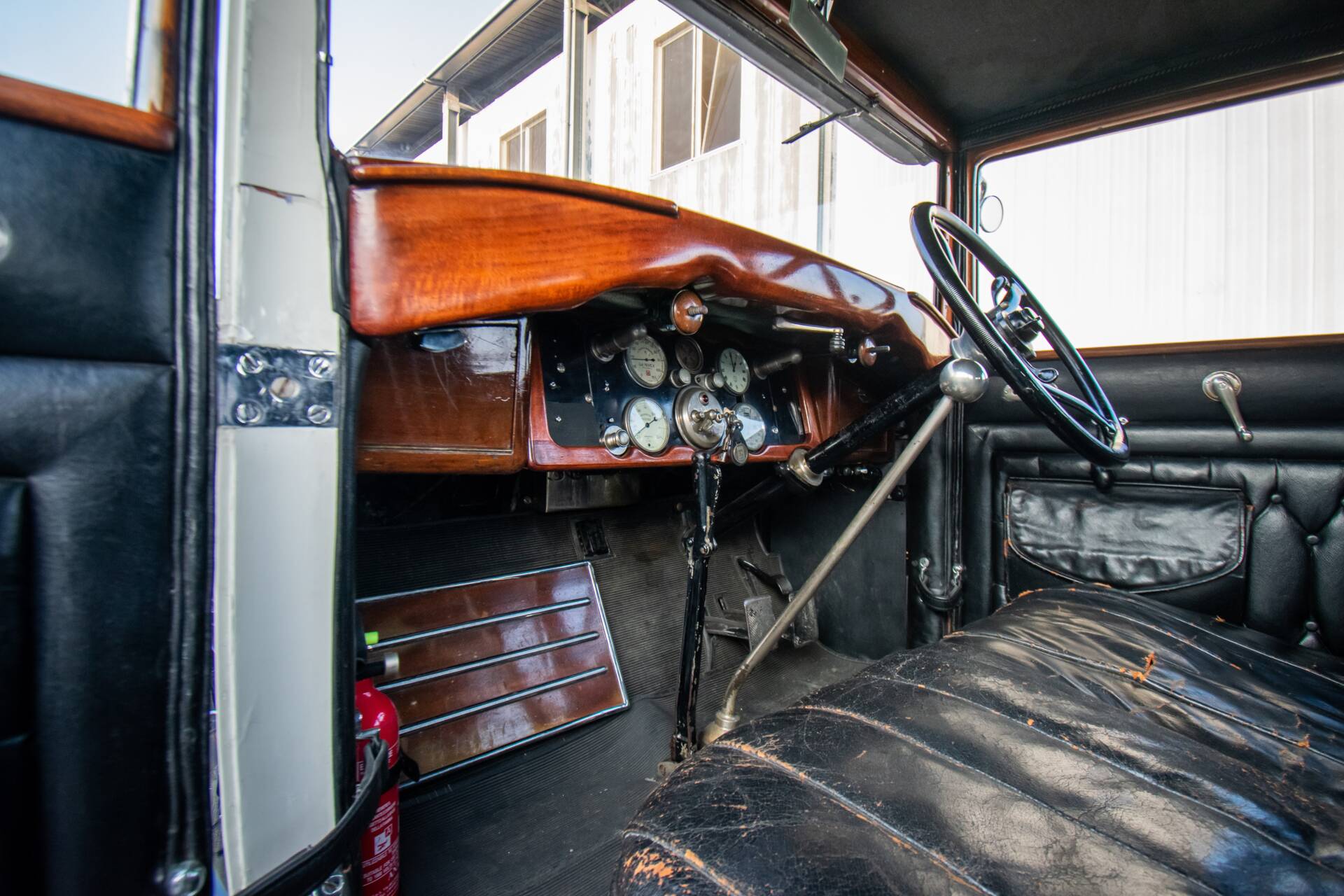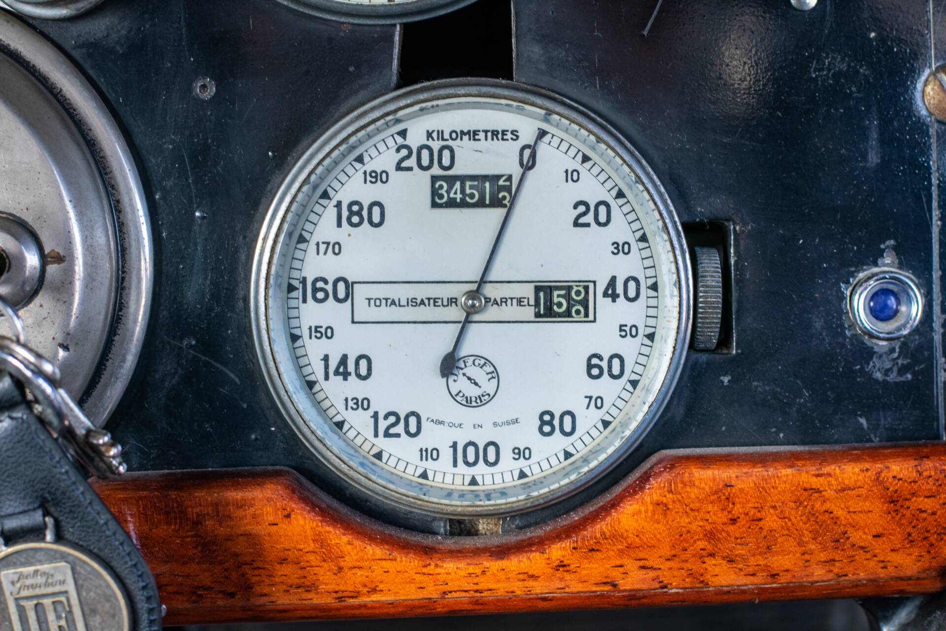 The interior is where luxury cars of this era really offer something spectacular; this most certainly applies here, for from the moment one opens the door, the wonderful buttoned black leather upholstery instantly evokes an atmosphere of timeless class. Complete with such luxuries for the rear-seat passengers as ashtrays, mirrors, even a hairbrush. Fine details are to be seen everywhere one’s gaze wanders: cut-glass interior lights, leather door-pulls, cavernous leather door-pockets etc. In the front, one is faced by a classically vintage large steering wheel, with controls for ignition advance and retard, hand throttle and carburettor settings. Information is transmitted to the driver via a high-quality set of instruments supplied by the likes of Jaeger, Le Nivex and Fournier. The ignition switch itself is a high-quality Bosch unit.