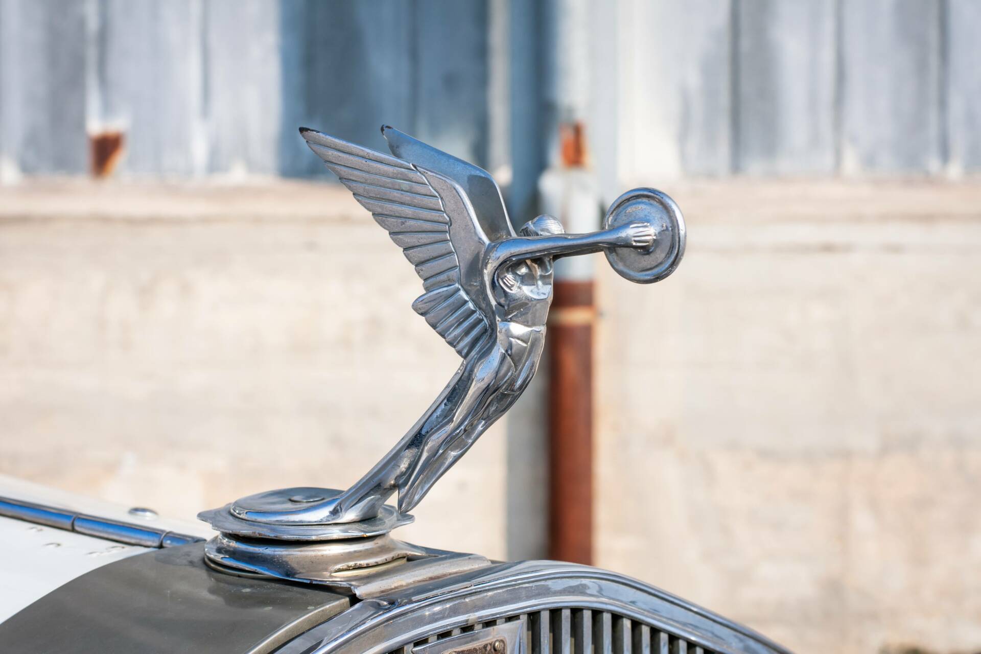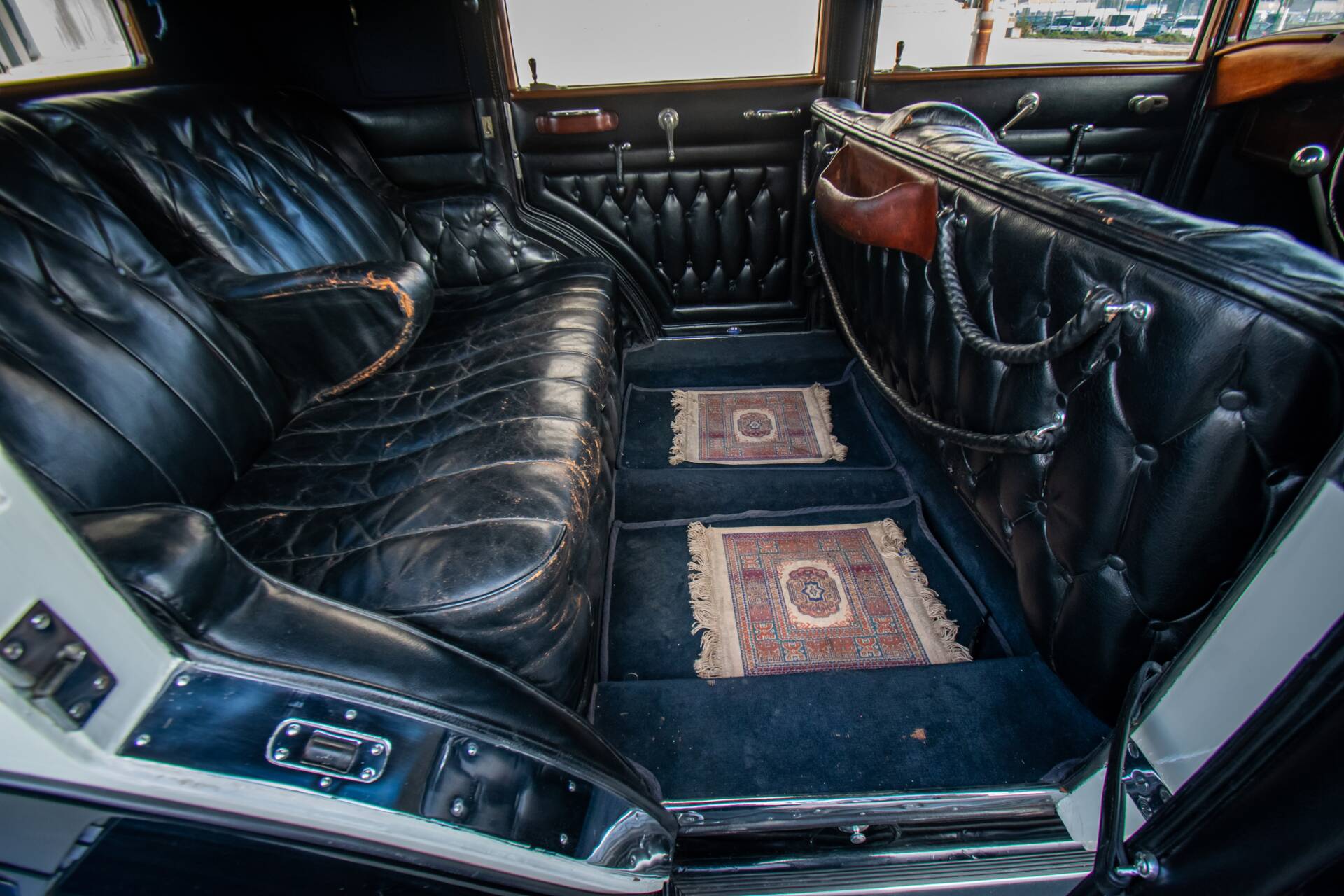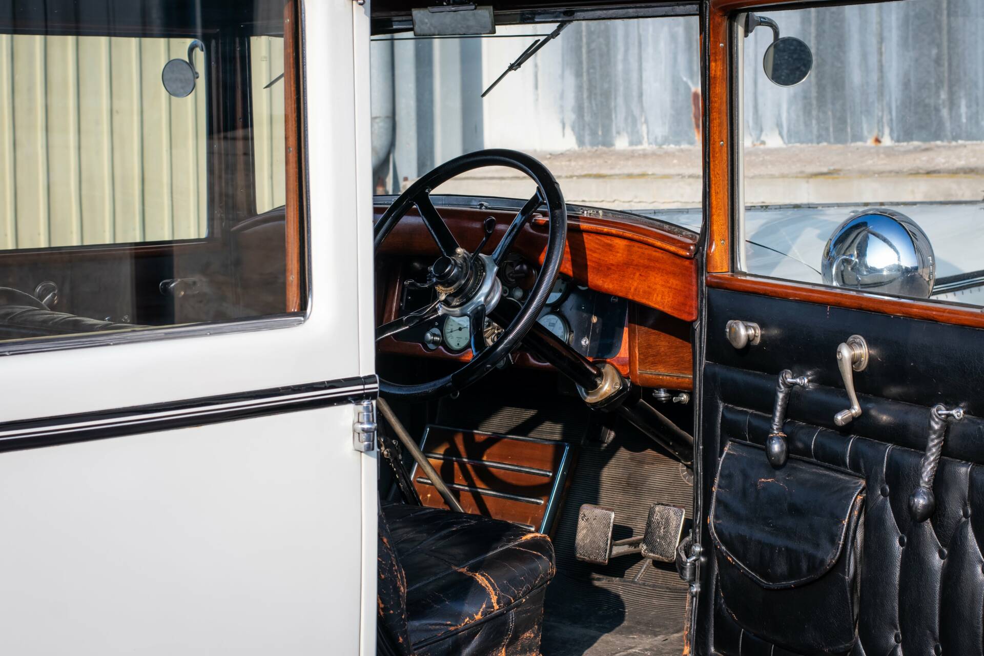 This car was restored in 1968-71, and has seen careful use since; this has kept it in very good condition, while time has given it a mellowed character. The strikingly upright bodywork suits the simple black and white colour scheme very well indeed, while the black coach line that runs the whole length of the car breaks up the white bodywork very effectively. The paintwork is in very good condition with only age-related imperfections – some small cracks and scratches are visible. The chrome is in good condition all-round. Isotta Fraschini’s trademark is the imposing radiator grille, on which is the wonderfully art-deco mascot that adorns the radiator cap – a winged lady, disk in hand, flying headlong at the open road ahead. At night, that road would be illuminated by the two large barrel headlamps that stand proud by the side of the radiator; these are supplemented by a accessory spotlight mounted by the driver’s window.