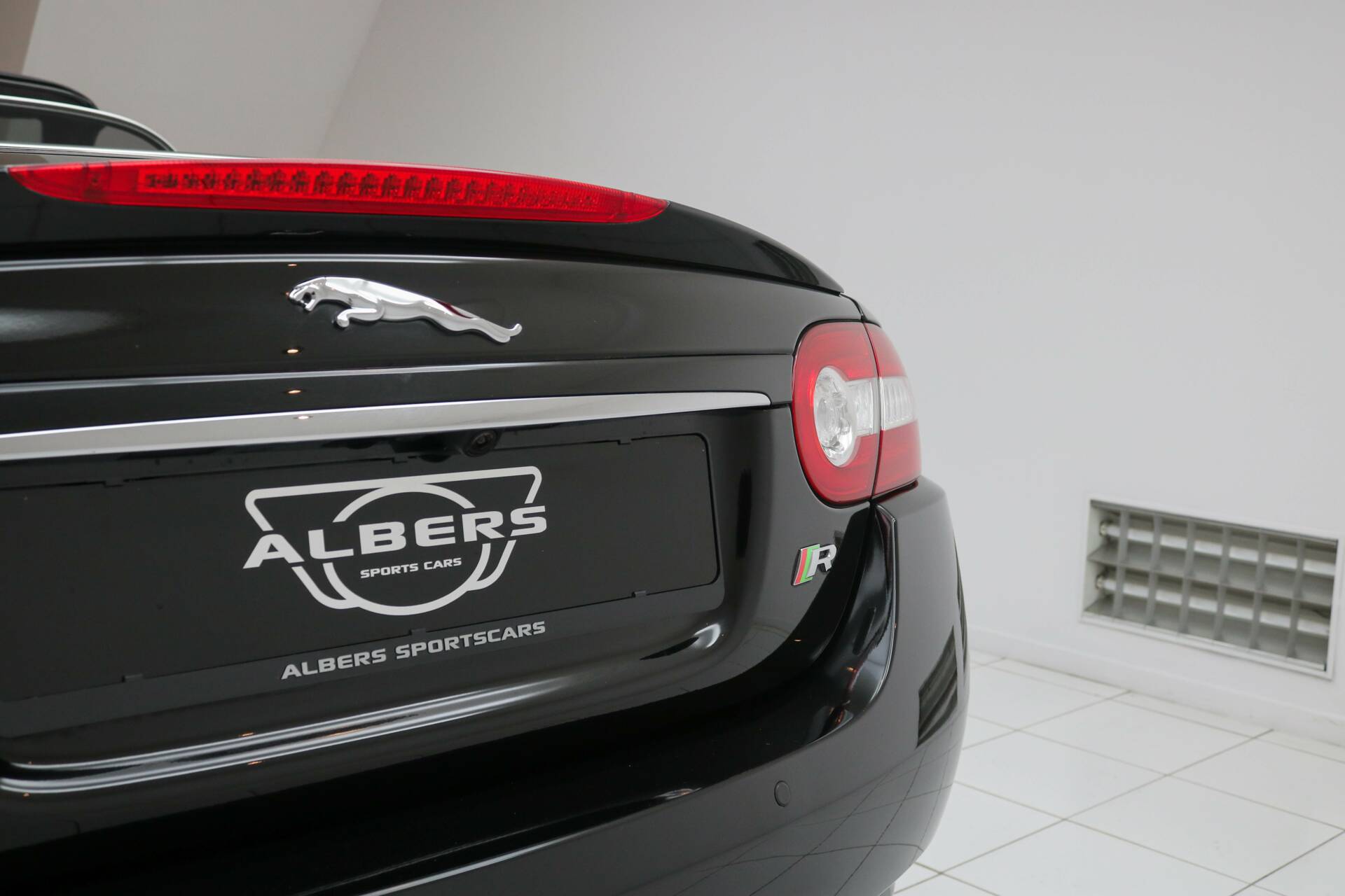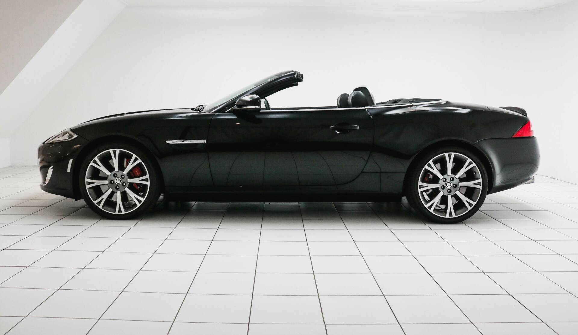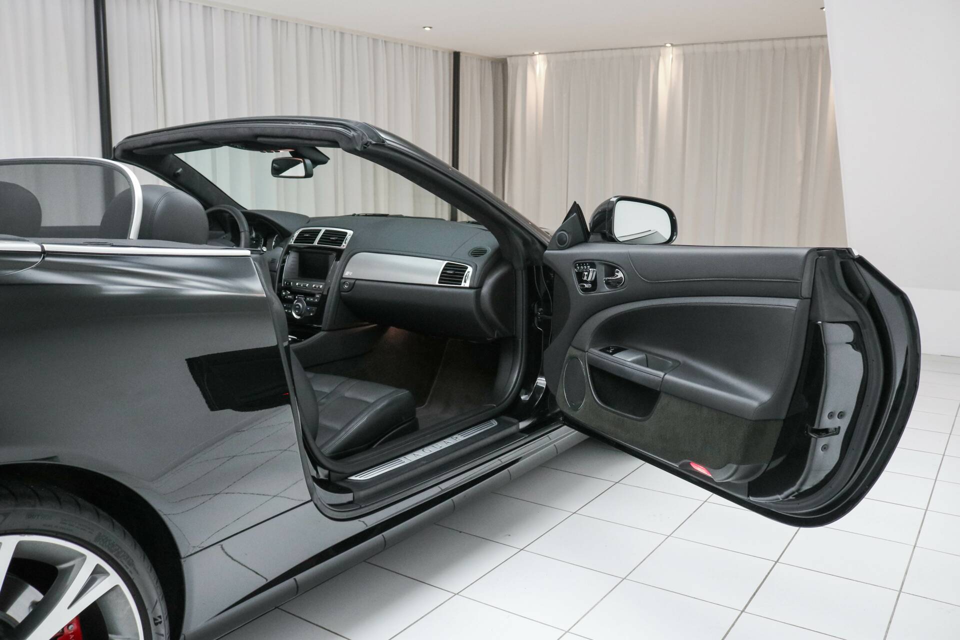Das Fahrzeug ist in Ultimate Black Metallic lackiert, einem tiefen Metallicton, der die sportlichen Linien des XKR hervorragend betont. Das schwarze Softtop fügt sich perfekt in die Karosserie ein und unterstreicht das elegante Cabrio-Design. Zudem verfügt das Auto über originale Leichtmetallräder, dezente Chromdetails und Parksensoren.