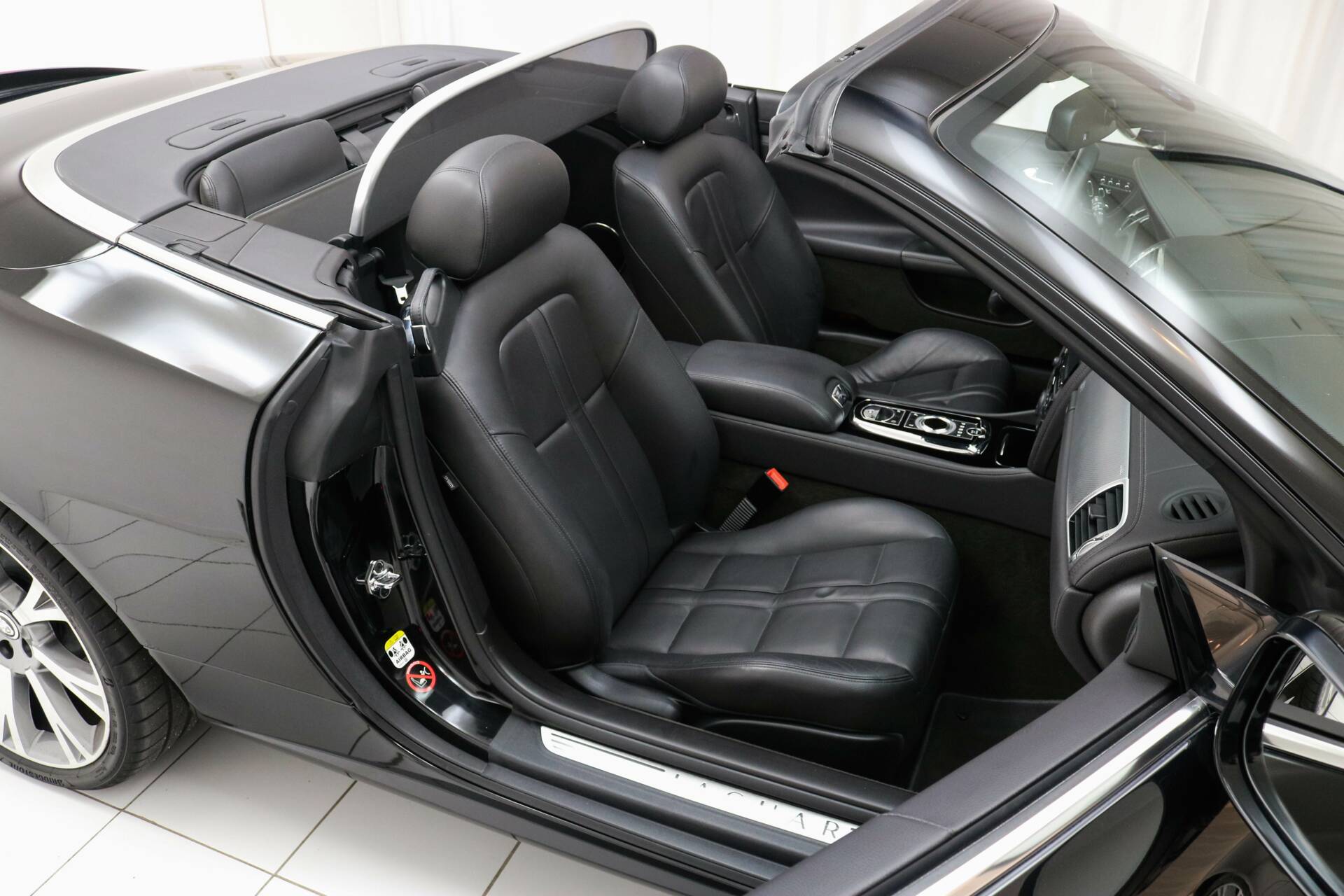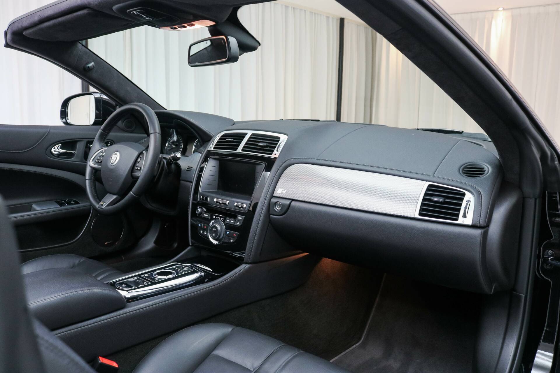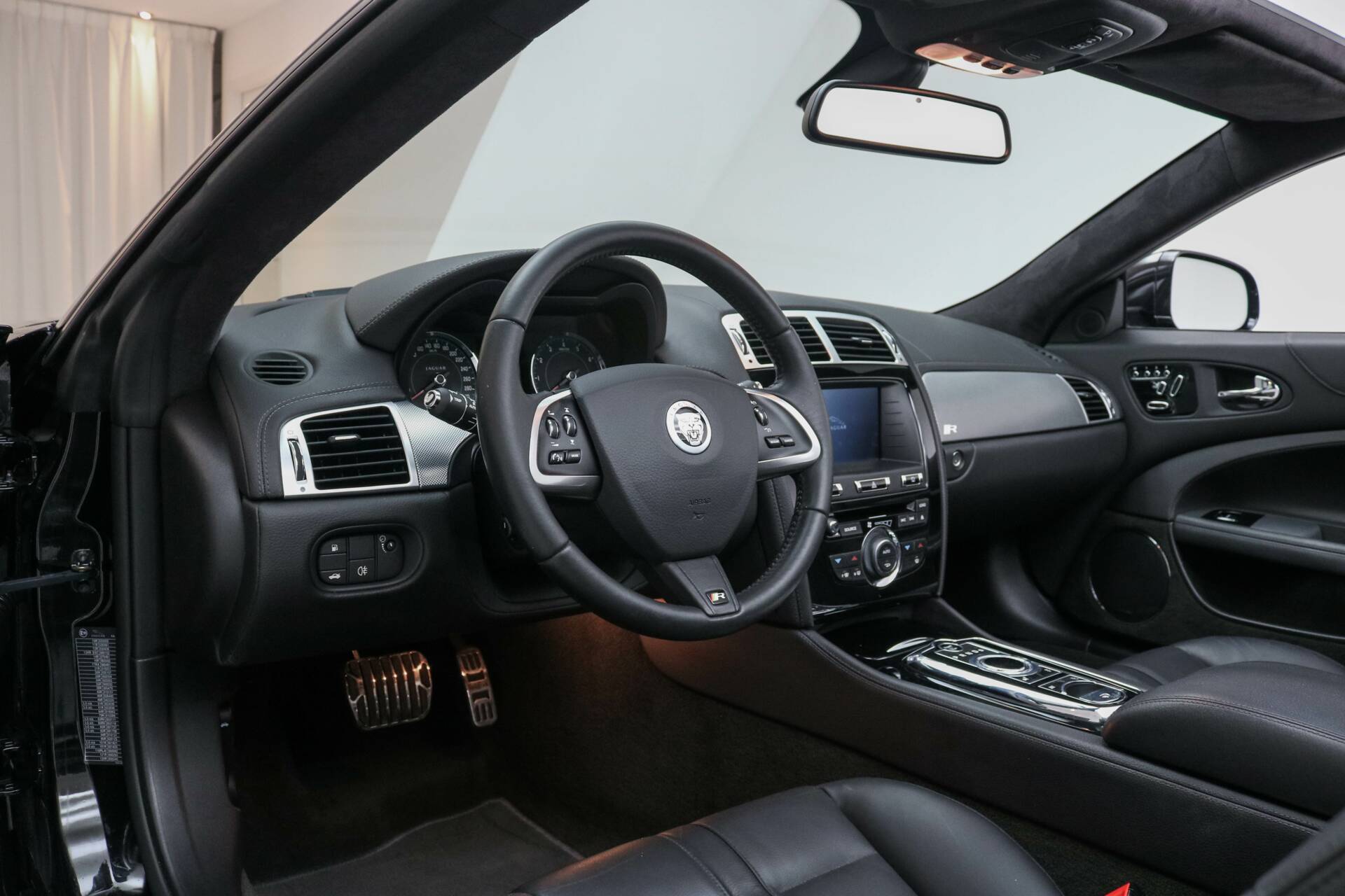 Das Interieur ist mit hochwertigem schwarzem Leder ausgestattet und befindet sich in sehr gutem Zustand. Elektrisch verstellbare Sitze mit Memory-Funktion und Sitzheizung bieten hervorragenden Komfort, während auch das Lenkrad beheizbar ist. Hinter dem Multifunktionslenkrad mit Schaltwippen lässt sich das Automatikgetriebe bequem bedienen. Der XKR verfügt außerdem über ein Navigationssystem und eine hochwertige Alpine-Audioanlage.