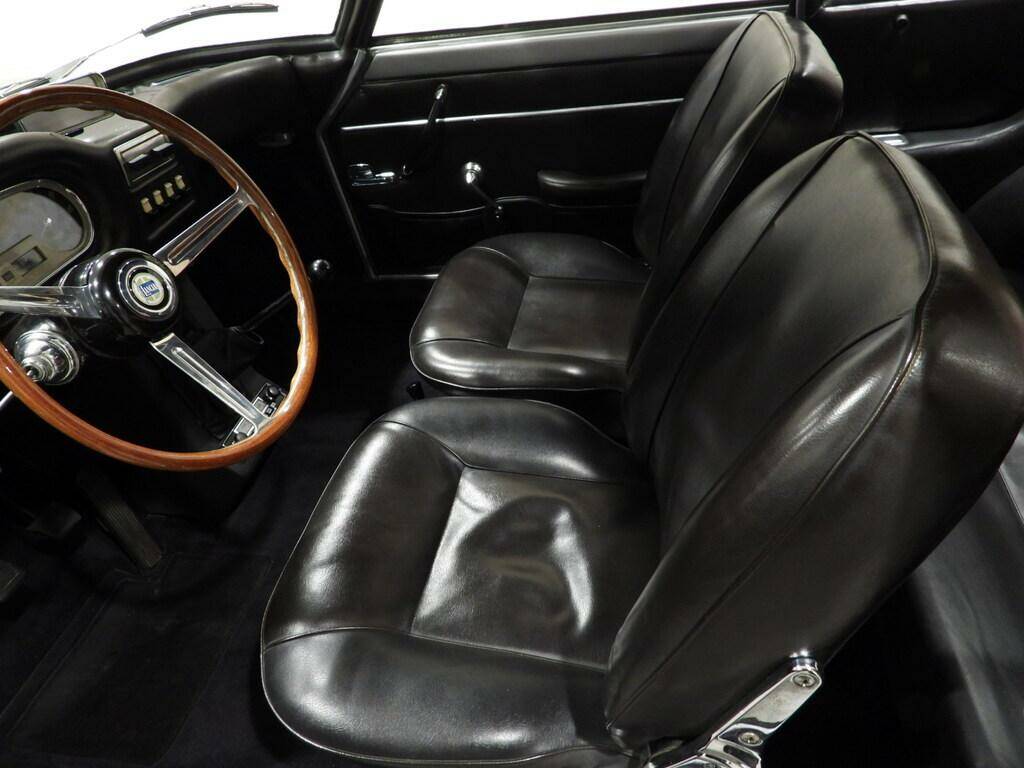 Seats and panels in dark brown TVE (stretch vinyl fabric), black wool carpeting on the floor, three-spoke sports steering wheel with wooden rim, original period Blaupunkt radio with antenna on the right rear fender, rear sun visors, Lancia steel wheels with chrome caps and Michelin 65 SR15 tires, electrically operated rear window with a button, driver's side exterior mirror on the left front fender