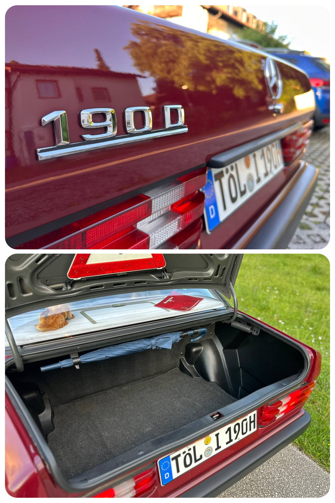 Der Lack ist Original: Barolorot 540 (hat etwas Patina) Der Babybenz hat keinerlei Durchrostungen oder dergleichen. Ungeschweißt! Leichten Rostansatz an beiden Kotflügeln. Sakkobretter wurden dieses Frühjahr entfernt. Keinerlei Rost. Wagenheberaufnahmen sind Top…frisch mit Seilfett geflutet worden. Service wurde und wird regelmäßig durchgeführt (alle 10.000km). Der Babybenz ist sehr zuverlässig, springt immer an und ist die letzten 50.000km ohne jegliches Problem gelaufen, darunter auch Langstrecken auf der Autobahn. Das Fahrzeug ist 8 Fach bereift. Die Yilduz Felgen (w211) sind im Preis mit inbegriffen. Wird auch nur in Kombi verkauft. Gerne vorbeischauen und sich selbst ein Bild davon machen. Bei schönem Wetter ist eine Probefahrt natürlich möglich. Es wurden einige Stunden mit tropfendem Schweiß, Fluchen sowie dreckigen/öligen Fingern investiert ;). Ich freue mich natürlich wenn dafür Wertschätzung entgegengebracht wird. Der Babybenz ist im Mai 36 Jahre alt geworden. Wir sprechen hier nicht von einem Neuwagen…jedoch von einem gut erhaltenen 190er Daimler. Es war und ist das beste Auto was ich persönlich jemals gefahren habe. Das Fahrgefühl ist einzigartig! Kommt gerne zur Besichtigung vorbei. Ich freue mich auf euren Besuch! Aktuell steht er in Geretsried in einer Tiefgarage.