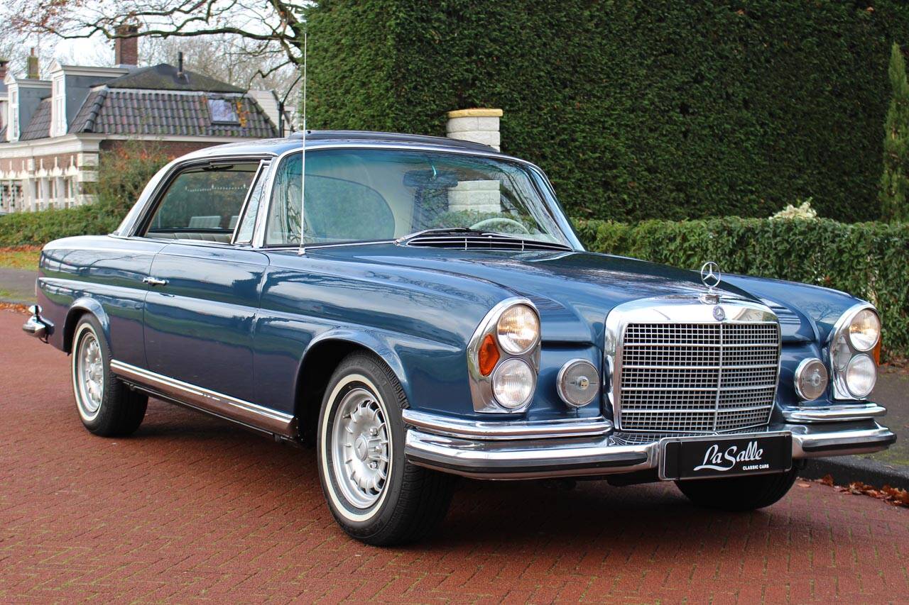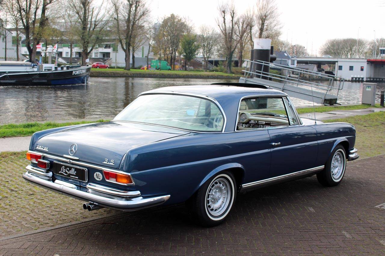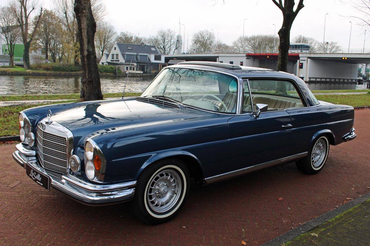 Ein außergewöhnlich schönes Mercedes-Benz 280 SE 3.5 Coupé. Dieses Spitzenmodell wurde von 1969 bis 1971 in limitierter Auflage gebaut und trägt aufgrund des niedrigen, breiten Kühlergrills, der den V8-Motor beherbergt, den Spitznamen „Flachküler“. Es handelt sich um eines der wenigen neu in den Niederlanden ausgelieferten Exemplare. Der Komiker Toon Hermans erwarb dieses 3.5 Coupé im Jahr 1971. Es verfügte damals über teure Extras wie Klimaanlage, ein Stahlschiebedach, eine edle Lederausstattung und ein Becker-Radio. Der Mercedes blieb stets in den Niederlanden und wurde penibel gepflegt. Die dunkelblaue Metallic-Lackierung (Farbcode 387H) wurde kürzlich aus optischen Gründen erneuert. Der Innenraum ist komplett original und in außergewöhnlich gutem Zustand. Der 3,5-Liter-V8-Motor in Kombination mit dem sanft schaltenden Automatikgetriebe macht diesen 280 SE auch heute noch zu einem Fahrspaß pur. Dieses 3,5-Liter-Coupé wurde kürzlich von der Fachwerkstatt Van Dijk Lisserbroek komplett gewartet (Rechnungen vorhanden). Auch technisch und mechanisch befindet es sich in einem Top-Zustand!