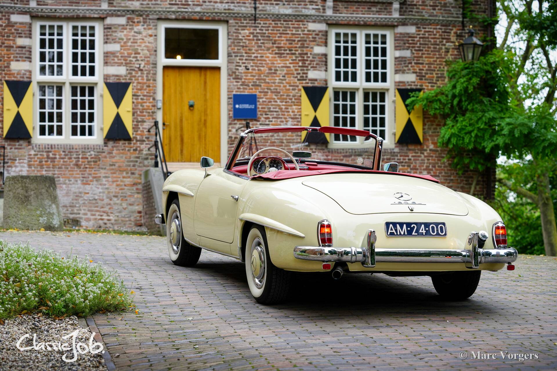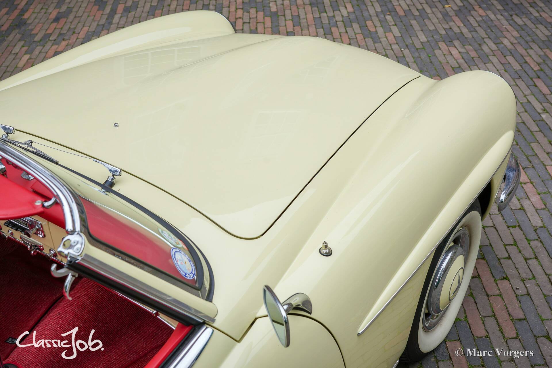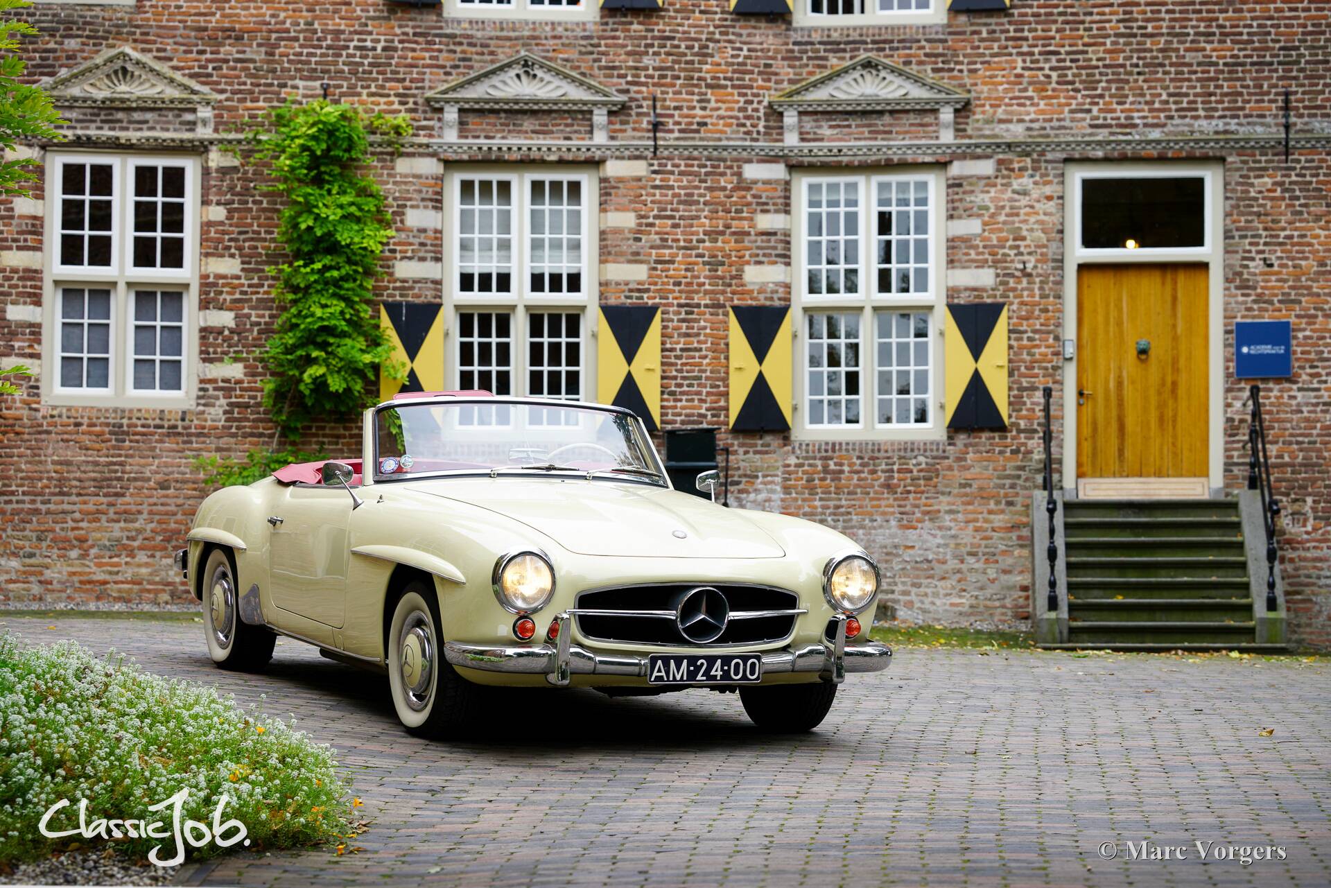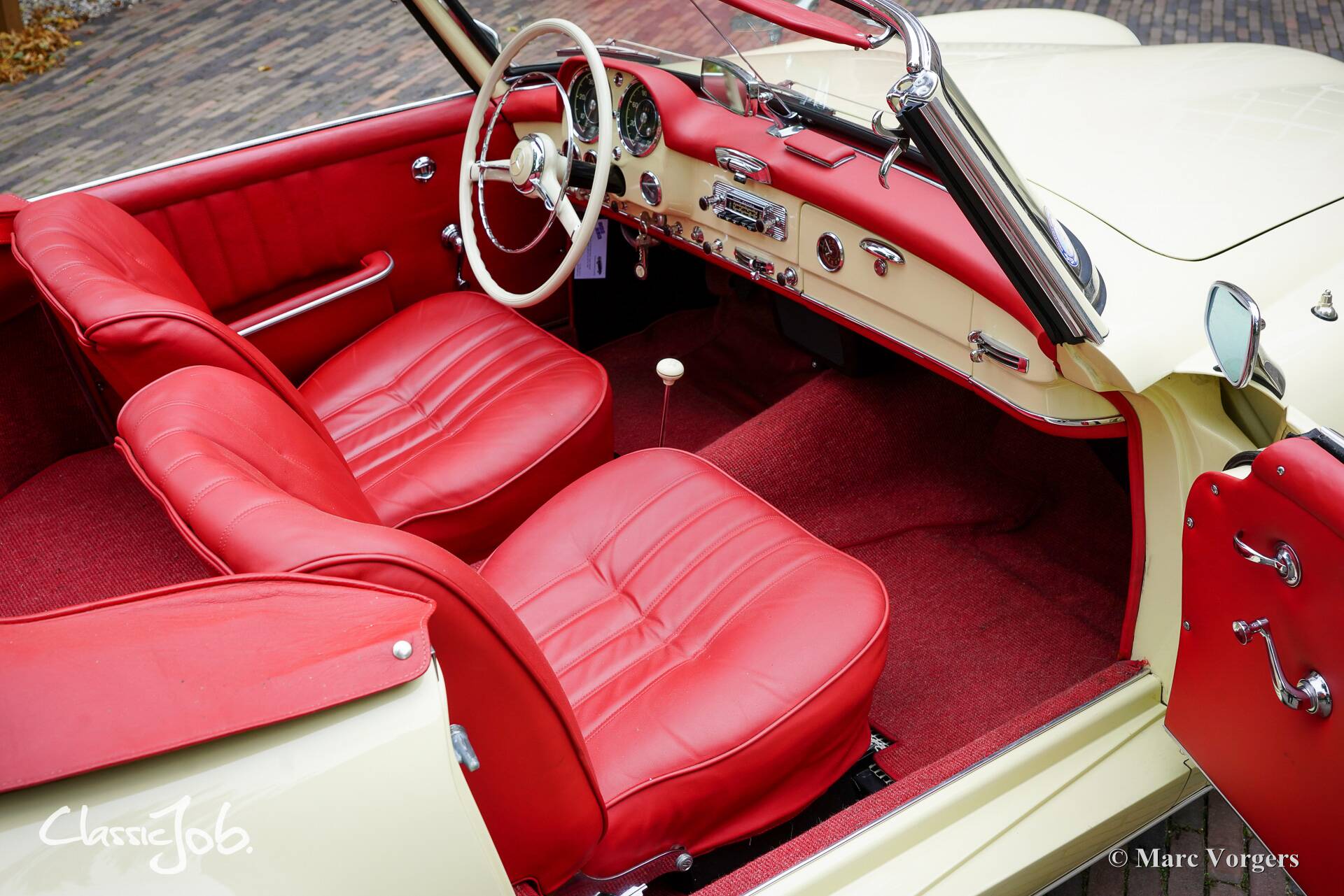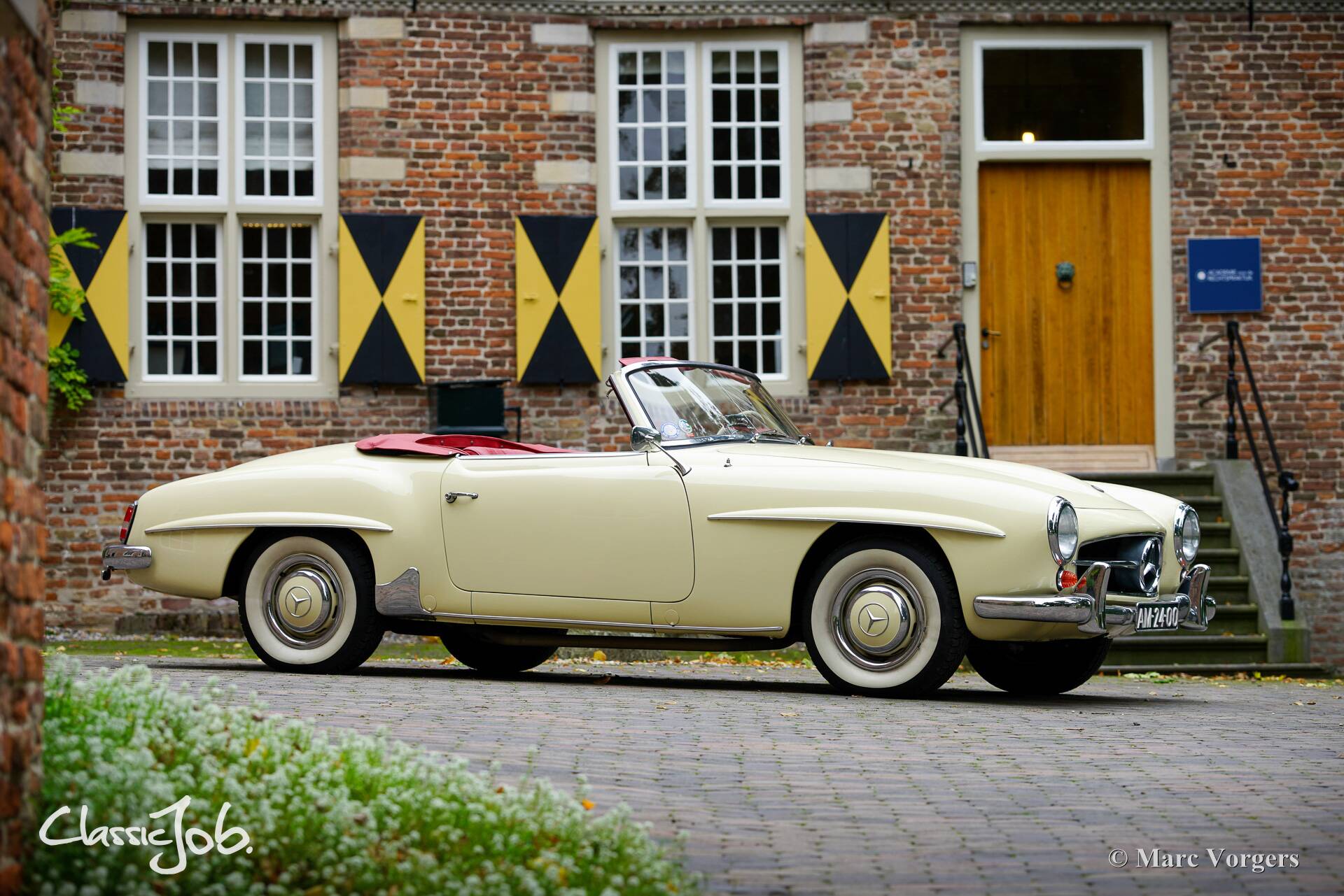 Mercedes-Benz 190 SL, bouwjaar 1959. Chassisnummer 121040-10-9500466. Kleur ivoor (wij vermoeden Elfenbein DB608) gecombineerd met een roodlederen interieur en beige tapijt. Deze prachtige Mercedes-Benz 190 SL werd voor het eerst geregistreerd op 28 februari 1959 en de auto werd op 7 november 2006 naar Nederland geïmporteerd. Ongeveer tien jaar geleden werd de auto uitgebreid gerestaureerd tot concoursstaat! De auto verkeert nog steeds in een prachtige topconditie! De auto toont prachtige originele details en vertoont slechts de kleinste gebruikssporen. Deze prachtige Mercedes 190 SL is in juni 2021 door de huidige eigenaar gekocht en onderhouden door Mercedes-Benz SL-specialist van Dijk in Nederland, waar ook een prachtige Becker Europa-radio is ingebouwd. De Mercedes-Benz 190 SL werd voor het eerst als prototype gepresenteerd op de International Motor Sports Show in New York op 6 februari 1954. Dit debuut werd geïnitieerd door de Amerikaanse importeur Max Hoffman. De productieversie werd in maart 1955 geïntroduceerd op de autosalon van Genève. De Mercedes-Benz 190 SL is een sierlijke tweezits roadster, ontworpen als een toegankelijkere aanvulling op de toen en nu zeer dure zescilinder 300 SL sport-/racewagen. De 190 SL biedt een verfijnde styling en een comfortabele reiservaring in plaats van pure prestaties. Dit prachtige exemplaar is tot een zeer hoge standaard gerestaureerd en de auto verkeert in een sublieme staat. Een geweldig exemplaar voor de veeleisende Mercedes-Benz liefhebber/verzamelaar. Deze auto is alleen op afspraak beschikbaar voor bezichtiging en een testrit.