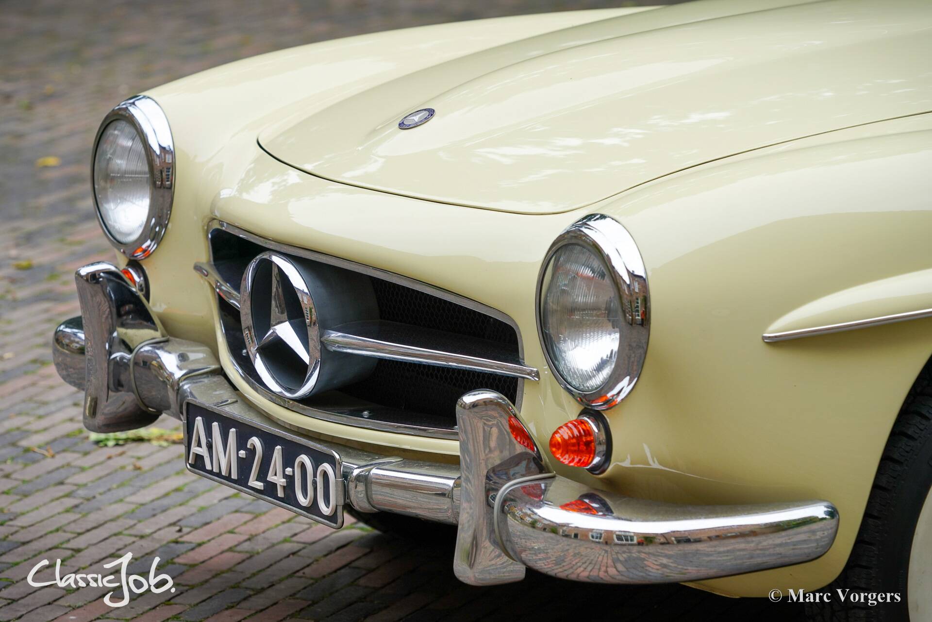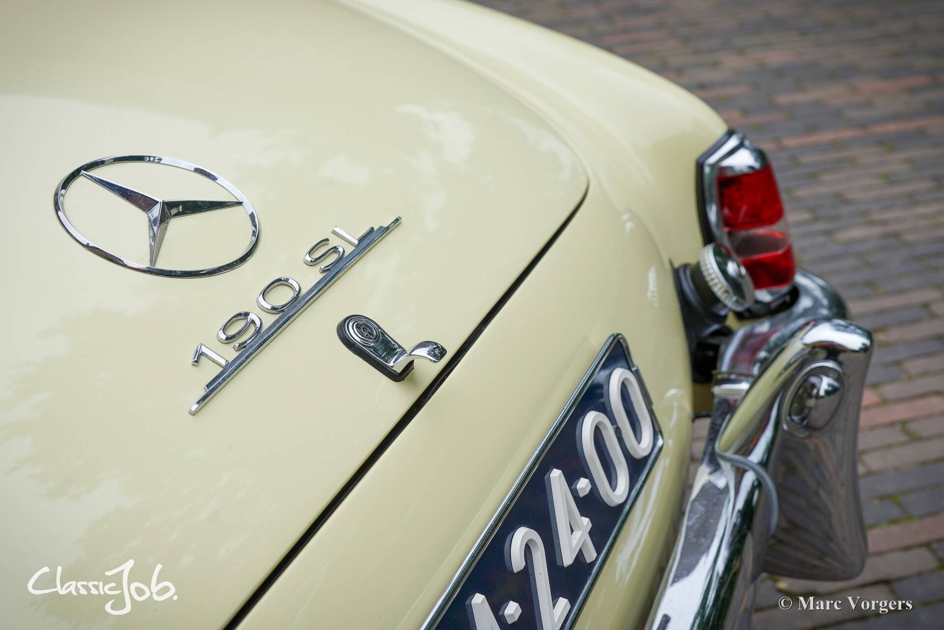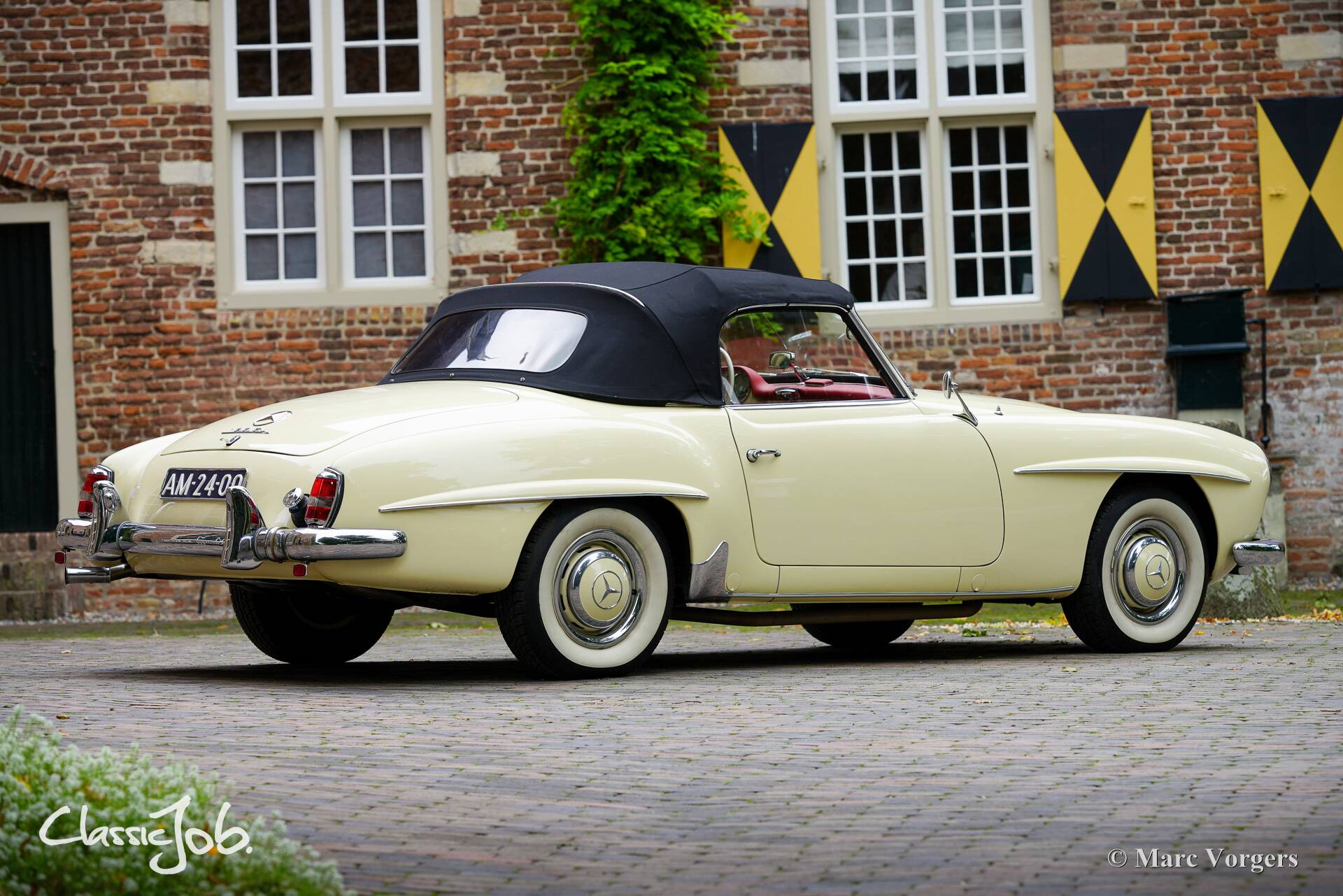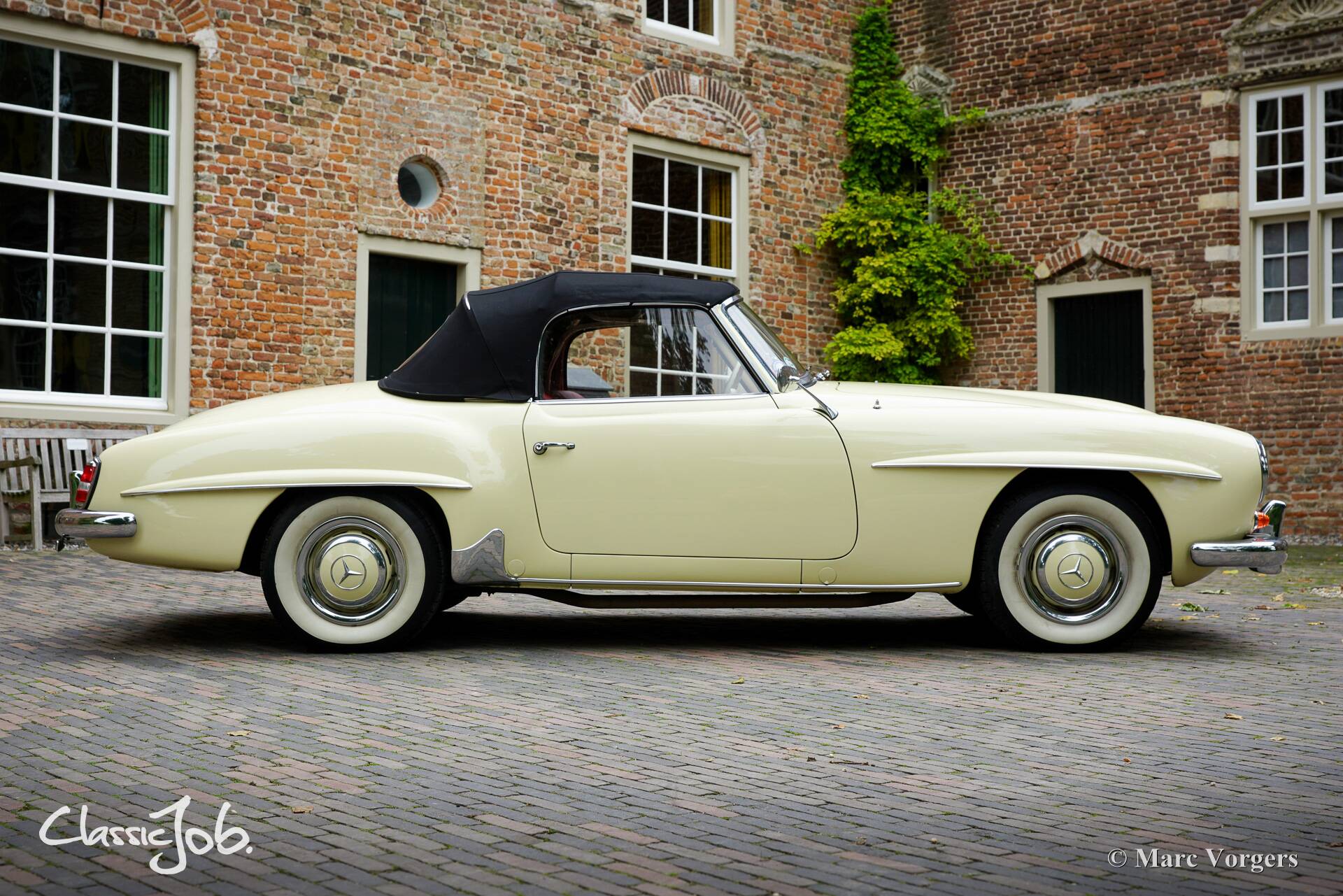 Mercedes-Benz 190 SL, bouwjaar 1959. Chassisnummer 121040-10-9500466. Kleur ivoor (wij vermoeden Elfenbein DB608) gecombineerd met een roodlederen interieur en beige tapijt. Deze prachtige Mercedes-Benz 190 SL werd voor het eerst geregistreerd op 28 februari 1959 en de auto werd op 7 november 2006 naar Nederland geïmporteerd. Ongeveer tien jaar geleden werd de auto uitgebreid gerestaureerd tot concoursstaat! De auto verkeert nog steeds in een prachtige topconditie! De auto toont prachtige originele details en vertoont slechts de kleinste gebruikssporen. Deze prachtige Mercedes 190 SL is in juni 2021 door de huidige eigenaar gekocht en onderhouden door Mercedes-Benz SL-specialist van Dijk in Nederland, waar ook een prachtige Becker Europa-radio is ingebouwd. De Mercedes-Benz 190 SL werd voor het eerst als prototype gepresenteerd op de International Motor Sports Show in New York op 6 februari 1954. Dit debuut werd geïnitieerd door de Amerikaanse importeur Max Hoffman. De productieversie werd in maart 1955 geïntroduceerd op de autosalon van Genève. De Mercedes-Benz 190 SL is een sierlijke tweezits roadster, ontworpen als een toegankelijkere aanvulling op de toen en nu zeer dure zescilinder 300 SL sport-/racewagen. De 190 SL biedt een verfijnde styling en een comfortabele reiservaring in plaats van pure prestaties. Dit prachtige exemplaar is tot een zeer hoge standaard gerestaureerd en de auto verkeert in een sublieme staat. Een geweldig exemplaar voor de veeleisende Mercedes-Benz liefhebber/verzamelaar. Deze auto is alleen op afspraak beschikbaar voor bezichtiging en een testrit.