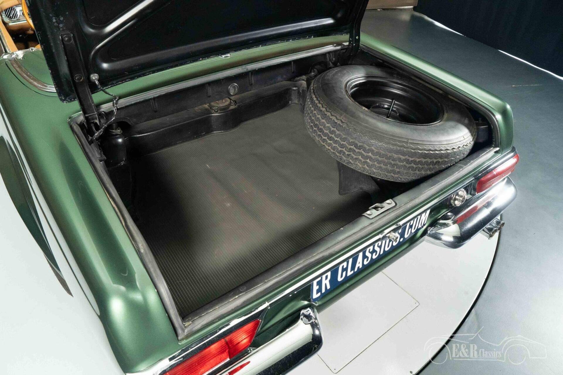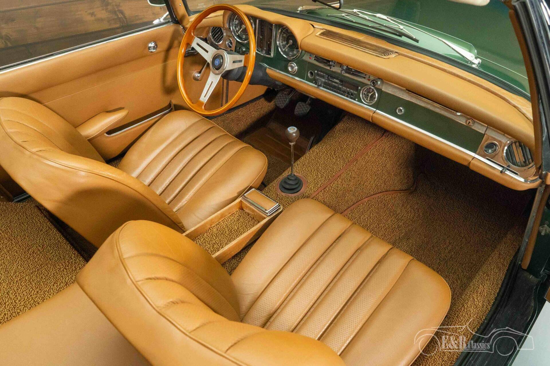 Het groen metallic lakwerk straalt elegantie en klasse uit, en vormt een harmonieus geheel met het warme, bruine interieur. Het chroomwerk, de originele wieldoppen en de zwarte soft top maken het geheel compleet. Van binnen ademt deze SL pure jaren ’60 luxe, met gerestaureerde bekleding, een klassiek stuurwiel in hout-look en bijpassende tapijten. De combinatie van het rijke bruin en de diepe groene carrosserie zorgt voor een tijdloze en stijlvolle uitstraling die je zelden ziet.