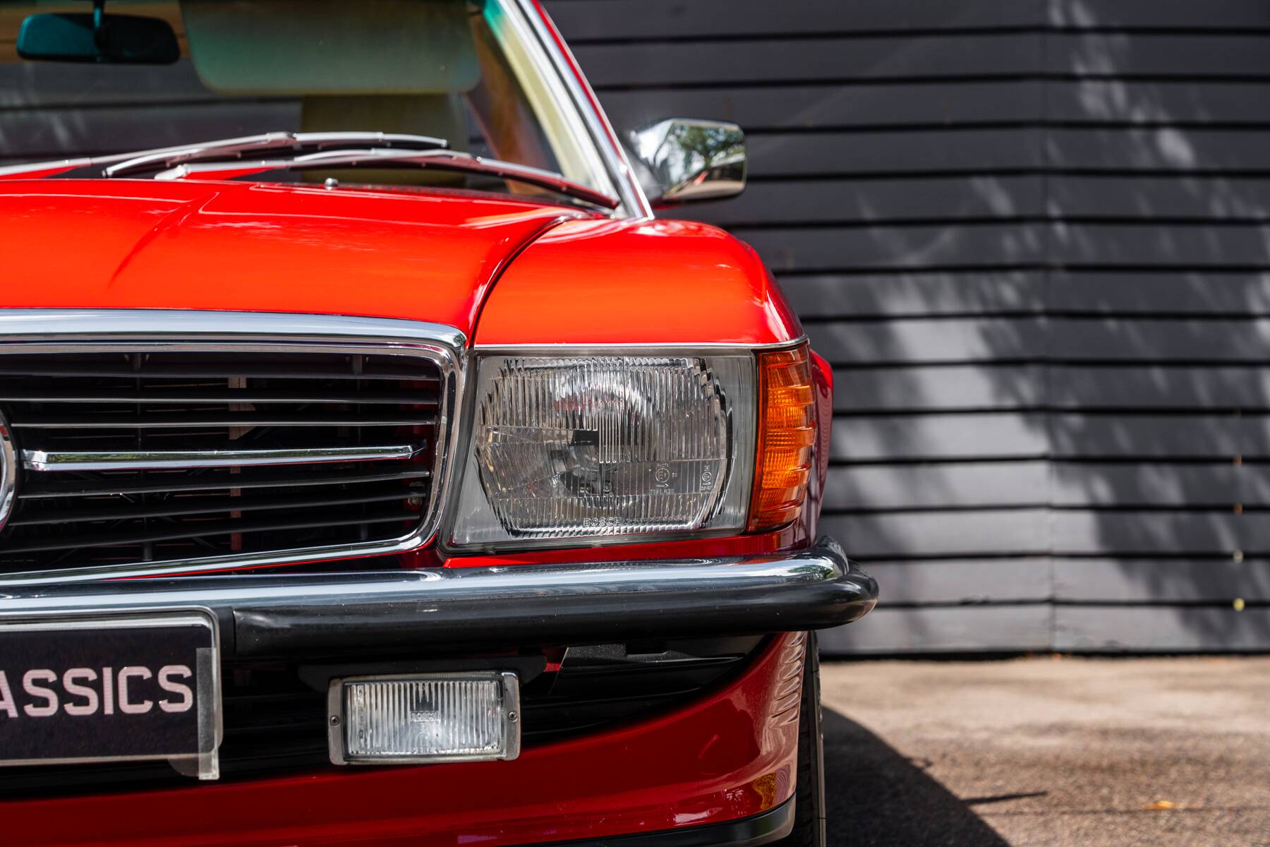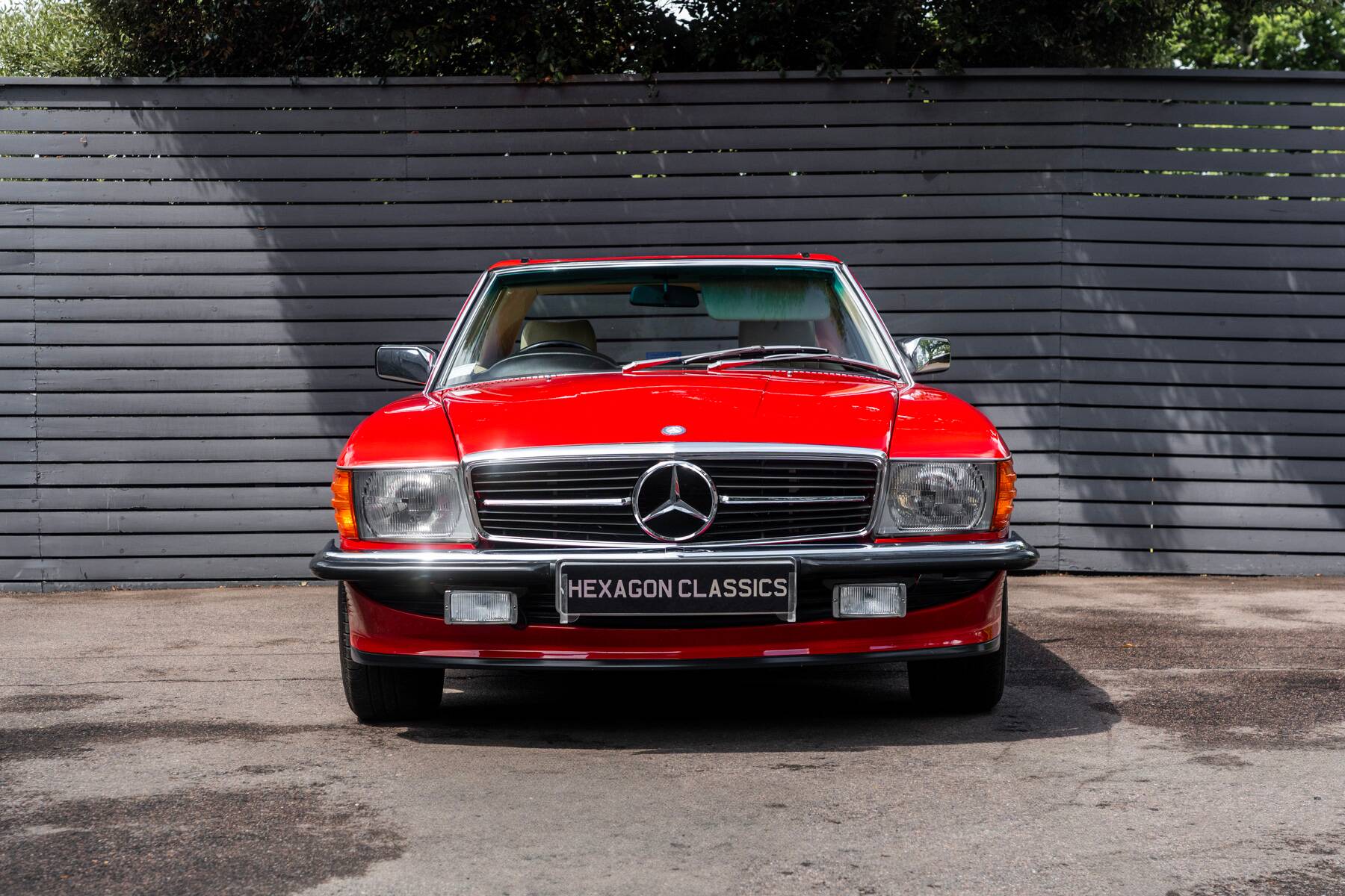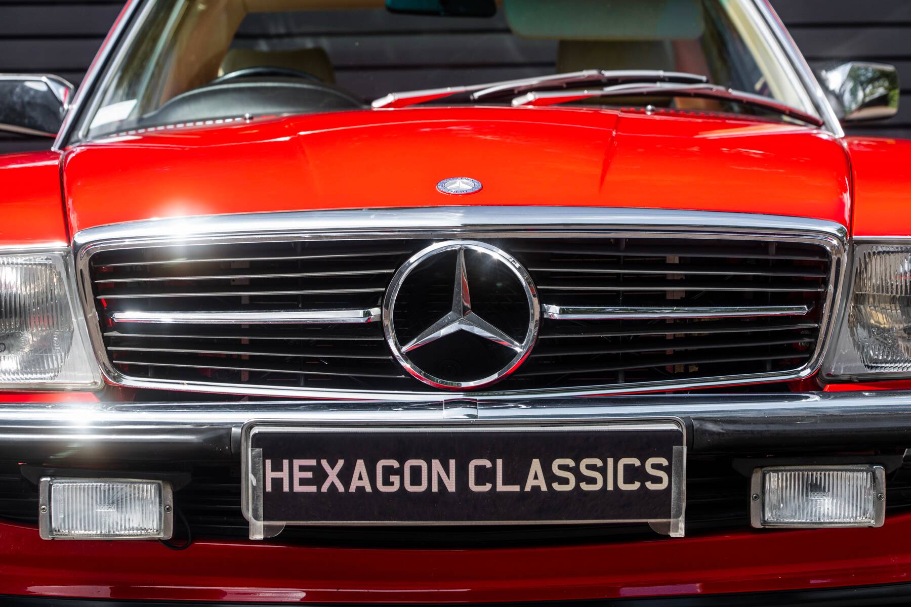 Hexagon Classics are delighted to present this superbly specified, low mileage, late-production Mercedes-Benz 300SL (R107) model, finished in the classic and sought-after combination of Signal Red with Mushroom leather interior. This elegant roadster represents one of the final evolutions of the iconic R107 series and benefits from all the refinements and improvements made over the model’s impressive 18-year production run.