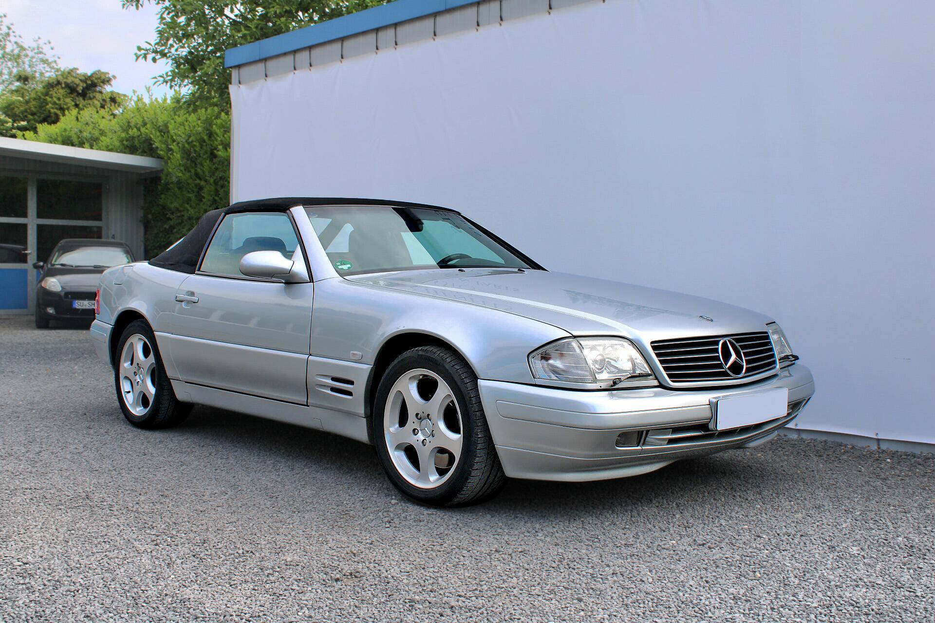 Die Lackierung in Brillantsilber-Metallic (Farbcode 744) unterstreicht die klare Linienführung des R129 und verleiht dem Fahrzeug eine zeitlose Eleganz. Das schwarze Stoffverdeck befindet sich laut Angaben in sehr gutem Zustand und zeigt keine Risse. Insgesamt vermittelt das Exterieur einen gepflegten Eindruck, der zur Nutzung als Schönwetterfahrzeug passt.