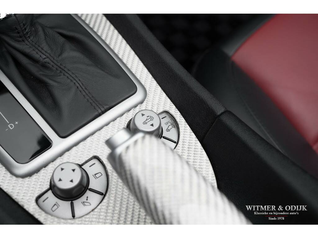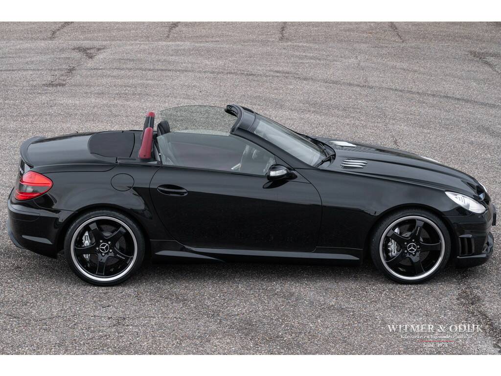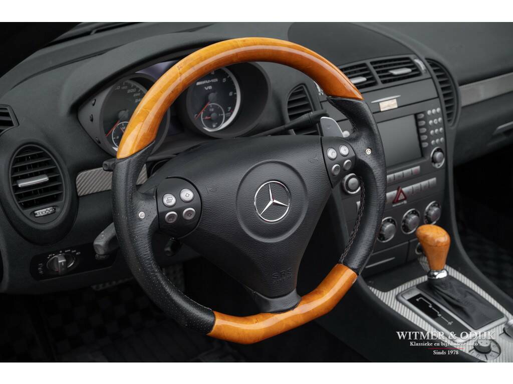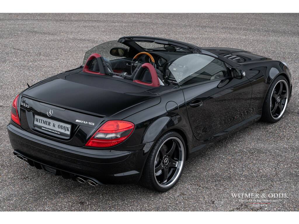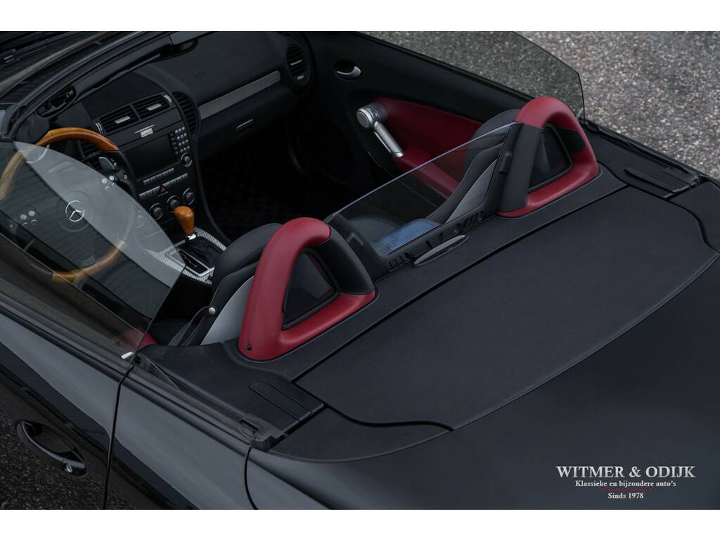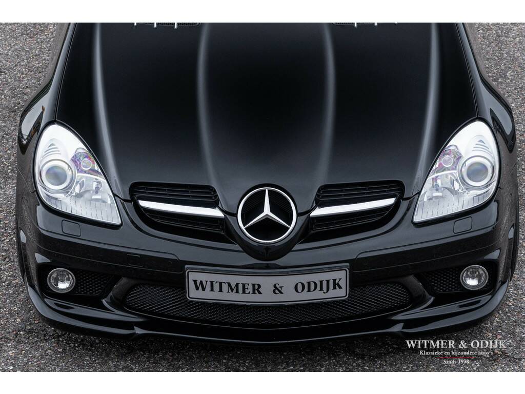Een V8 in een roadster van dit formaat? 'Wir schaffen das' zeiden ze destijds al met vooruitziende blik bij AMG in Affalterbach.. Geen van de concurrenten bood een vergelijkbare motorisering in die tijd.. Tegenwoordig mag je al blij zijn als er een drie-pitter onder de motorkap huist. Het topmodel uit de SLK serie kreeg van AMG die heerlijke V8 in het vooronder, 360pk ging er naar de achterwielen met een even indrukwekkend koppel van 510Nm. Natuurlijk werden het differentieel, onderstel en de remmen daarop aangepast. Geperforeerde remschijven van 34cm aan de voorzijde, dikke stabilisatorstangen en bijv. de aerodynamische bumpers beteugelde de capaciteiten van de indrukwekkende motor. Alleen het motorgeluid werd wat minder onder controle gehouden, wat een heerlijke roffel komt er uit die vier pijpen! Sommige eigenaren waren zo enthousiast over hun nieuwe aanwinst dat ze hun SLK nog leuker maakte. Dure Carlsson velgen, carbon spoiler achter, two-tone interieur, premium stereo, Designo details en meer leuke extra's om de aankoop van deze SLK te vieren werden besteld. Deze SLK is afkomstig uit een verzameling, maakte daarom weinig kilometers en werd zichtbaar fanatiek verzorgd. In prachtig Obsidian Black zonder gebruikssporen. Foutloos interieur en in nieuwstaat zijnde velgen. Aantrekkelijk geprijsd dus wie net zo snel is als deze SLK... die heeft straks misschien Fernando Alonso of Kimi Räikkönen in zijn spiegel. In die tijd was de SLK55 AMG de safetycar in de F1, klein beetje aangepast natuurlijk.
