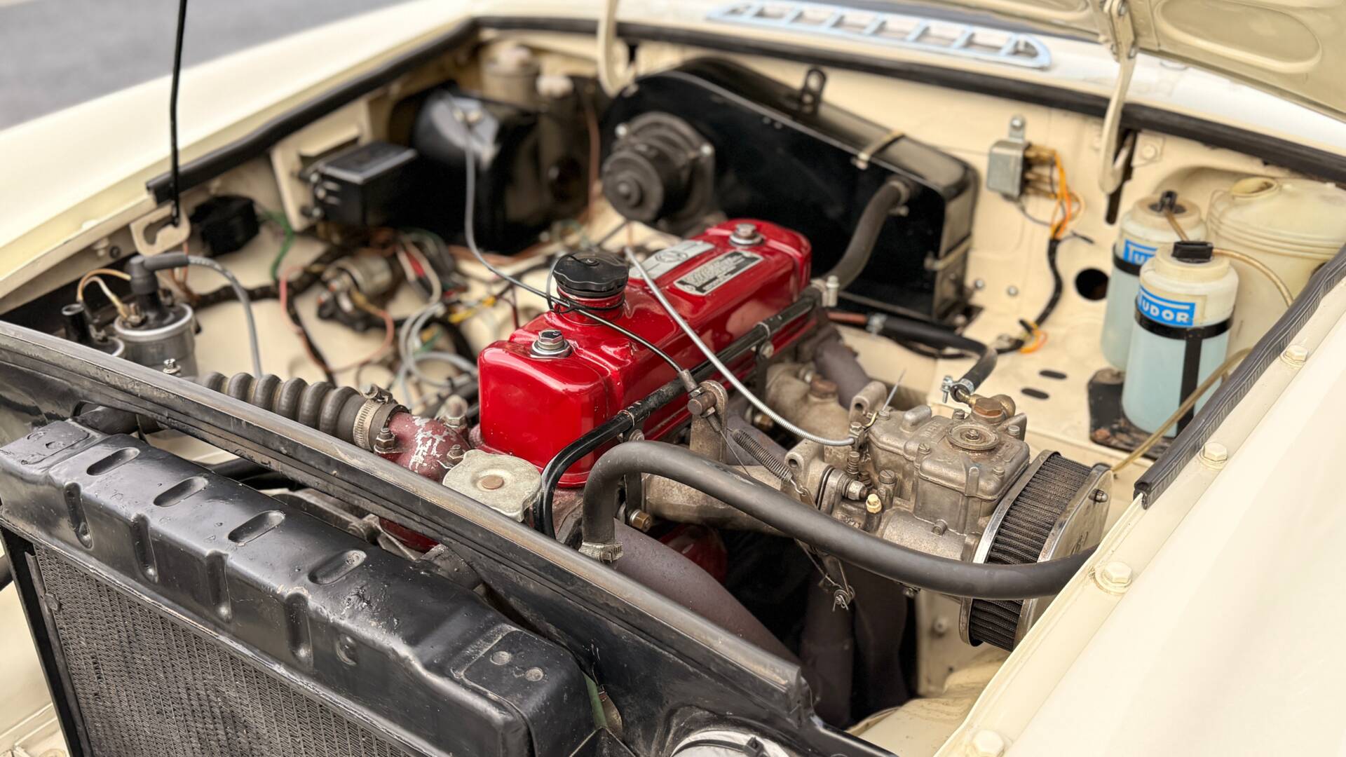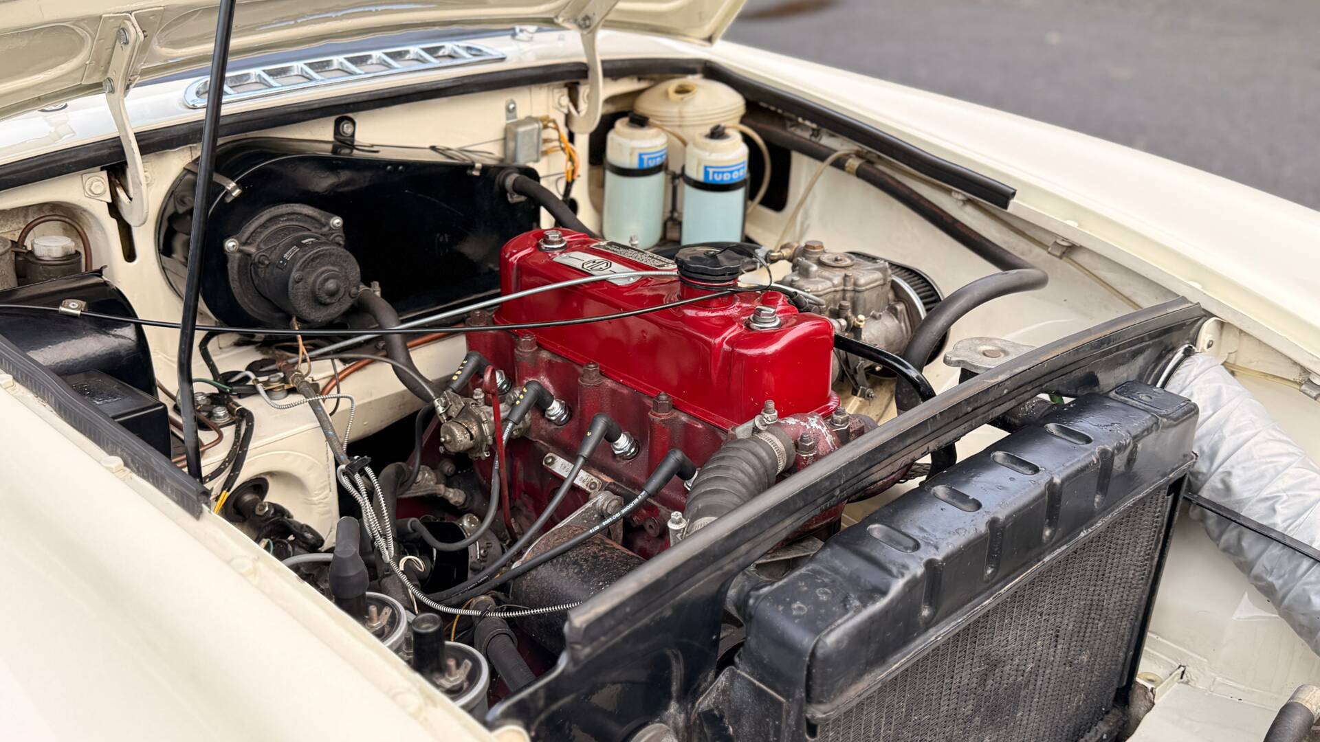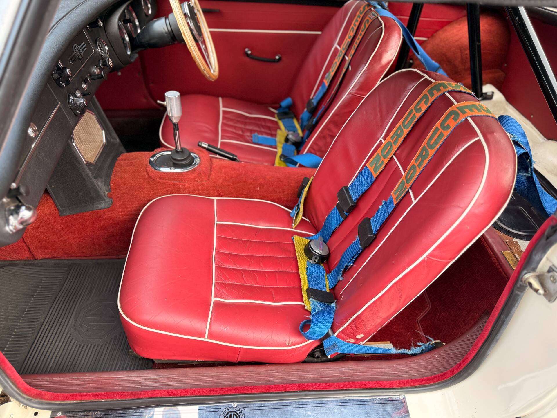 The gearbox was also rebuilt with over-drive, the interior has re-trimmed with red seats and three-point harnesses plus an FIA rollbar also added. Uprated suspension also included Antiroll bars new springs and new wheels. A very solid body painted Old English White above and below. This work being carried out by Marden Coachworks costing £5k for a Bare-Metal rebuild in the 90’s