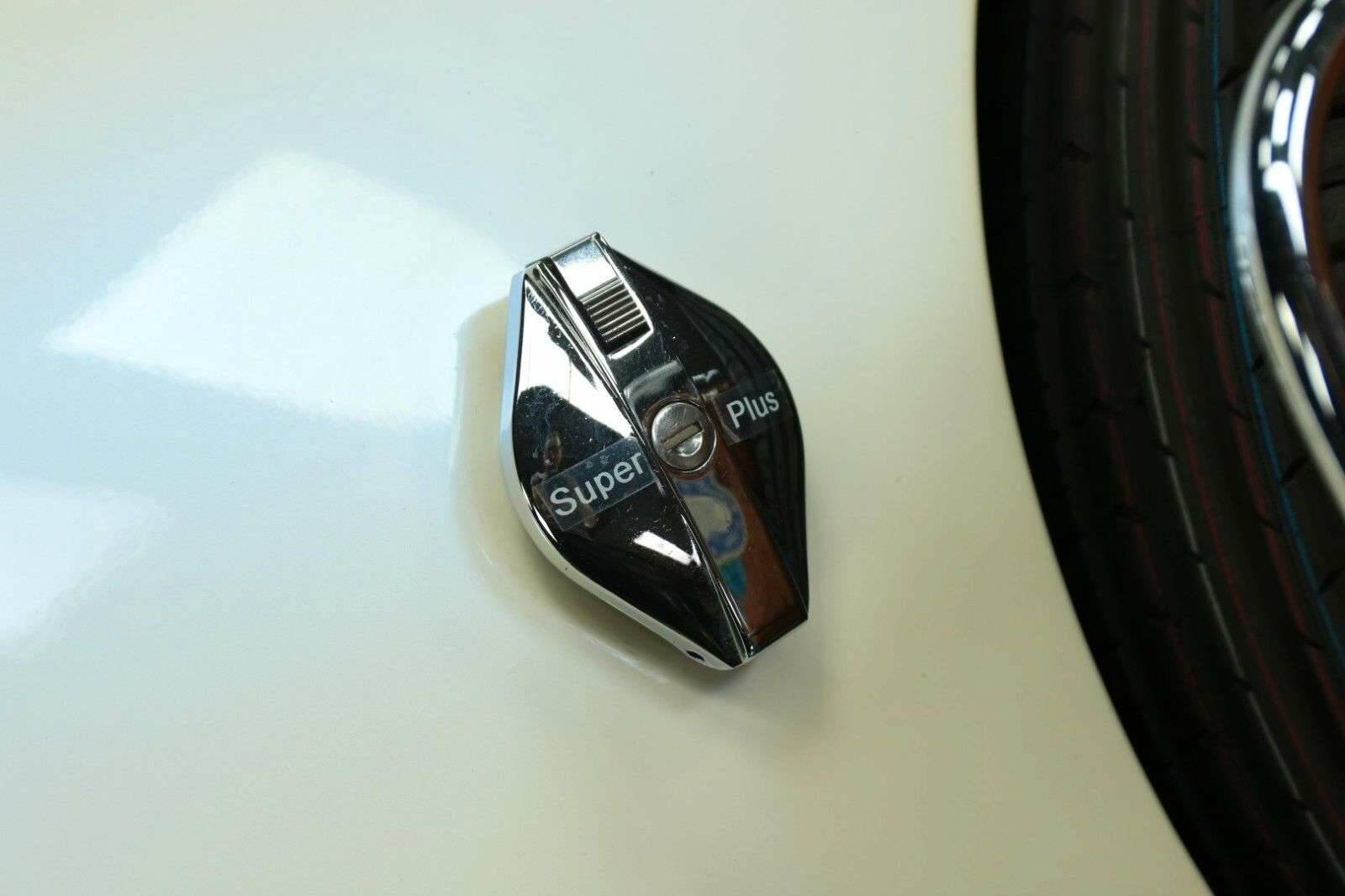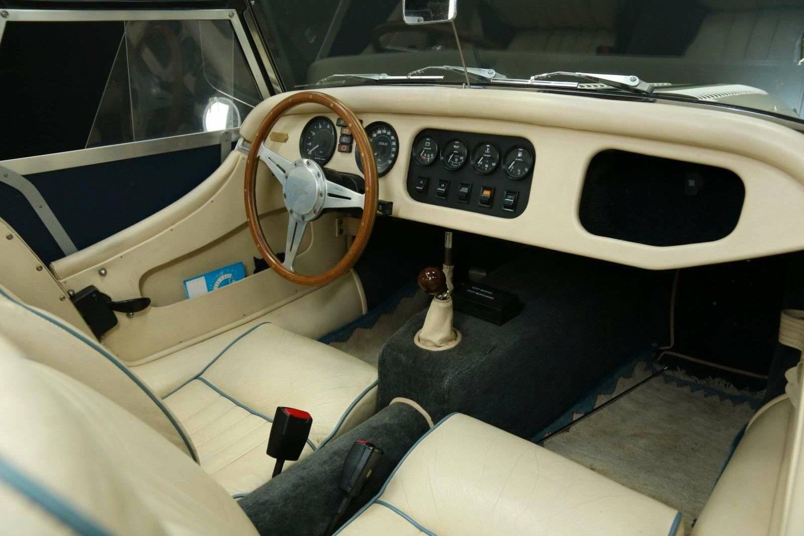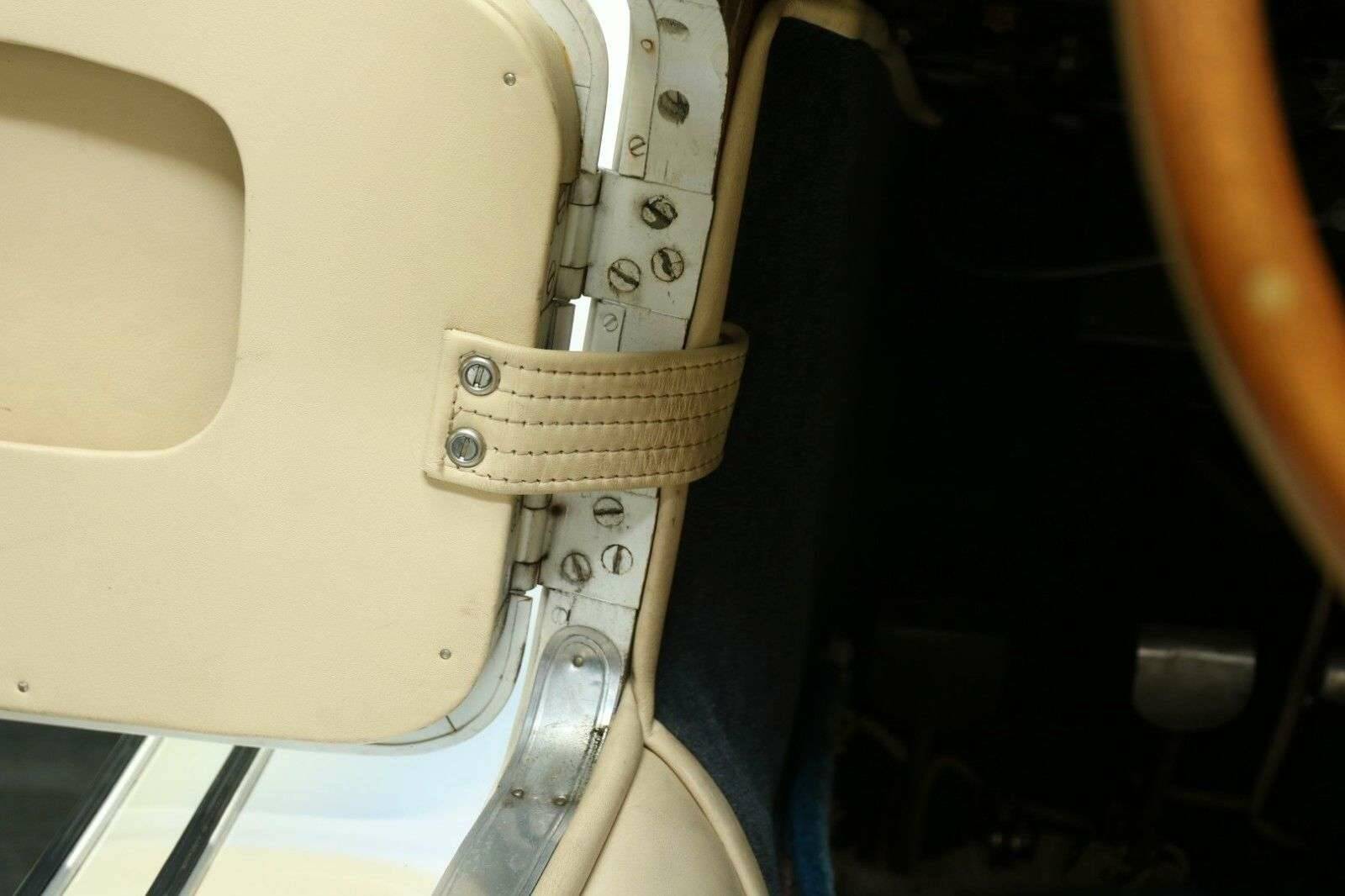 Die Lackierung harmoniert sehr gut mit der Lederfarbe, als farbliche Akzente setzen sich das leichte blaue Verdeck, die ebenfalls blauen Keder und auch der blaue Teppich wunderbar ab.