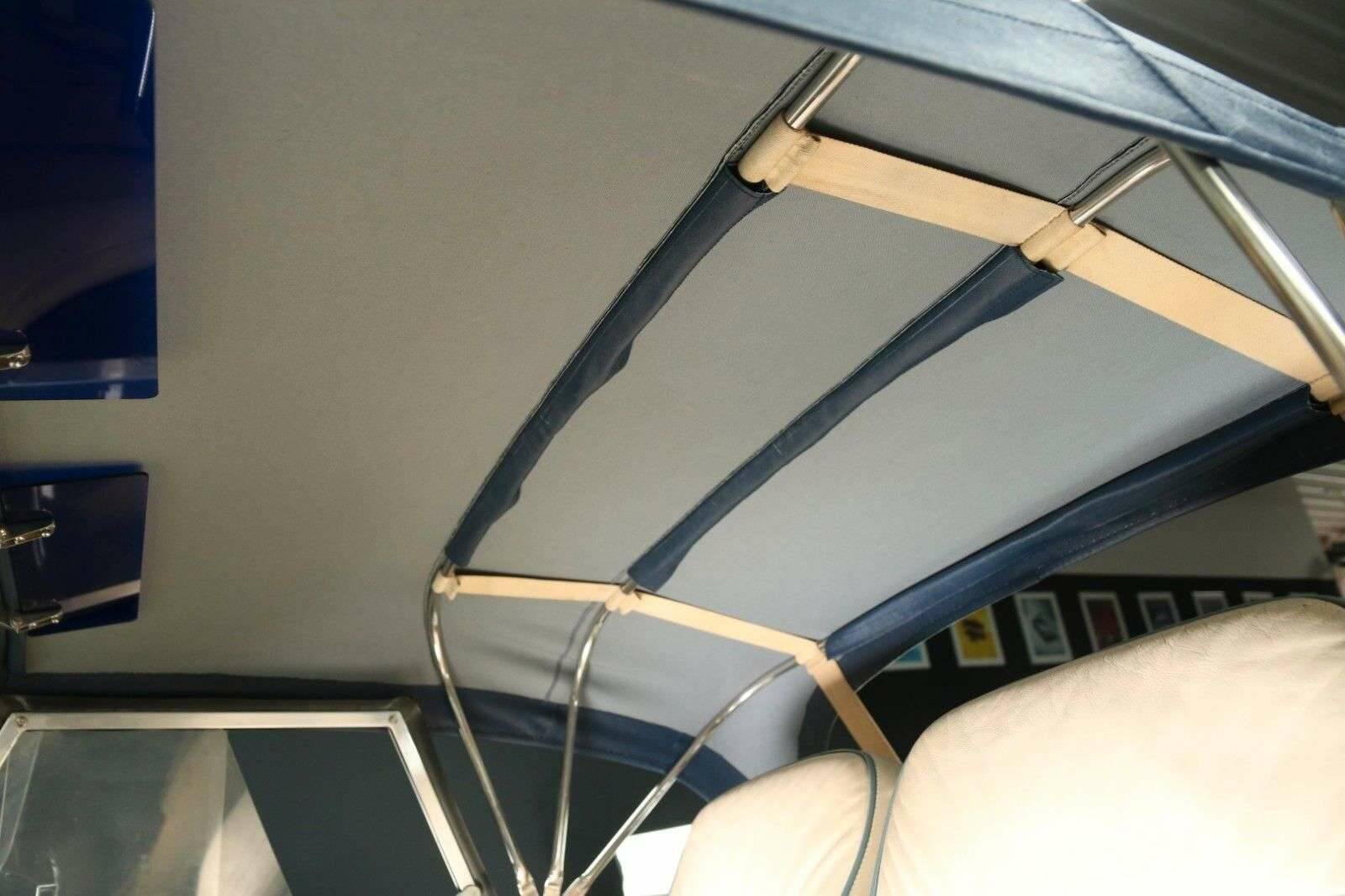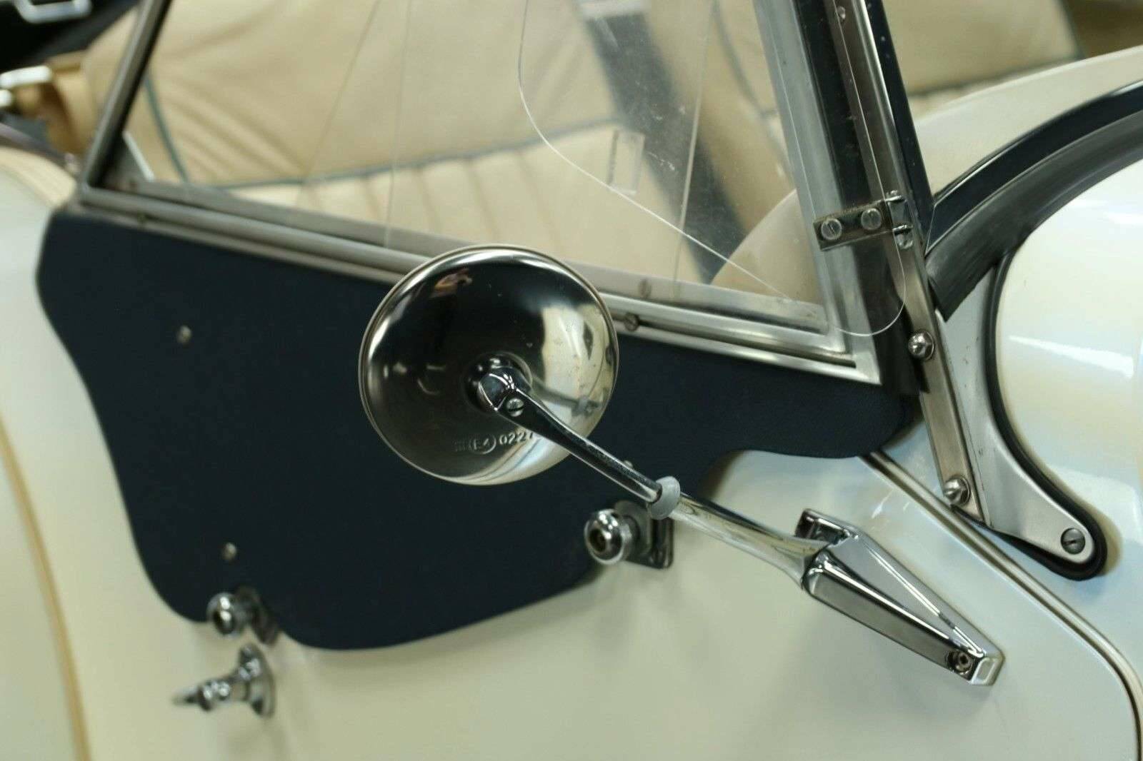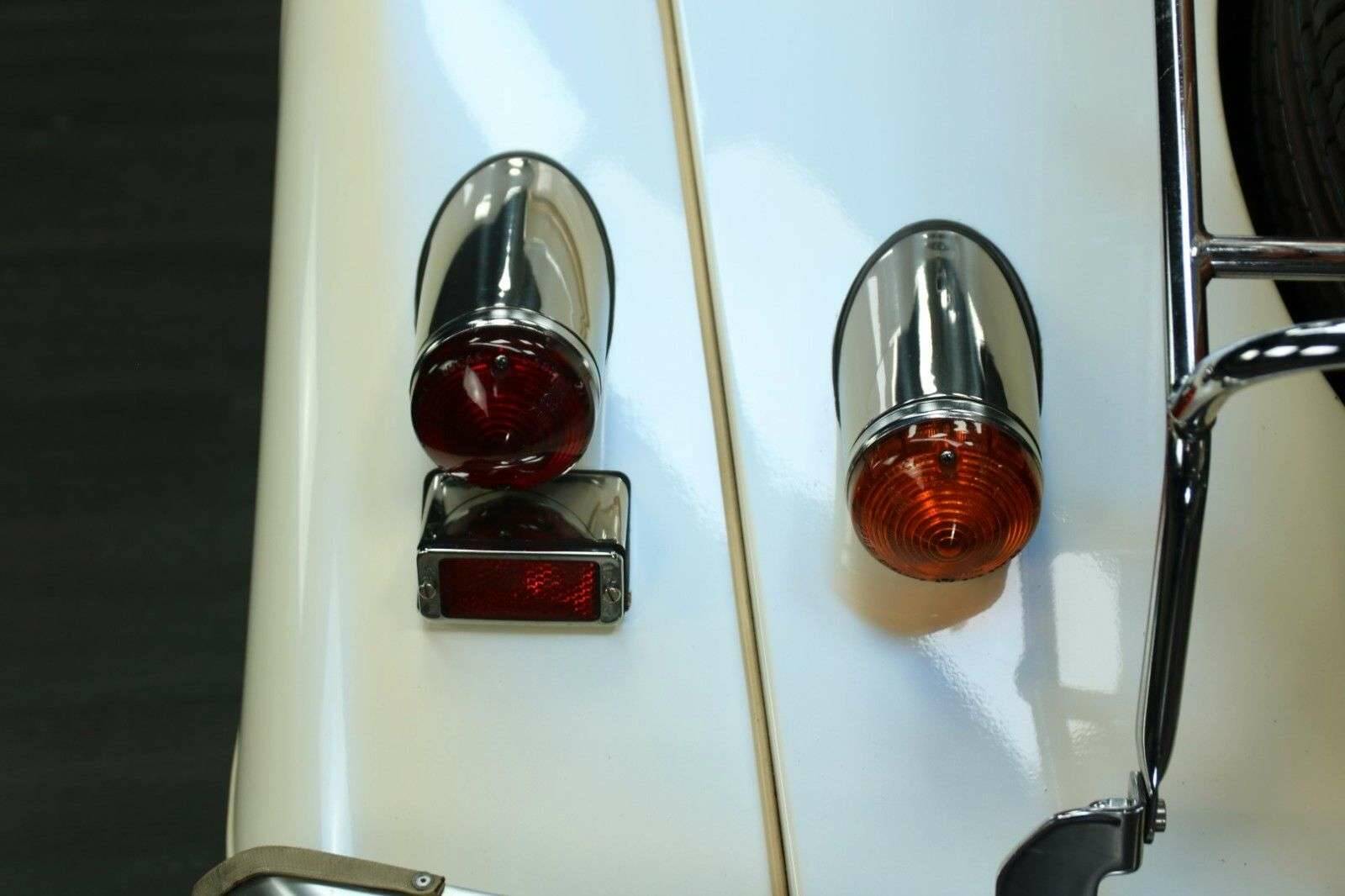 Die Lackierung harmoniert sehr gut mit der Lederfarbe, als farbliche Akzente setzen sich das leichte blaue Verdeck, die ebenfalls blauen Keder und auch der blaue Teppich wunderbar ab.