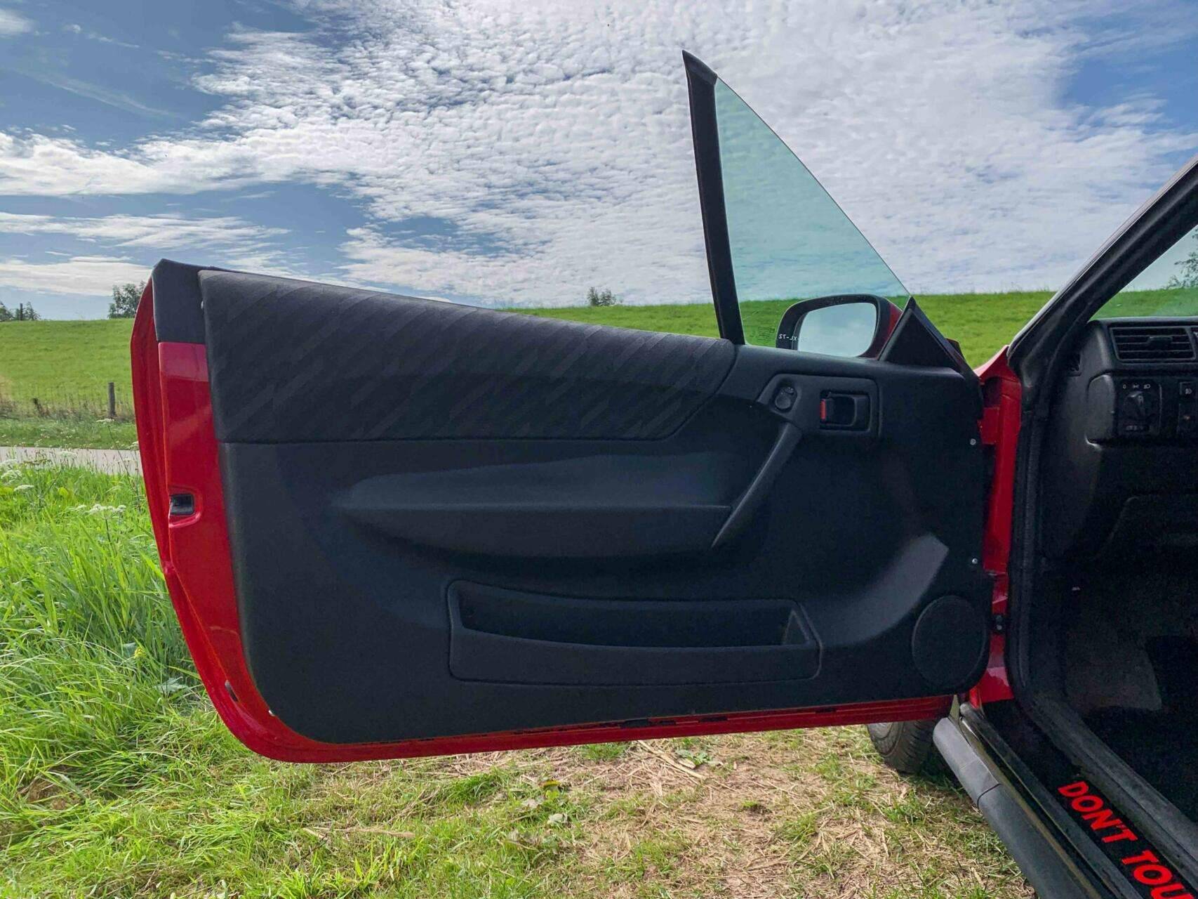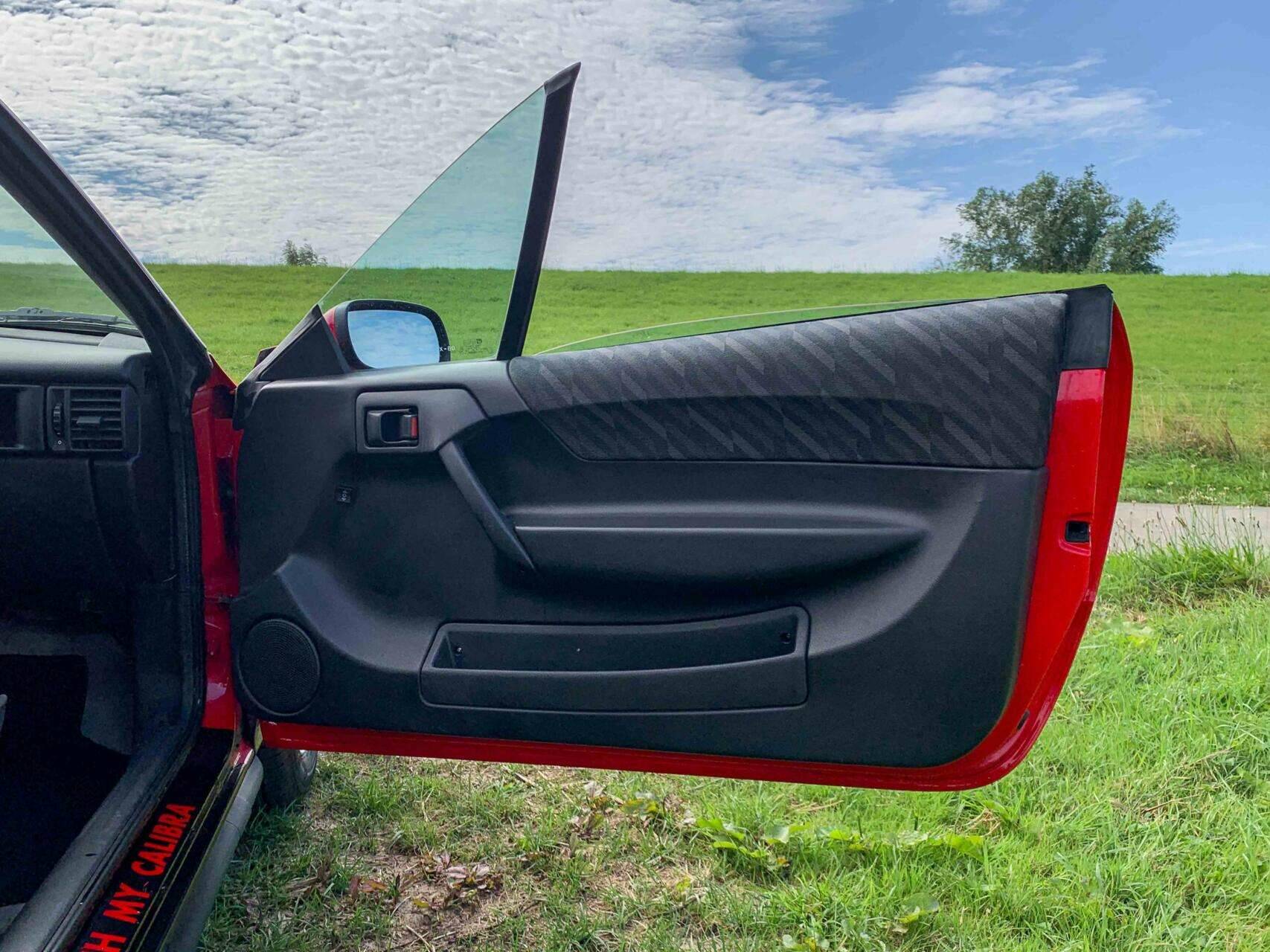 De Calibra wordt gepresenteerd in felrood, versterkt door zwarte dubbele racestrepen die het gestroomlijnde profiel accentueren. De lak is in rijdersconditie met kleine imperfecties die passen bij de leeftijd en het gebruik. Kenmerkende designelementen zoals de vlakke koplampen, de spiegels in carrosseriekleur en de geïntegreerde achterspoiler geven dit model zijn onmiskenbare jaren 90-karakter.