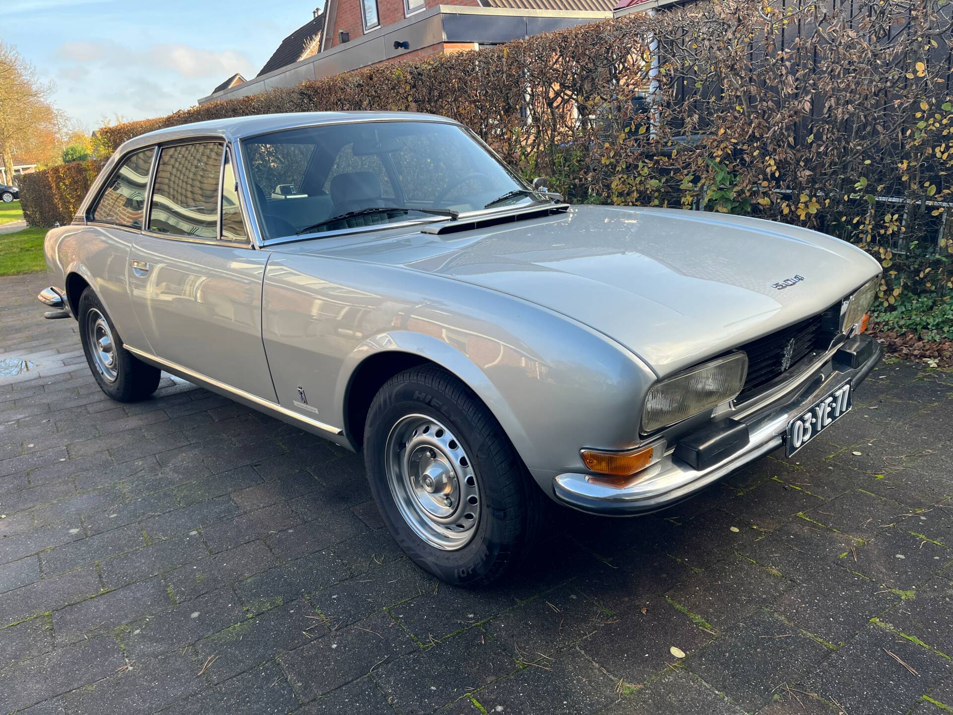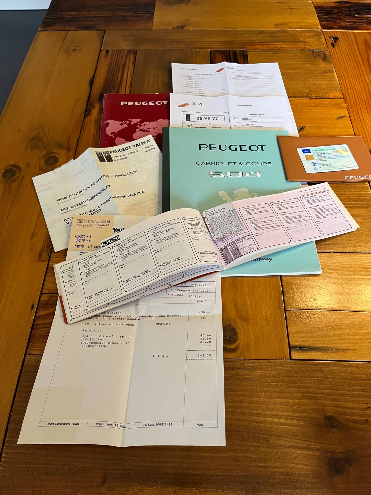 Deze Peugeot 504 Coupe V6 Automatique (C33) werd voor het eerst toegelaten in Liechtenstein in september 1975. De auto werd in de jaren 90 aangekocht door een garagehouder (familiebedrijf) in Märstetten in Zwitserland, destijds Peugeot dealer. Na een uitvoerig onderhoud en gedeeltelijke restauratie (o.a. nieuwe voorschermen, dorpels en nieuwe lak) is de auto voor meer dan 25 jaar in de Tiefgarage van dit bedrijf opgeslagen, zonder te worden gereden. De auto werd uitgeschreven uit het Liechtensteins Verkeersregister op 1 december 1990, maar nooit Zwitsers geregistreerd. In 2022 kwam de auto in mijn bezit. Inmiddels is de Peugeot volledig rijklaar gemaakt en op Nederlands kenteken gezet. De kleur is Gris-Argento Mét. (HB1399) met bijpassend blauw velours interieur. Om de auto RDW goedgekeurd te krijgen is o.a. het complete remsysteem gereviseerd, de uitlaat vernieuwd (RVS) en zijn nieuwe, iets bredere banden gemonteerd (195/70R14). Tevens moest het ontstekingssysteem inclusief accu worden vernieuwd, het stuurhuis gereviseerd en zijn alle vloeistoffen en filters vervangen. Een nieuwe brandstofpomp is gemonteerd en is een handmatige choke geïnstalleerd. De afgelezen km stad is 650 km, echter het complete instrumentenpaneel werd op 30 oktober 2025 vervangen wegens diverse elektrische defecten. De verwijderde, maar nog werkende teller gaf toen 13565 km aan en aangenomen wordt dat de totale km stand daarmee 113563 km is (telwerk kent slechts 5 cijfers).