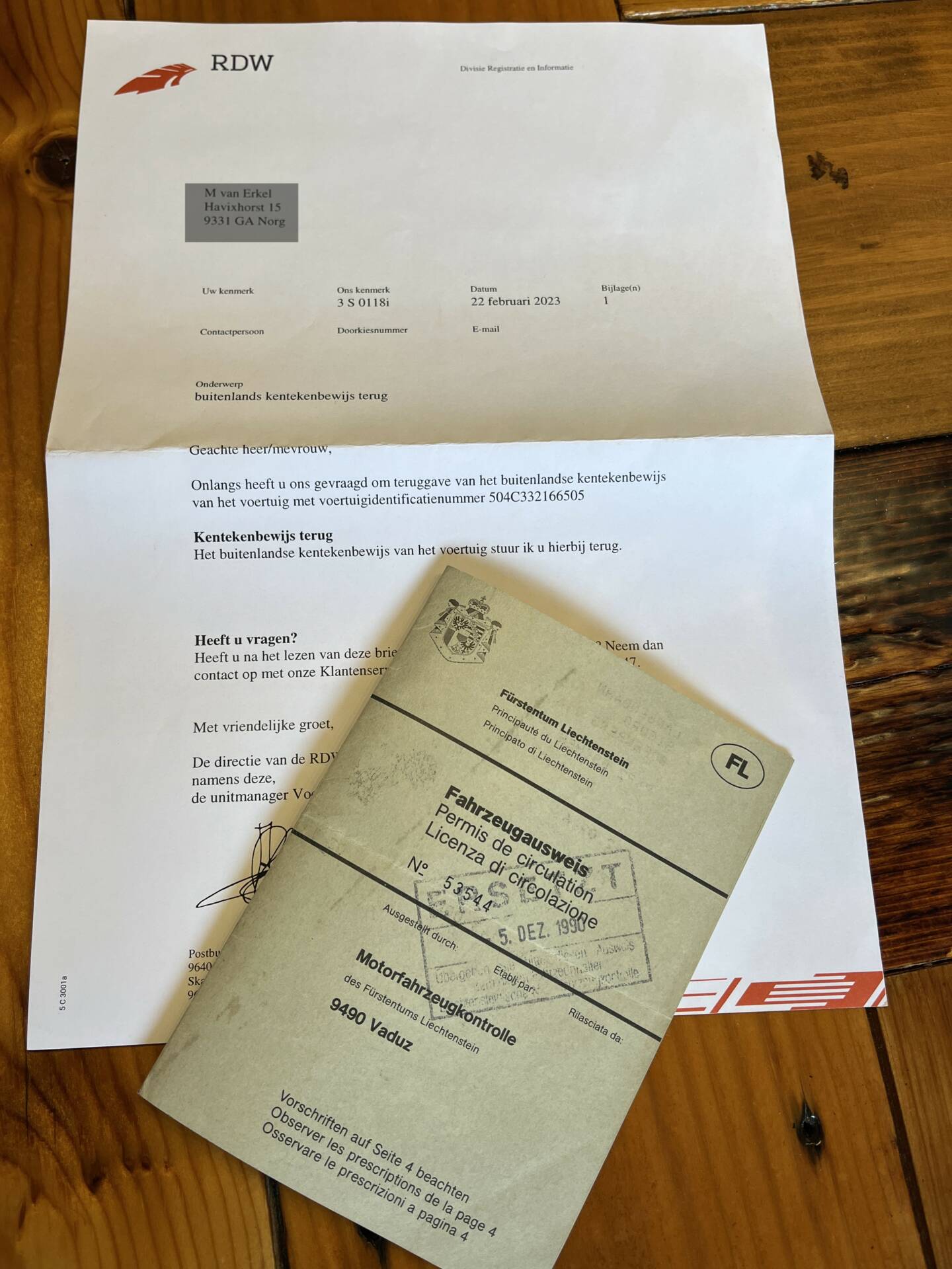 Het originele onderhoudsboekje alsook het Liechtensteins kentekenbewijs is nog bij de auto.