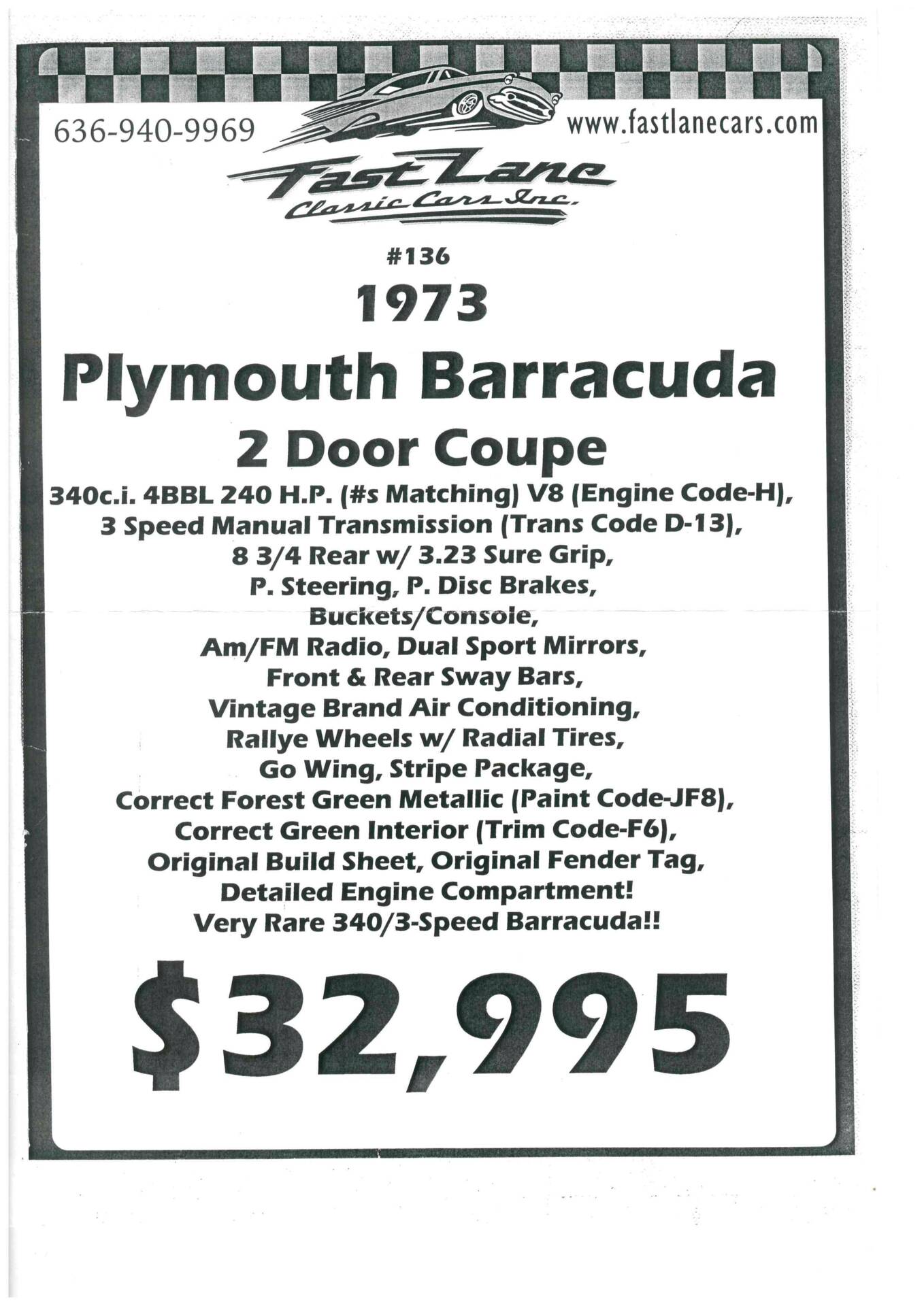 Zum Verkauf steht ein schöner Plymouth Barracuda 340 aus dem Jahr 1973. Ein klassischer amerikanischer Muscle Car mit dem kräftigen 340 V8, der nicht nur gut aussieht, sondern auch richtig Spass macht zu fahren.