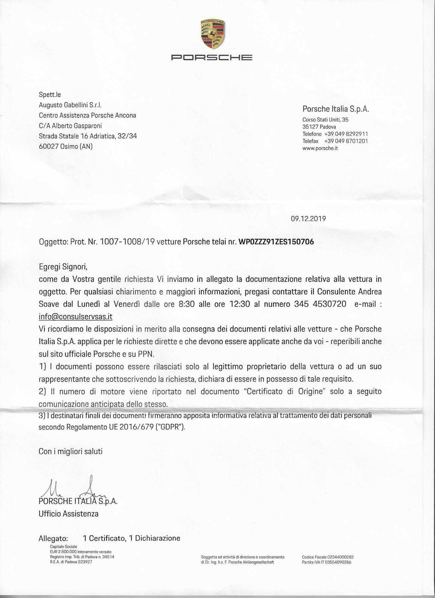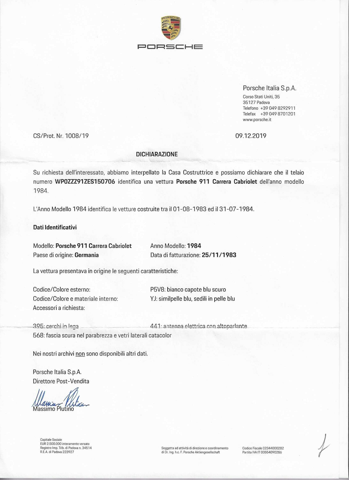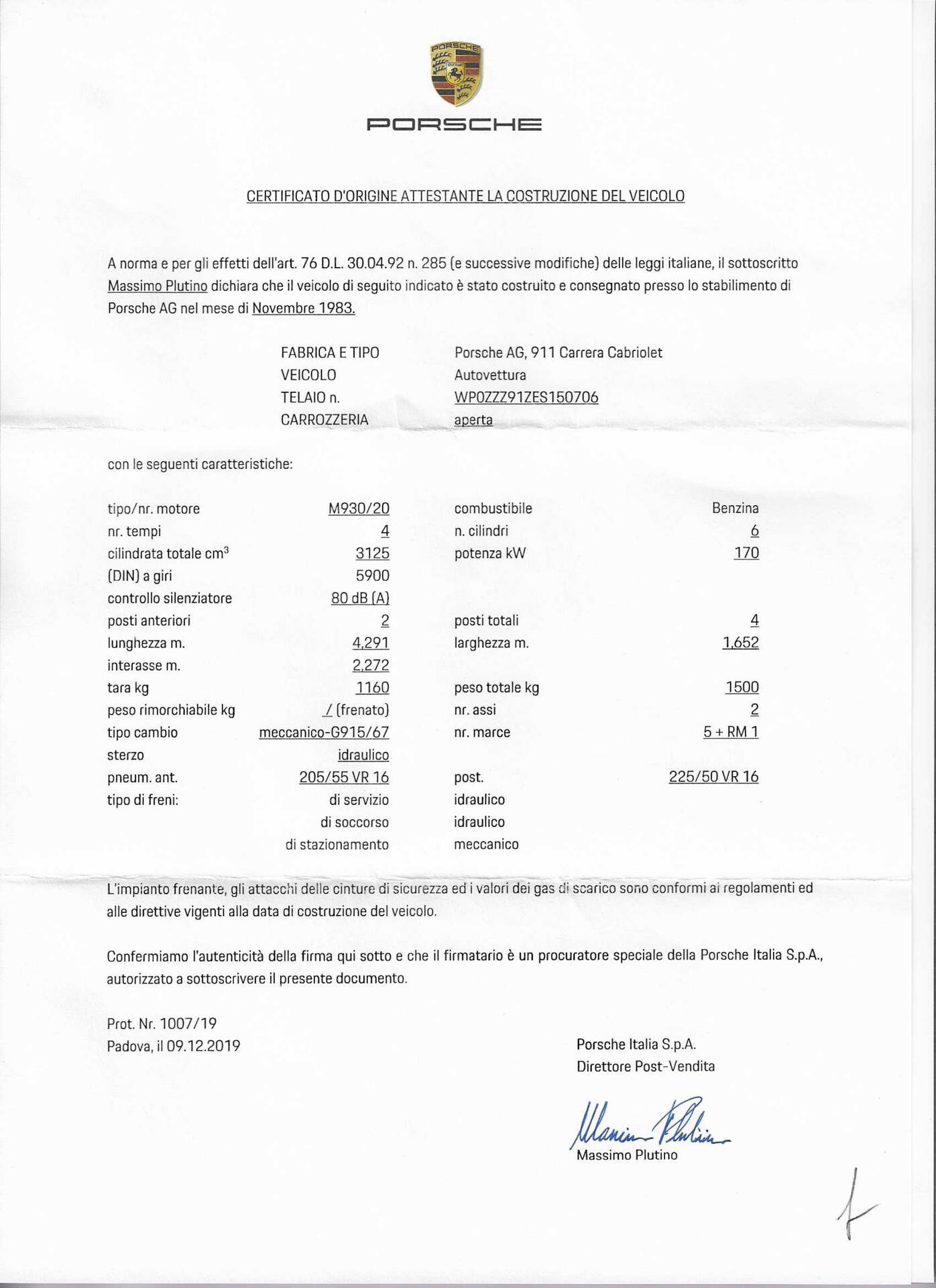 In 2019, Porsche issued the Certificate of Origin, confirming the original color combination, matching serial numbers, and factory specifications.