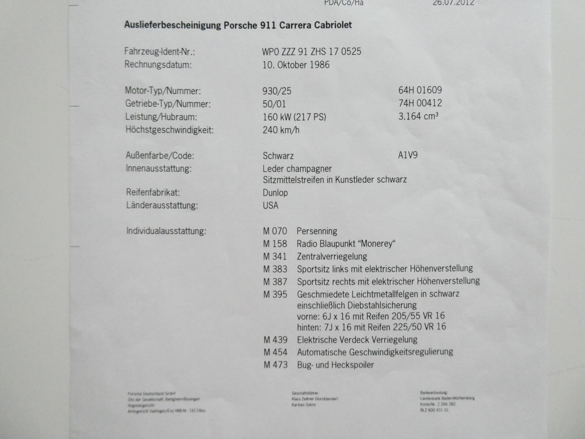 Das Fahrzeug wurde 1987 original in schwarz kombiniert einer champagnerfarbenen Lederausstattung ausgeliefert. Das Cabriolet befindet sich komplett im Erstlack und hat eine rostfreie Karosserie.