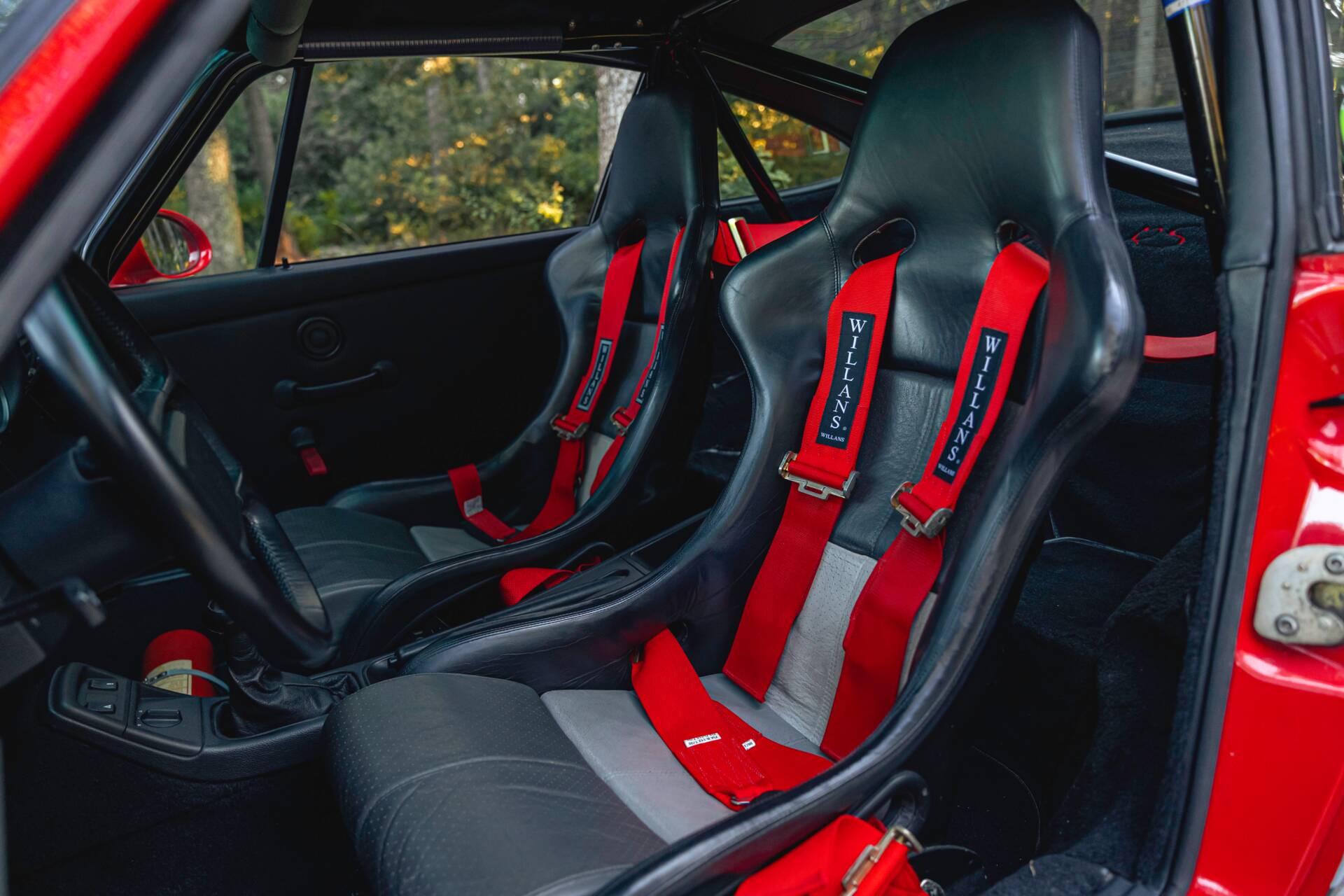 Intérieur : L’habitacle est très bien conservé. Les baquets en cuir “Recaro” sont en excellente condition. Panneaux de portes, ciel de toit, arceau ou encore tableau de bord, tous ces éléments présentent très bien. L’ensemble des instruments de bord est fonctionnel.