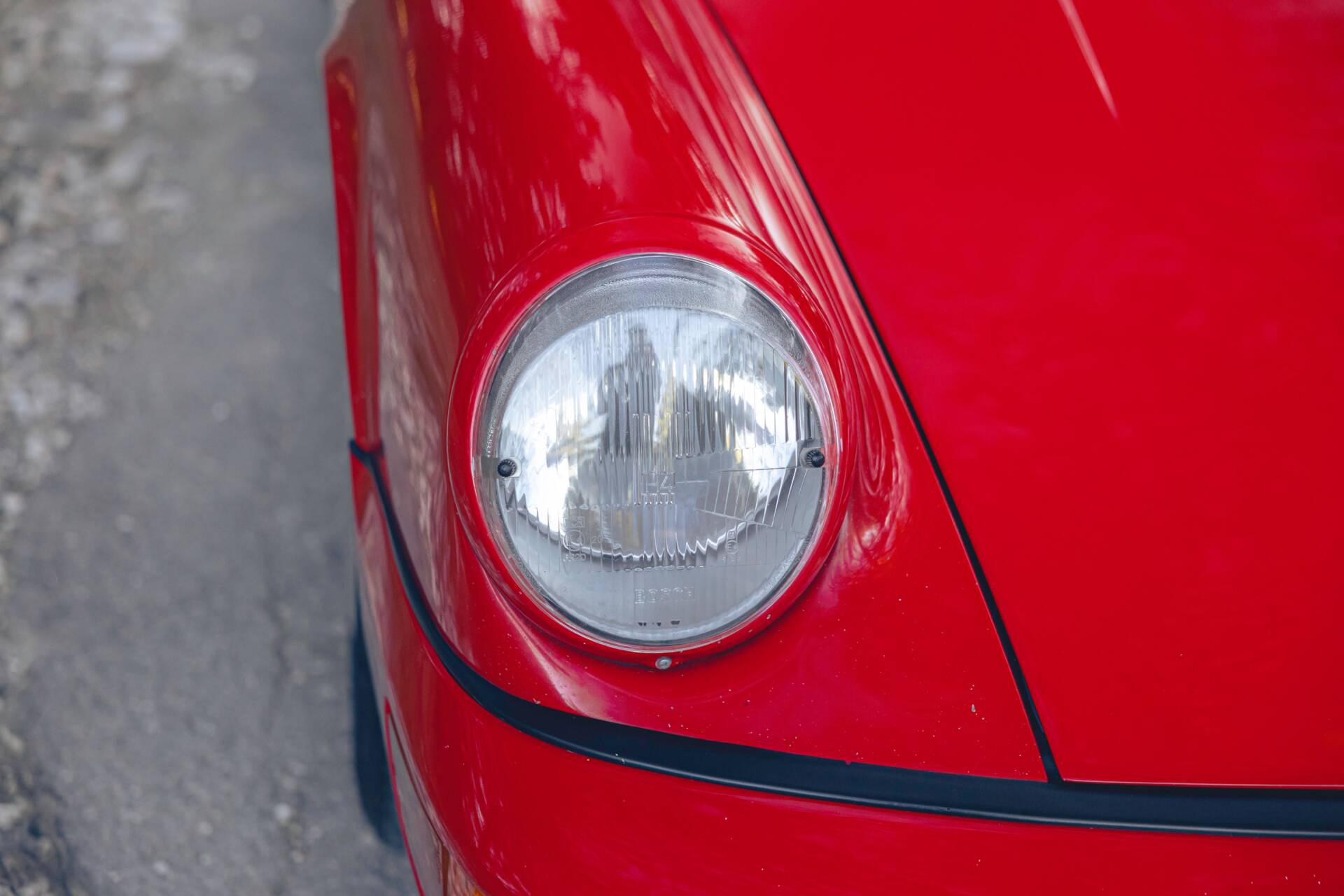 Extérieur : La carrosserie est saine. Elle a déjà été repeinte dans sa teinte d’origine : Rouge Indien. La peinture se présente dans un très bon état général. Nous notons du gravillonnage sur la face avant. L’auto est équipée des coques de phares et de ses jantes STTI en magnésium d’origine. Le vernis des jantes se décolle par endroit et elles présentent quelques marques de frottements.