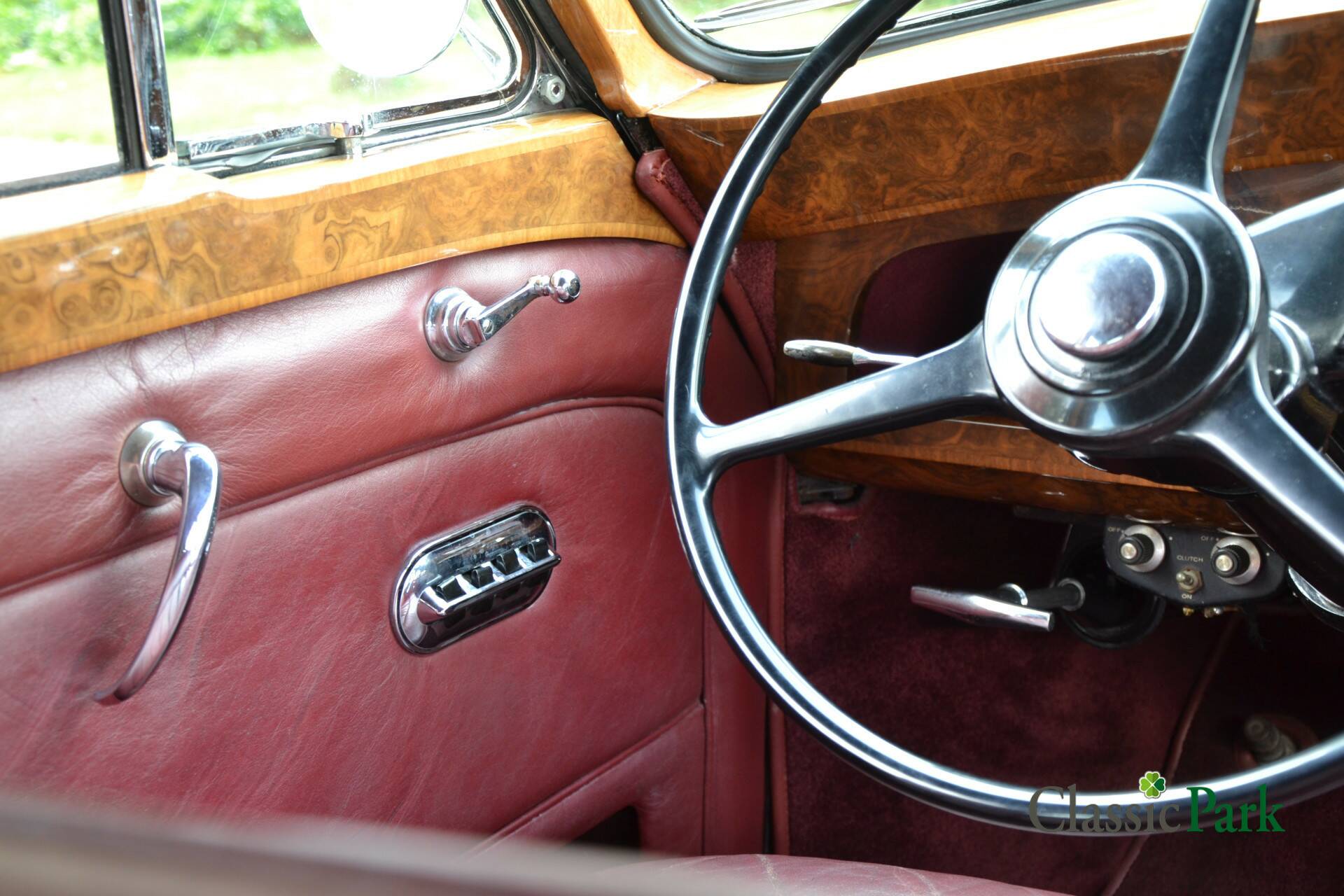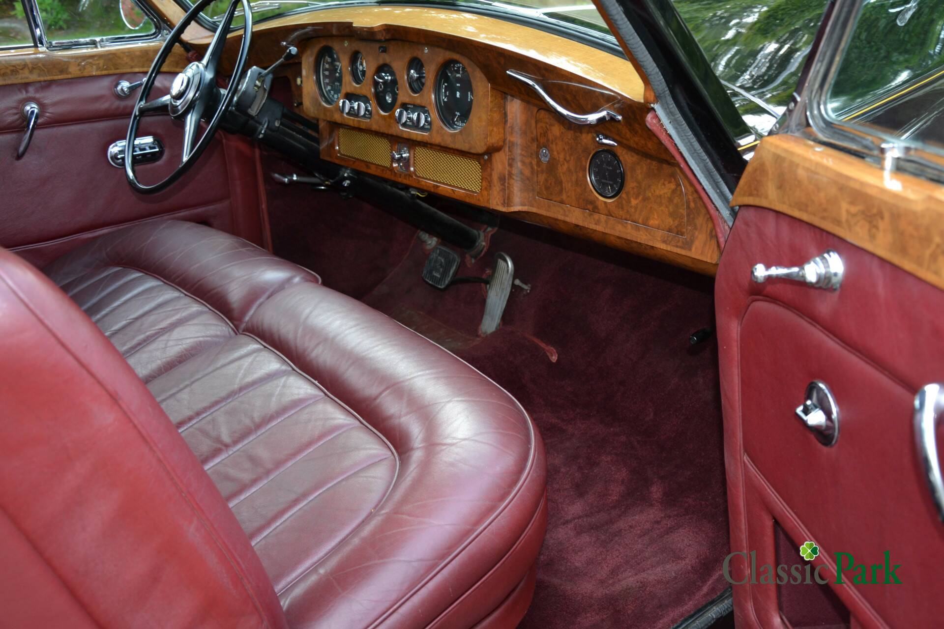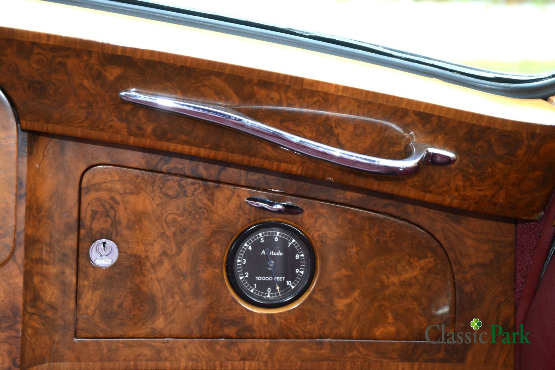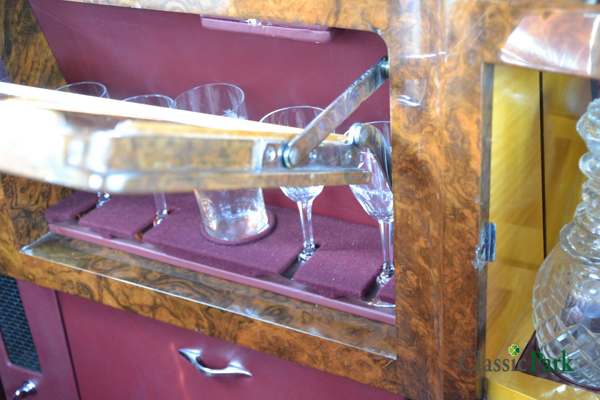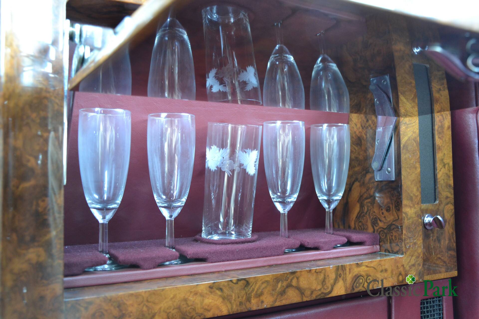 Der Phantom V bei Classic Park ist genau so ein gesuchter PV22 von James Young. Das Fahrzeug präsentiert sich in einer majestätischen Zweifarbenlackierung in Schwarz und Dunkelrot („Maroon“) und verfügt über ein passend rotes Lederinterieur. Zwischen den Vordersitzen und dem Fond ist eine Trennwand („Division“) eingebaut, die mit einer Vielzahl von Accessoires und Funktionen ausgestattet ist.