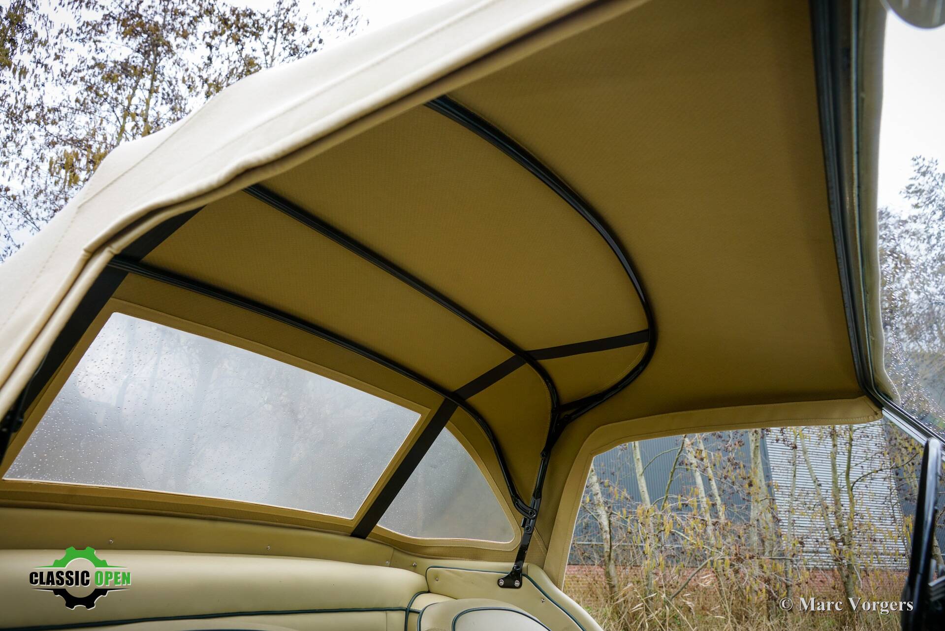 Außenfarbe: British Racing Green, Innenausstattung: beiges Leder mit grünen Paspeln und beigem Teppich. Das Fahrzeug ist mit einem beigen Mohair-Verdeck, Seitenfenster und einer beigen Mohair-Persenning ausgestattet.