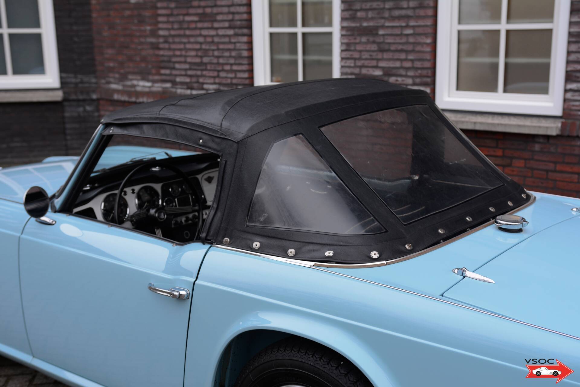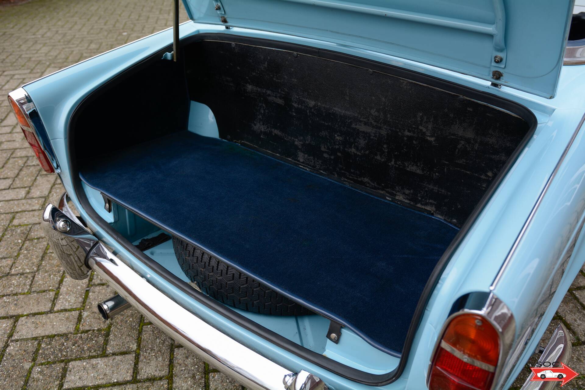 According to its British Motor Industry Heritage Trust Certificate, the car retains its matching nr. engine and is presented as ordered new in the colour configuration of 'Powder Blue' with a blue interior. The car was built on the 8th of January in 1963 and was despatched to the Triumph Motor Company dealer in San Francisco, USA. This vehicle was shipped from the Samuel Williams Wharf, Dagenham aboard the vessel 'Karfanger'.