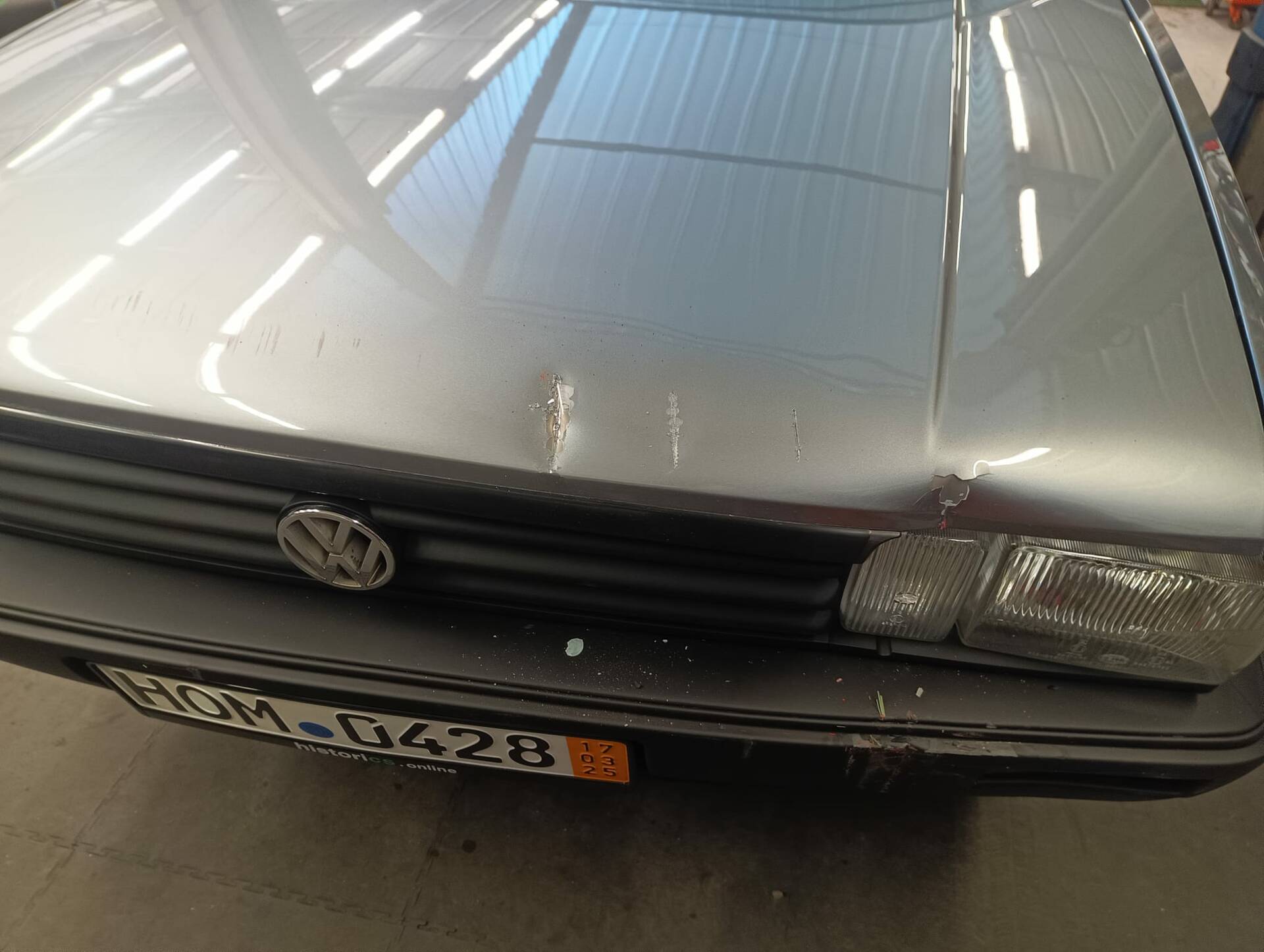 Der Passat kam als Neuwagen in unseren Nachbarort und wurde nur von einem Vorbesitzer genutzt, also die sprichwörtliche 1. Hand ist hier zutreffend. Das Fahrzeug erlitt in unserer Werkstatt einen Anfahrschaden, wobei das Frontblech, die Motorhaube und die Rahmenspitze beschädigt wurde. Das Fahrzeug wurde ordnungsgemäß instandgesetzt.